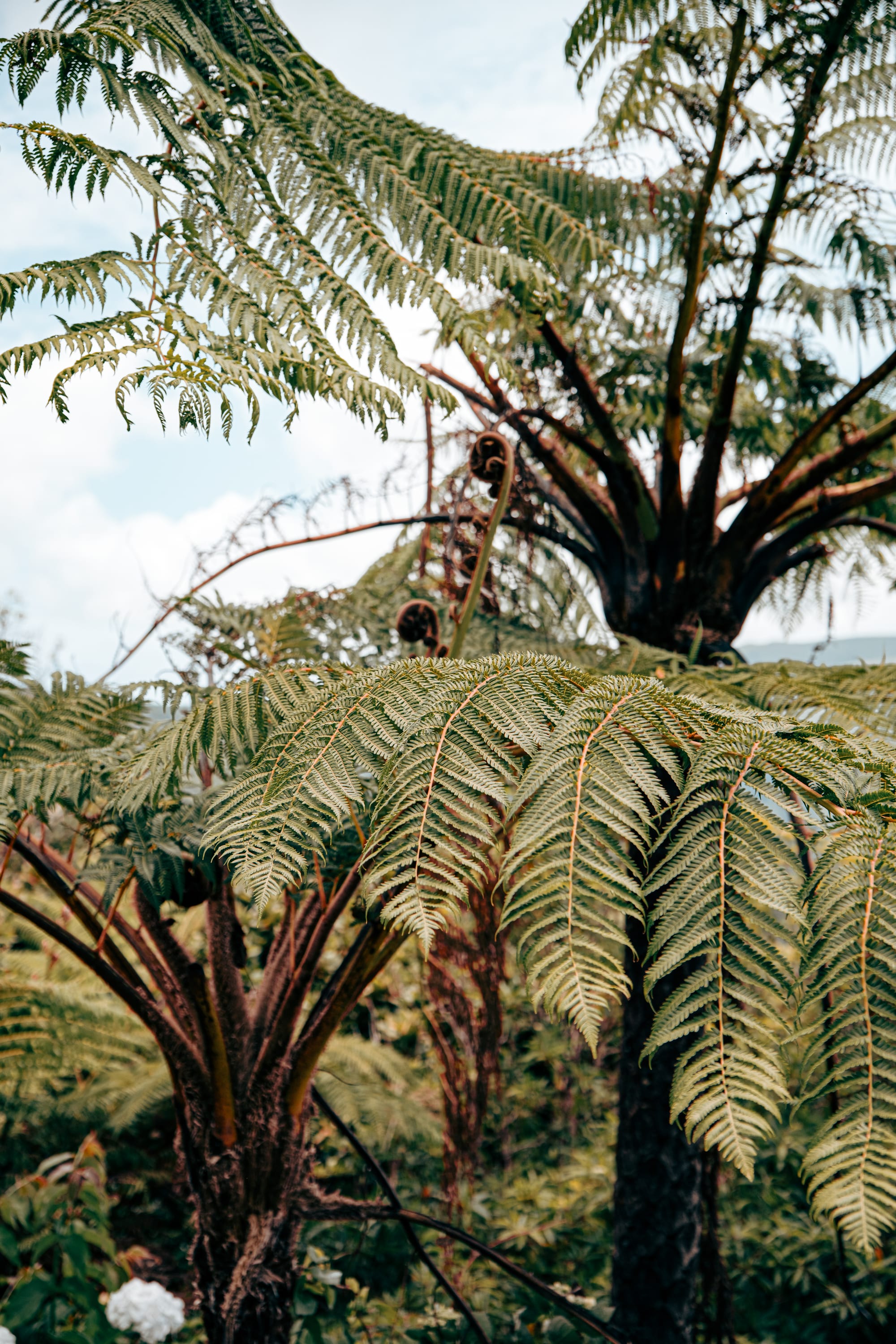 The view from the top is shaped by layers. At the highest level, thick ferns stretch overhead like umbrellas, and you can glimpse tall cedars just off the footpath. Below that, a foreground of flowering hydrangeas and thick laurel adds color and scent to the scene. And beyond that, the crater basin opens up: soft, green hills rolling into one another, steam rising from the caldeiras near the lake’s edge, the village of Furnas nestled in between.