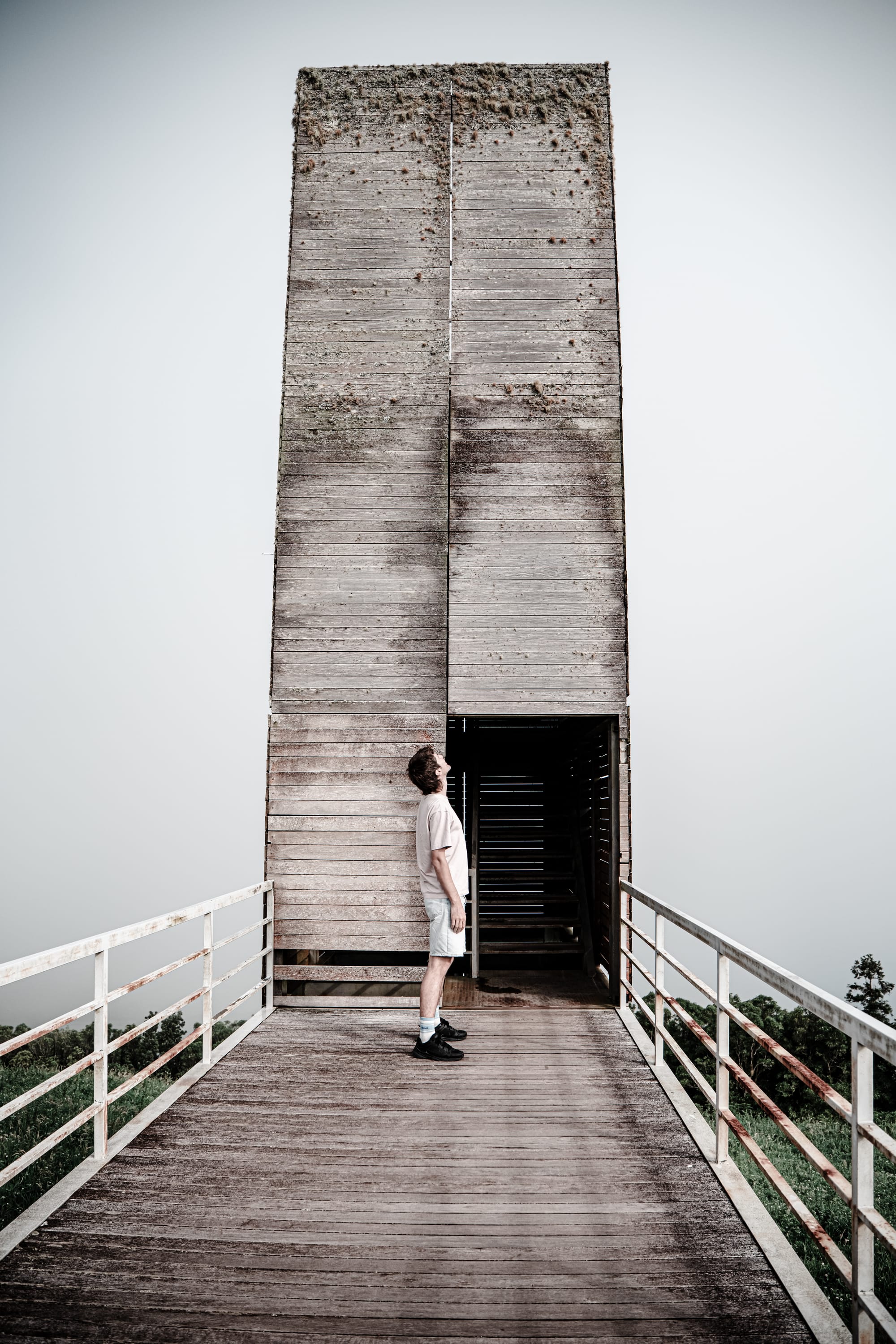 On the day we visited, the whole structure was shrouded in fog. That kind of cinematic mist São Miguel is known for—rolling across the hills, lifting slightly at the coast, catching the light at the corners. We stood inside the frame of the tower, looking through a rectangular window cut into the concrete, and everything in view felt quiet and scaled down. There’s a sense of being suspended—between land and cloud, between design and erosion.