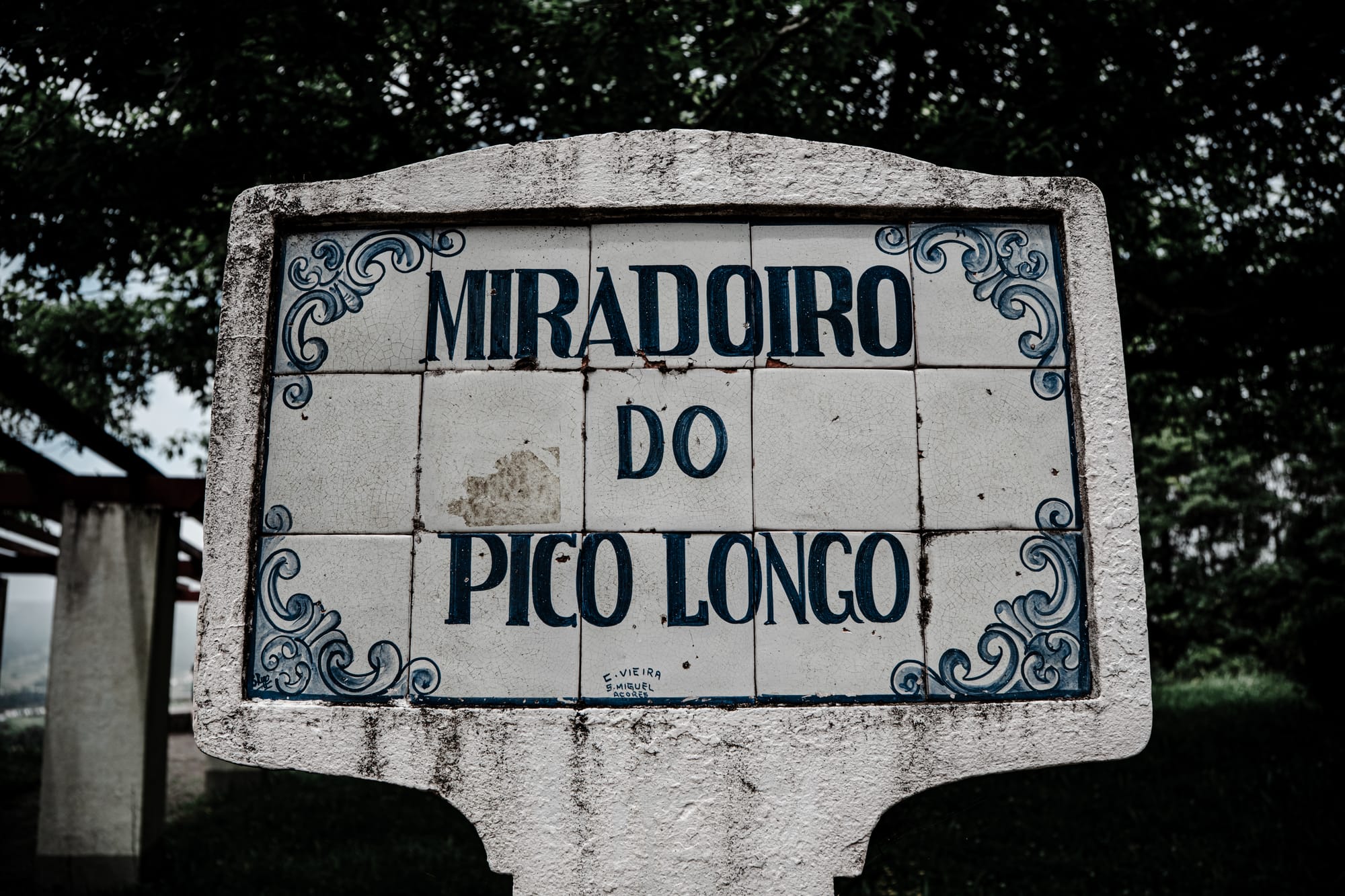Cloud-veiled expanse from Miradouro do Pico Longo, with a name etched in azulejo tile