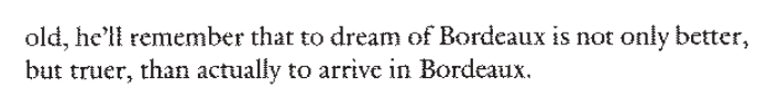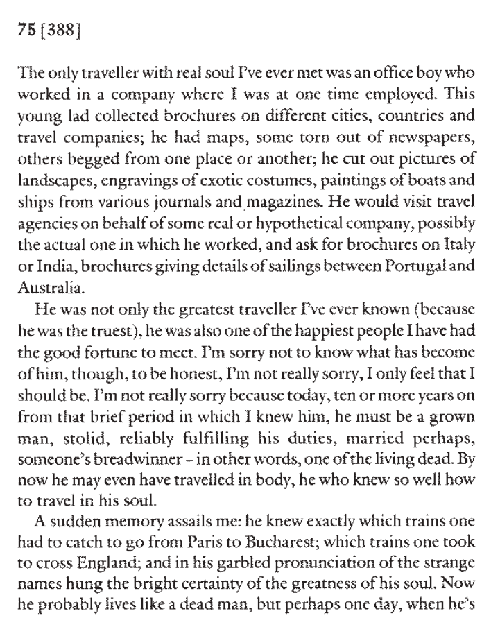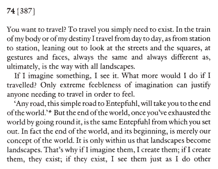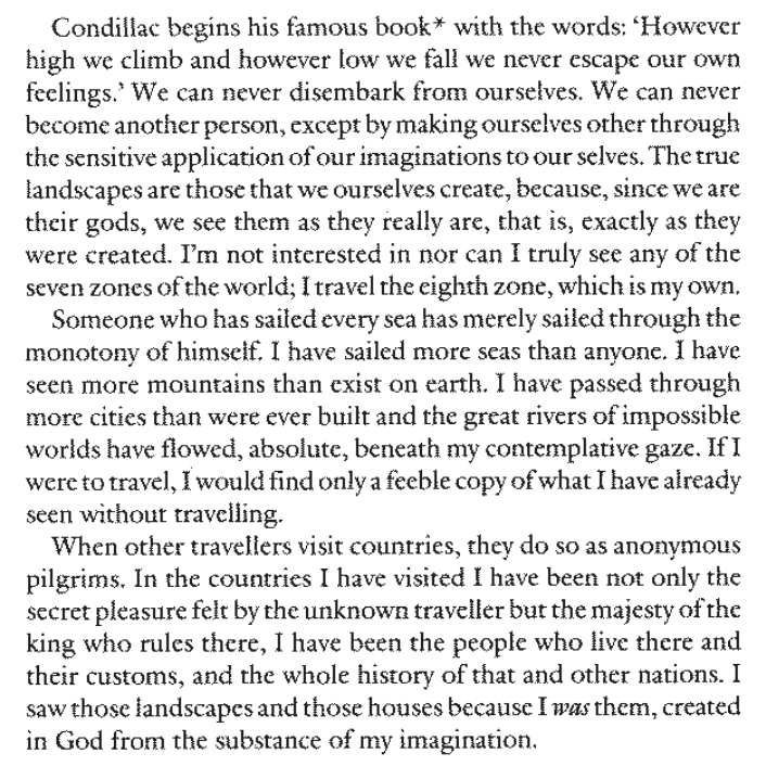 "Someone who has sailed every sea has merely sailed through the monotony of himself. I have sailed more seas than anyone. I have seen more mountains than exist on earth. I have passed through more cities than were ever built and the great rivers of impossible worlds have flowed, absolute, beneath my contemplative gaze. If I were to travel, I would find only a feeble copy of what I have already seen without traveling."