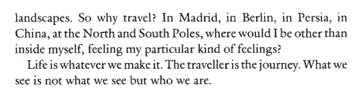 "In Madrid, in Berlin, in Persia, in China, at the North and South Poles, where would I be other than inside myself, feeling my particular kind of feelings?"