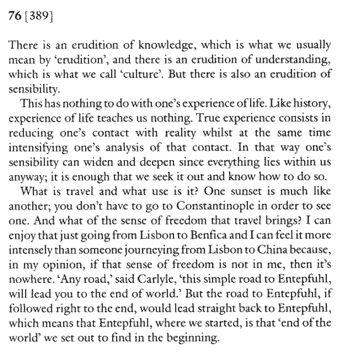 "True experience consists in reducing one's contact with reality whilst at the same time intensifying one's analysis of that contact... What is travel and what use is it? One sunset is much like another; you don't have to go to Constantinople in order to see one. And what of the sense of freedom that travel brings? I can enjoy that just going from Lisbon to Benfica and I can feel it more intensely than someone journeying from Lisbon to China because, in my opinion, if that sense of freedom is not in me, then it's nowhere."