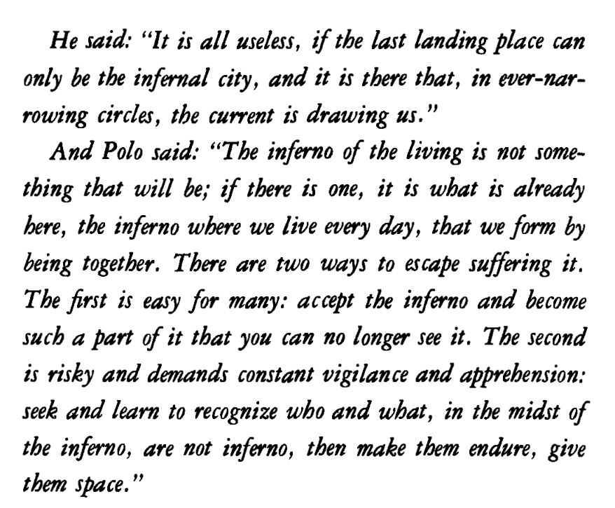 [Kublai Khan] said: "It is all useless, if the last landing place can only be the infernal city, and it is there that, in ever-narrowing circles, the current is drawing us."