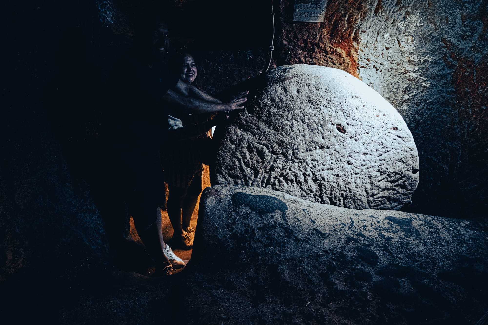 Massive stone doors once used to seal passages and protect inhabitants in Özkonak Underground City