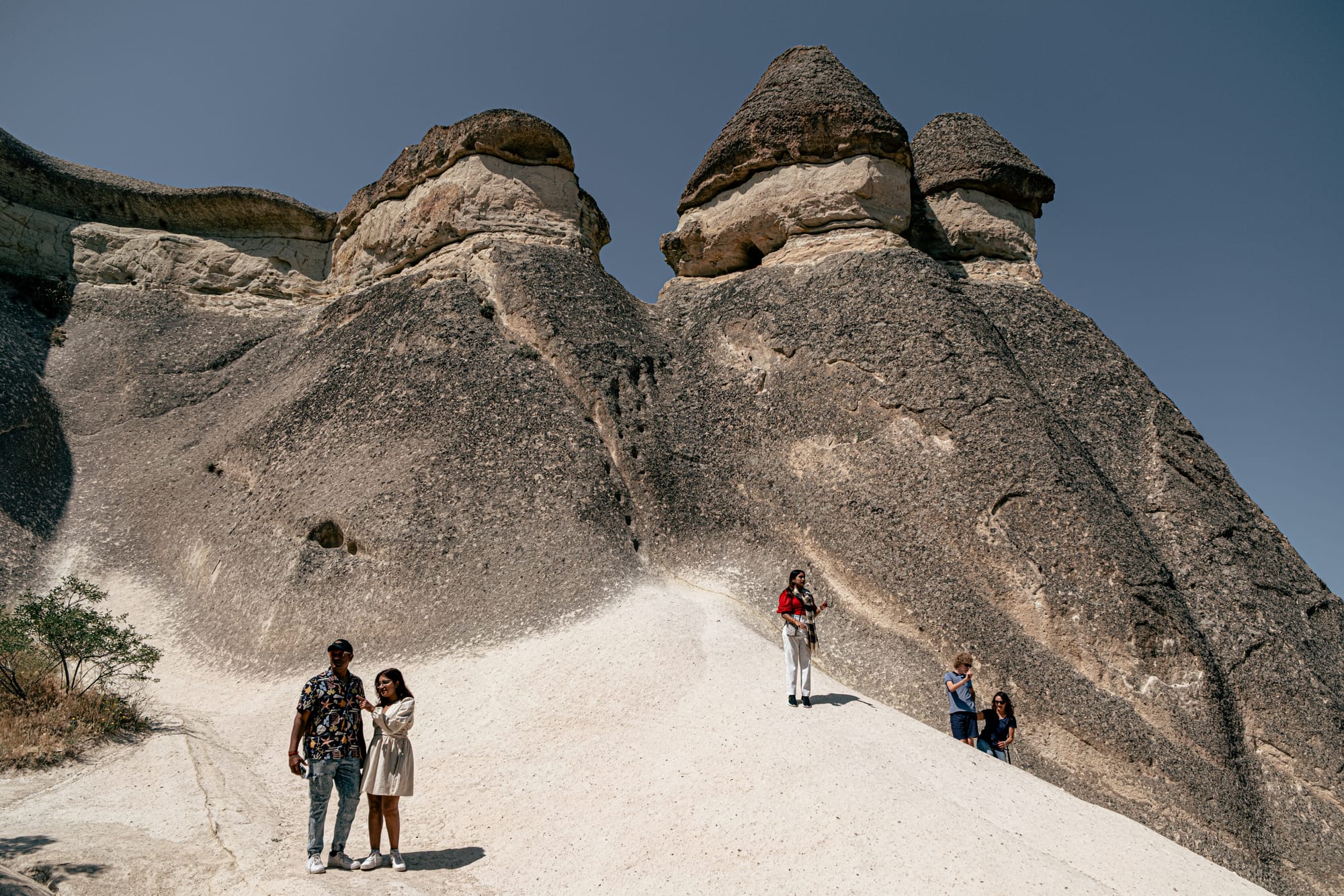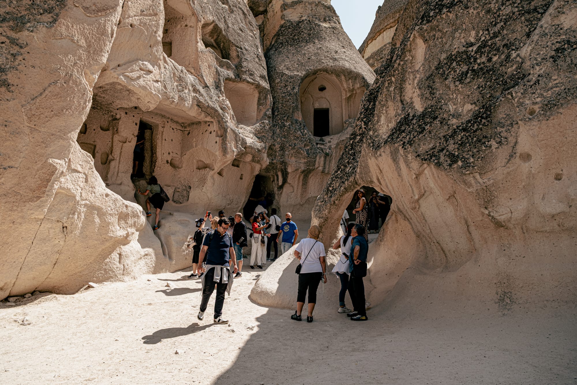 Visitors exploring the rock-carved chapels and dwellings of Paşabağ (Monks Valley) in Cappadocia