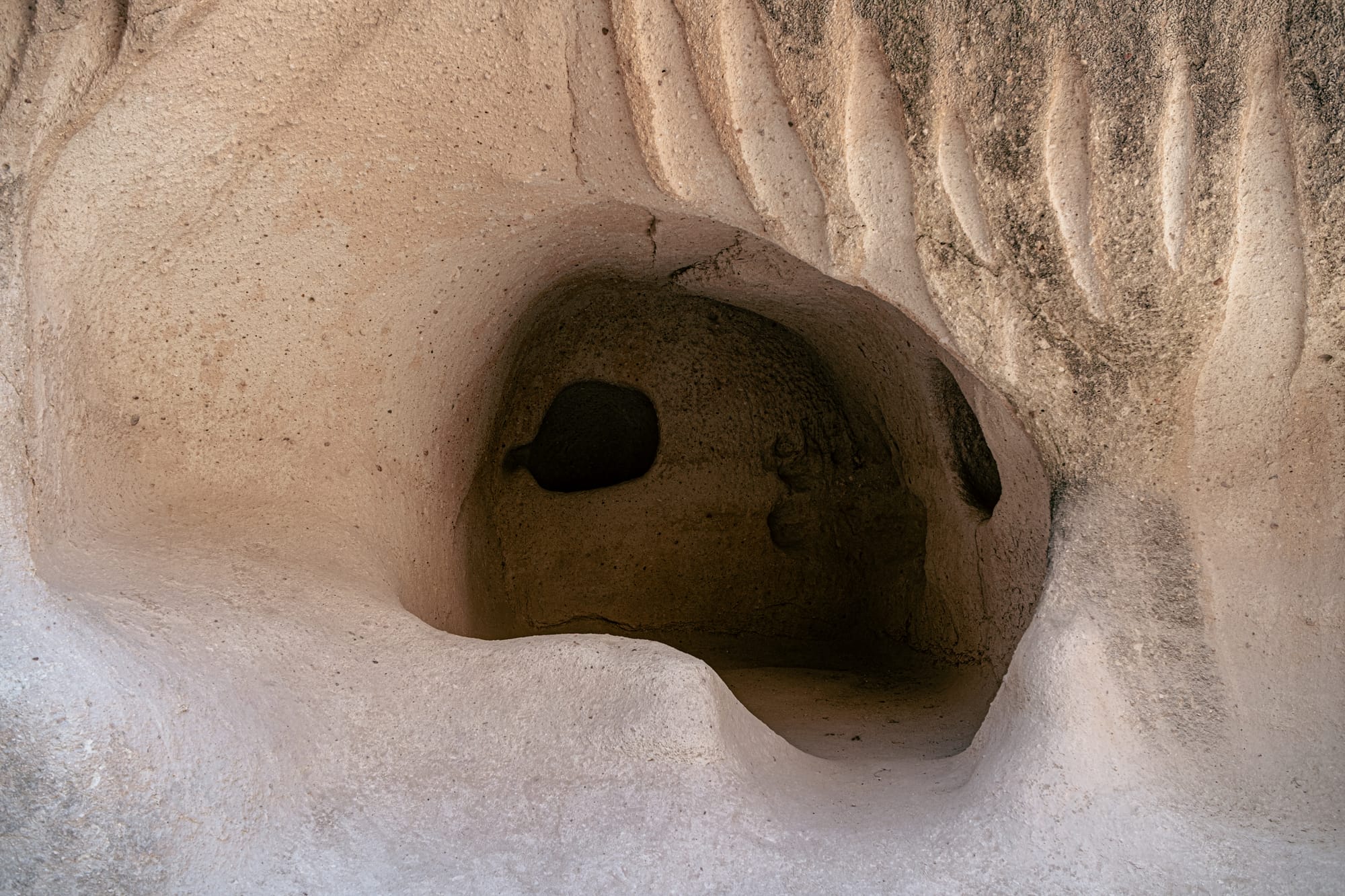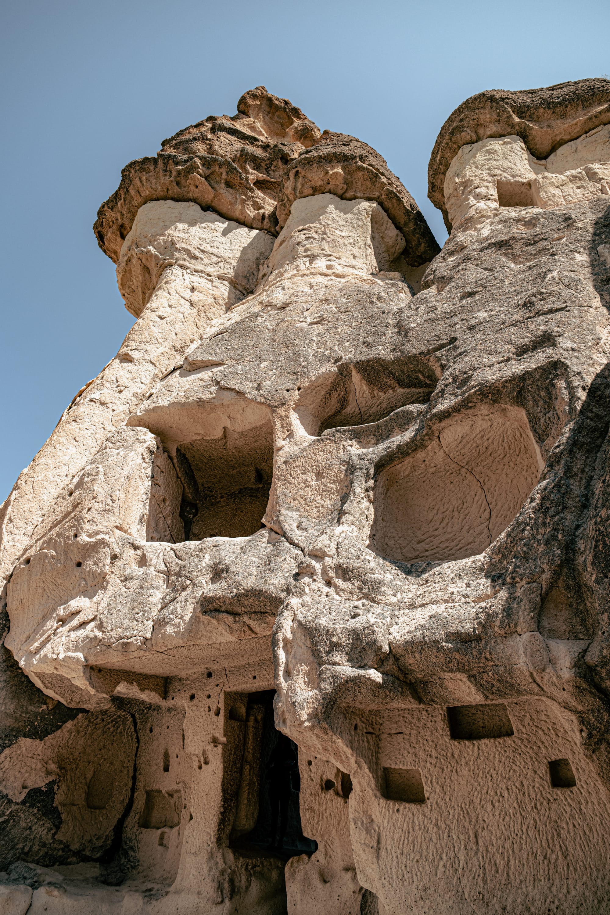 Exploring Paşabağ is a feast for the senses. Mushroom-shaped formations rise in clusters, some standing alone in the open plain and others packed closely together. Rock-carved dwellings and chapels feature arched entrances, interior chambers, and small windows cut into the stone. The surfaces range from smooth, wind-polished planes to rough, pitted areas that reveal volcanic layers.