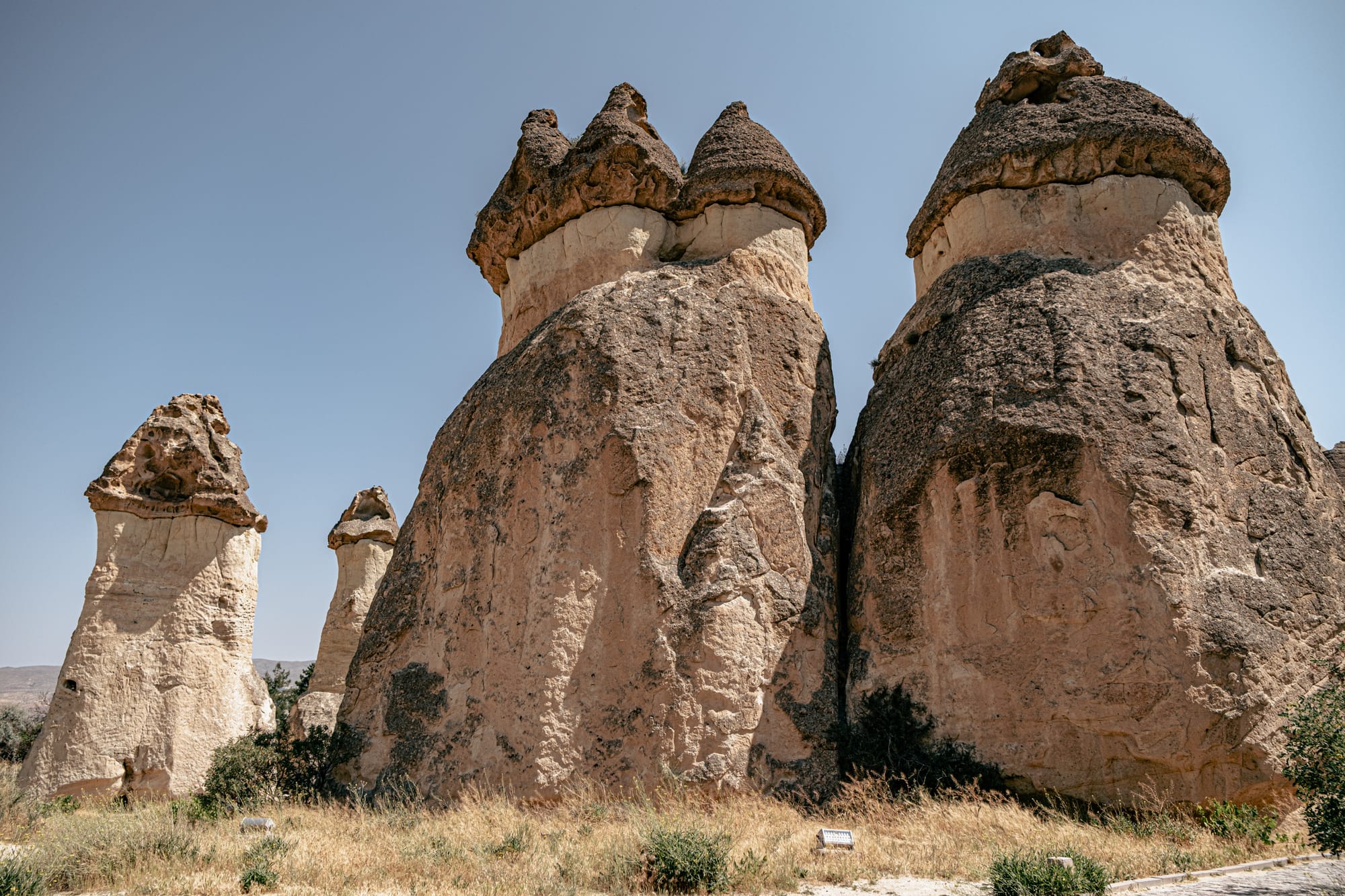 Paşabağ Valley is famed for its fairy chimneys—tall, naturally formed rock spires topped with large, rounded caps that give them their characteristic "mushroom" appearance. The rock formations here are especially striking due to their size and the sheer number clustered together. Over thousands of years, wind and rain sculpted the volcanic tuff into these surreal shapes, while the harder basalt rock on top protected the softer layers beneath from eroding away.