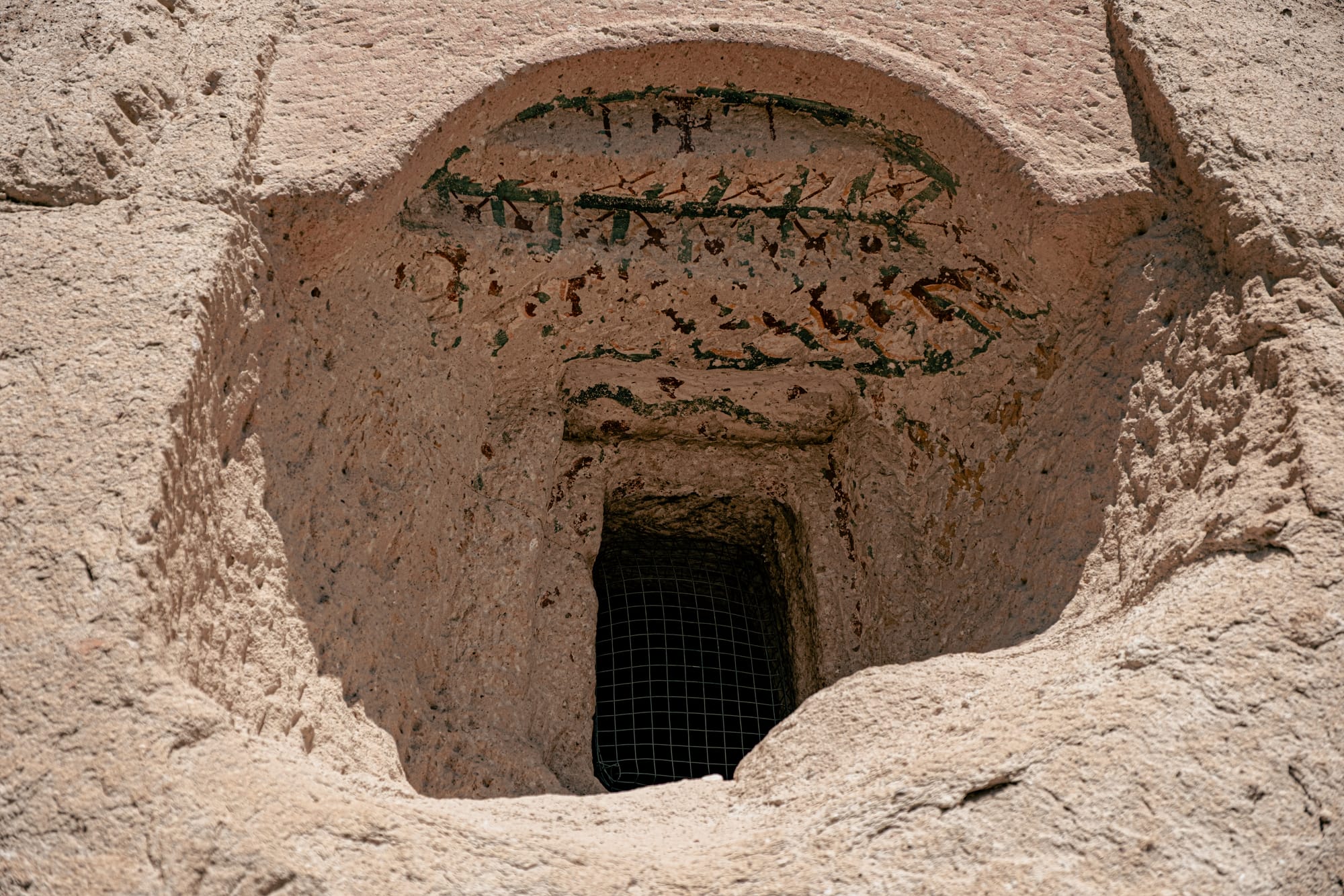 Interior cave space and entrance with faded frescoes in Paşabağ’s rock-carved chapels