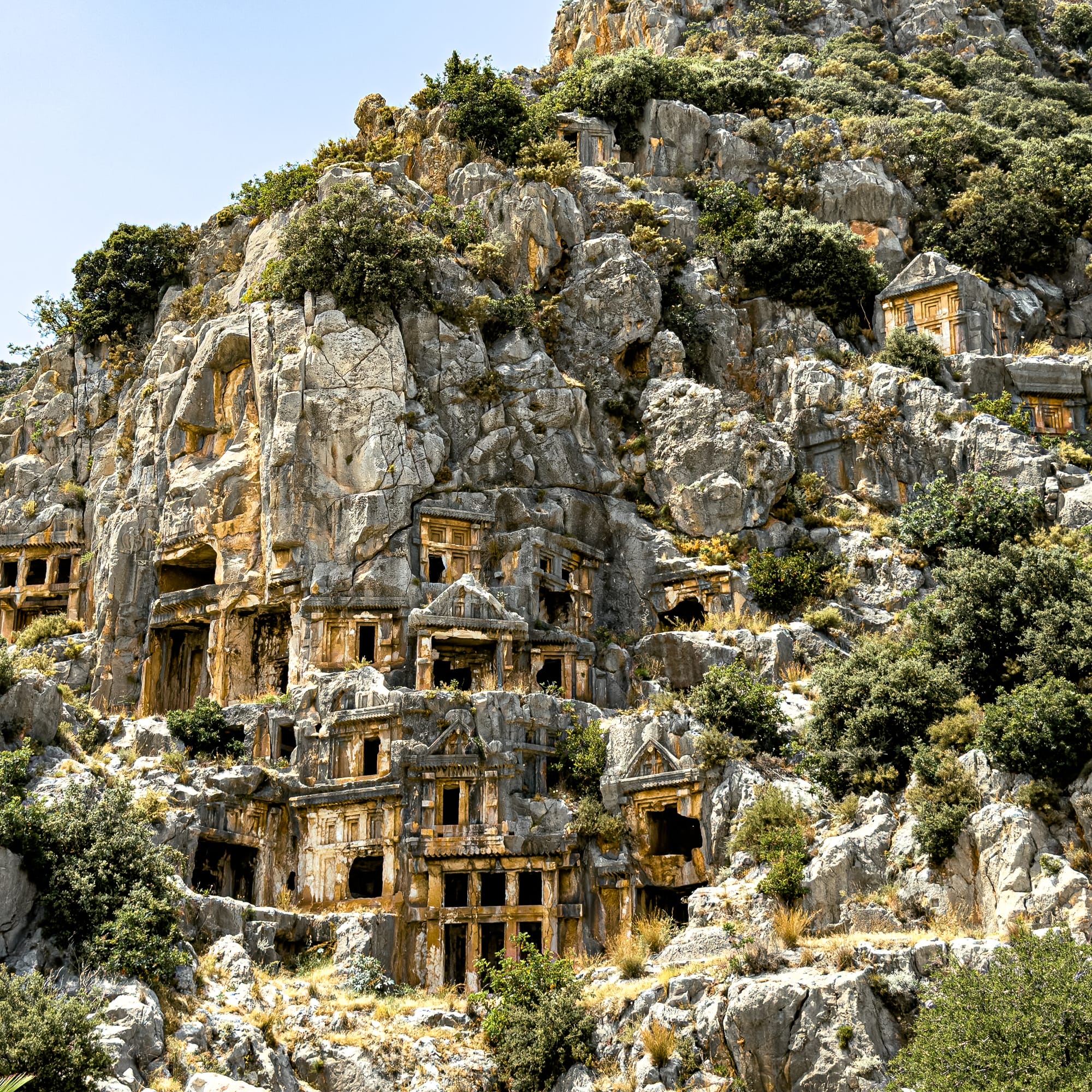 Myra is an ancient Lycian city near Demre, best known for its rock-cut tombs and impressive Roman theater. Carved into the cliffs and remarkably intact, both sites offer a striking glimpse into Lycian and Roman urban life. Read our post.