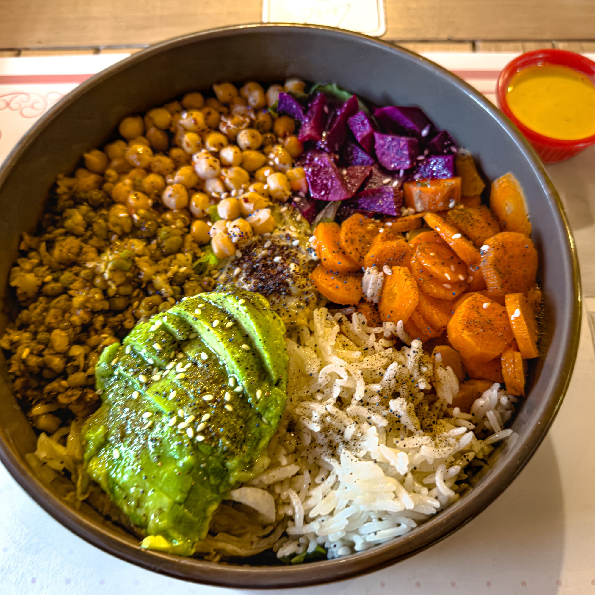 Of the two restaurants delivering to the coworking for lunch, this is the only one with vegan options. The stuffed grape vine leaves are an everyday favorite, but they also have lentil salad, chickpeas, zucchini, eggplant, and bulgur pilaf.