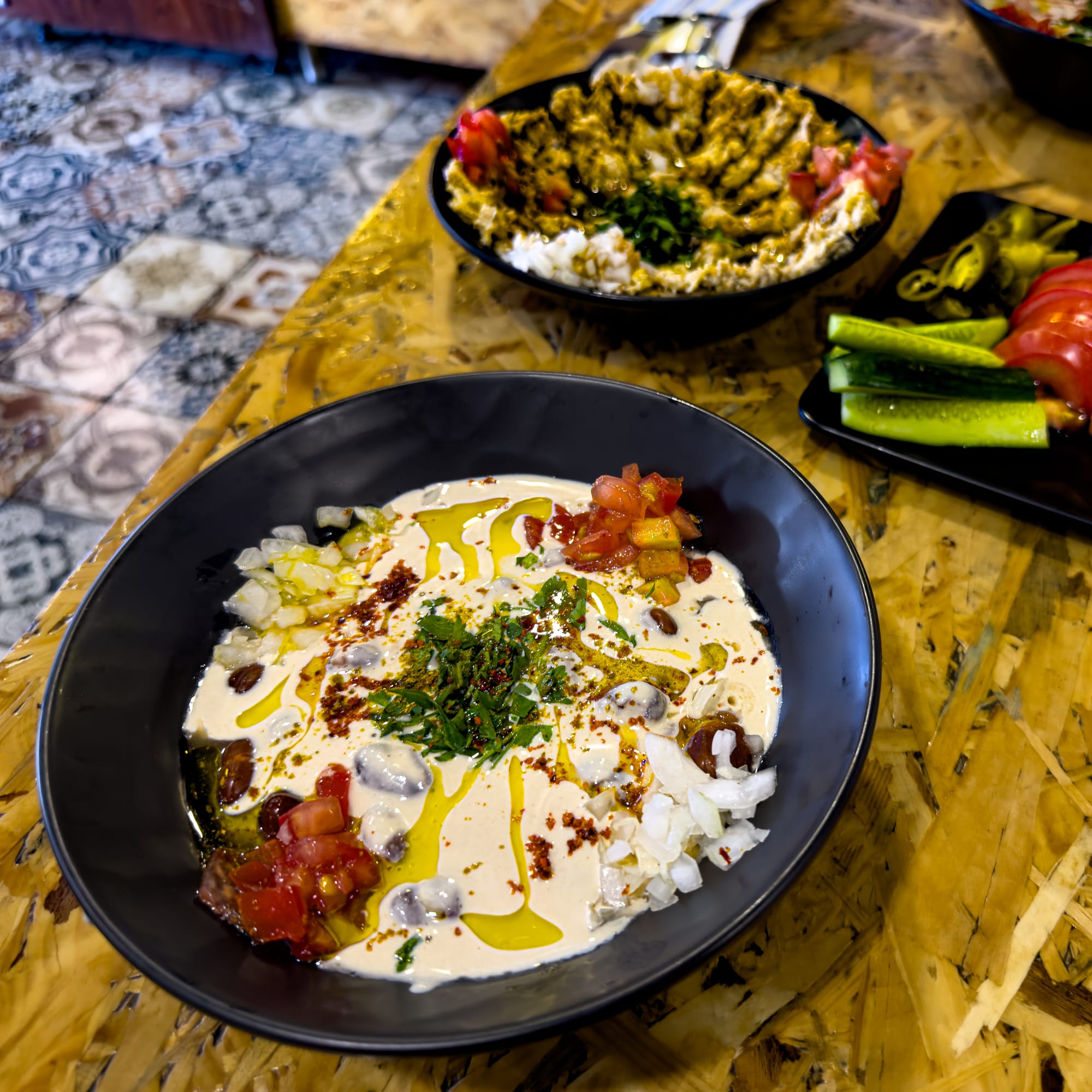 An excellent spot with many labelled vegan options including a falafel eggplant wrap, hummus, baba ghanoush, fava bean salad, and pizza (with vegan cheese).