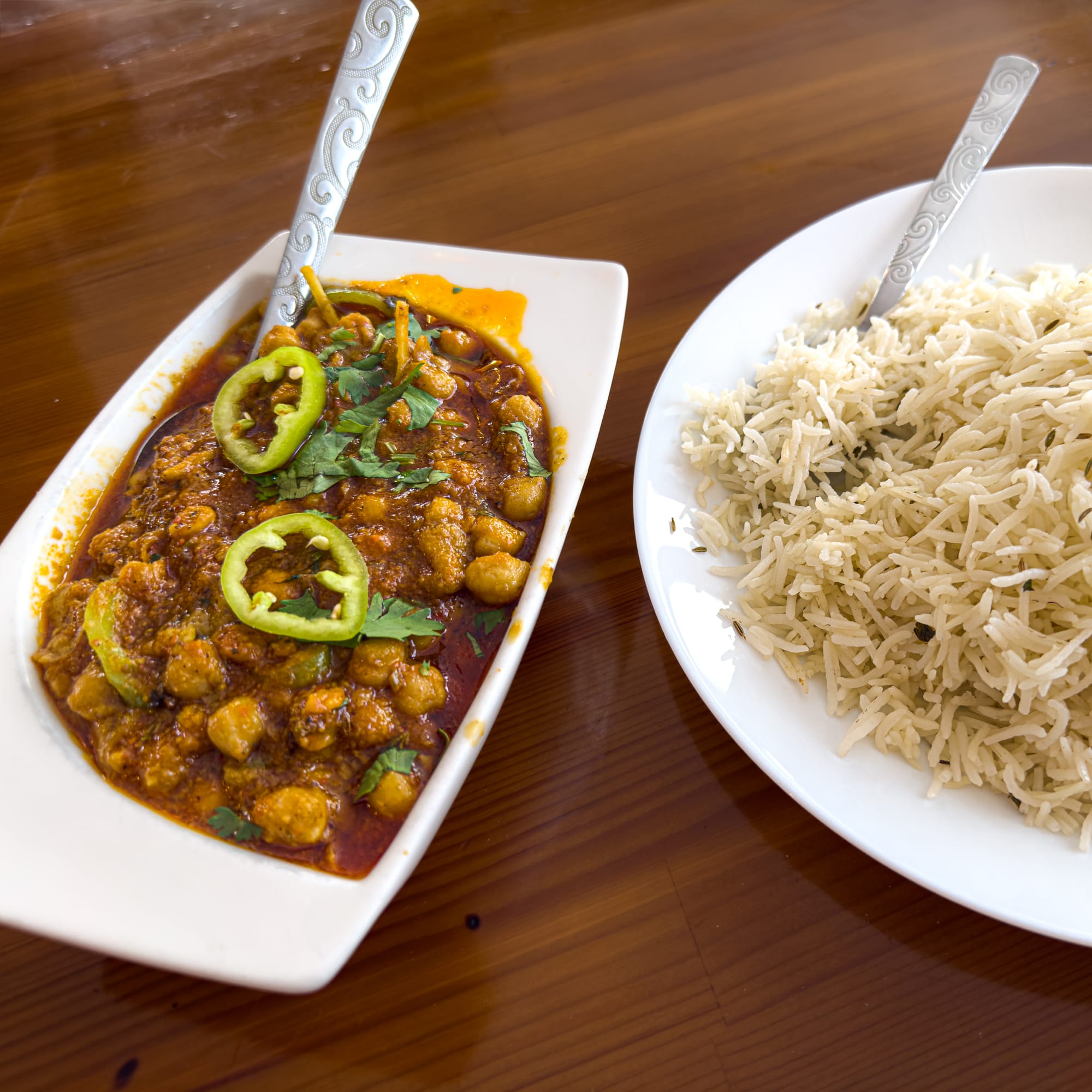 Clearly labelled vegan options, and the owner has a lot of jokes. The chana masala might be the best we've ever had. The spices are pungent and of high quality.