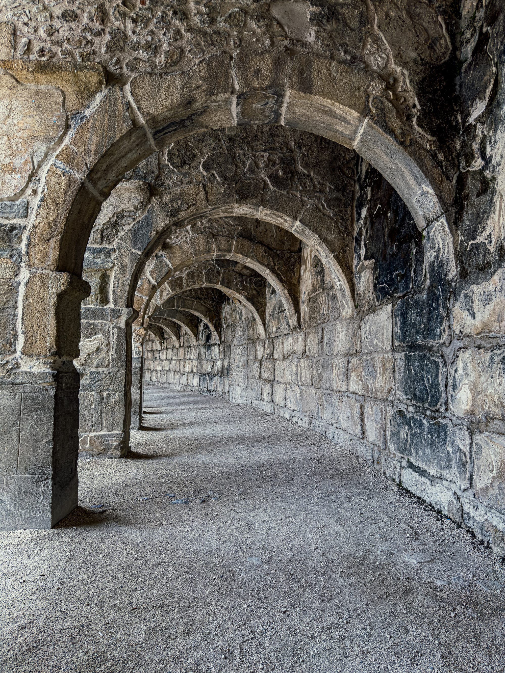 The amphitheater itself takes a while to walk through. We entered through the main gate, where the thick stone walls narrow into vaulted corridors. From there, we climbed the stepped seating, pausing to take in the full sweep of the semicircle. Even with tourists scattered throughout, it felt vast.