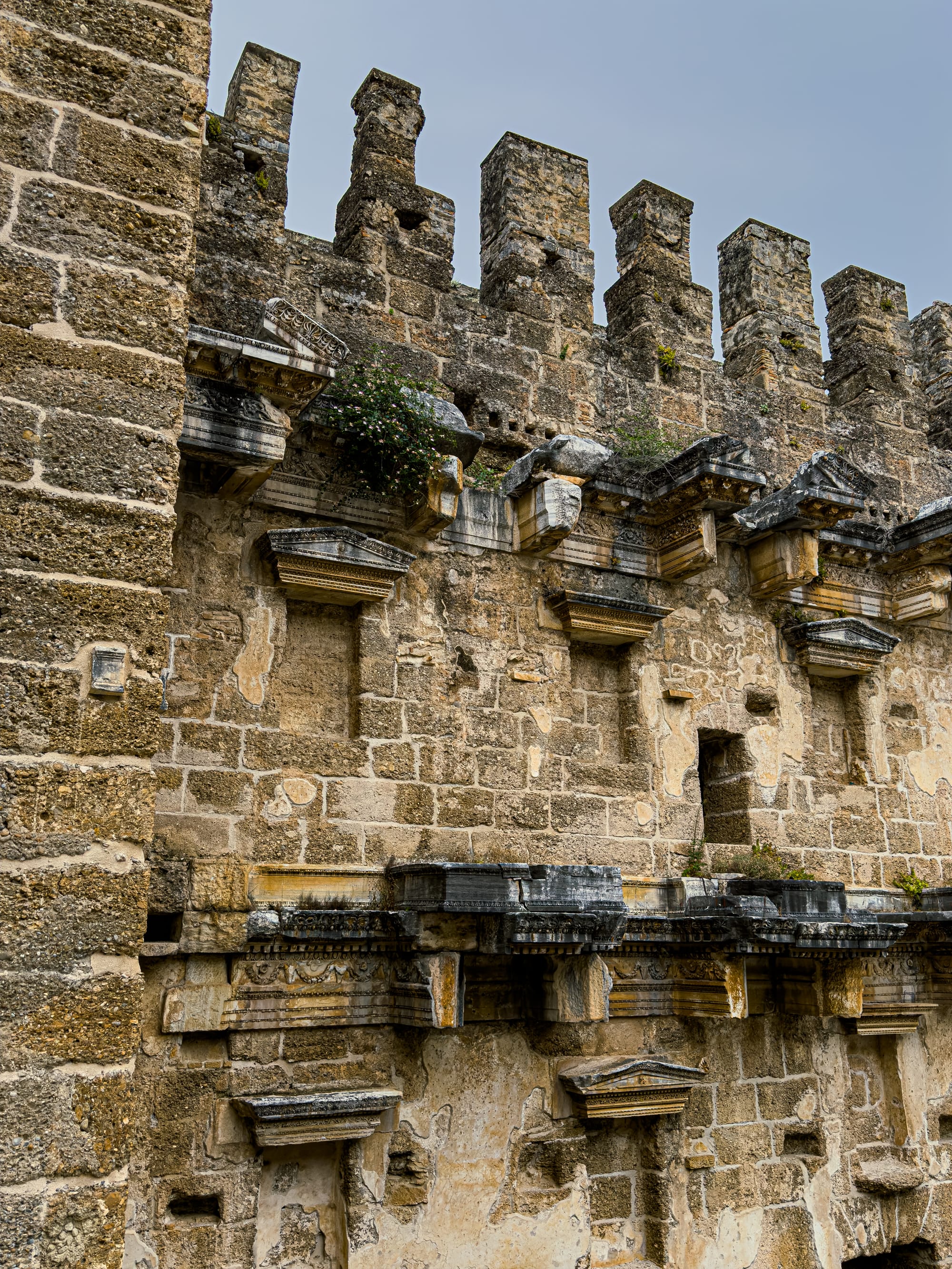 Details from Aspendos’s vast Roman theater—stone seats, fortified walls, and arched corridors