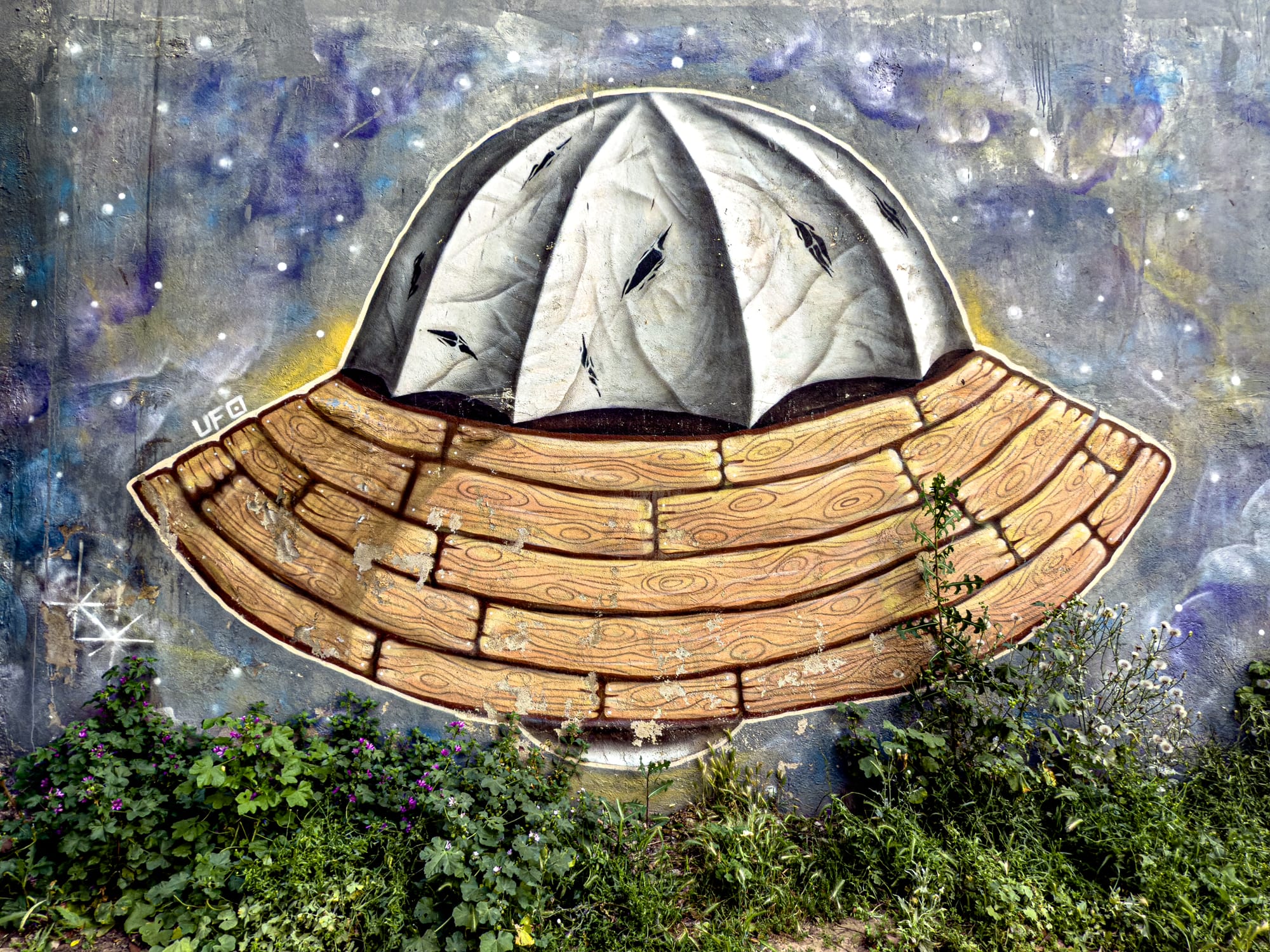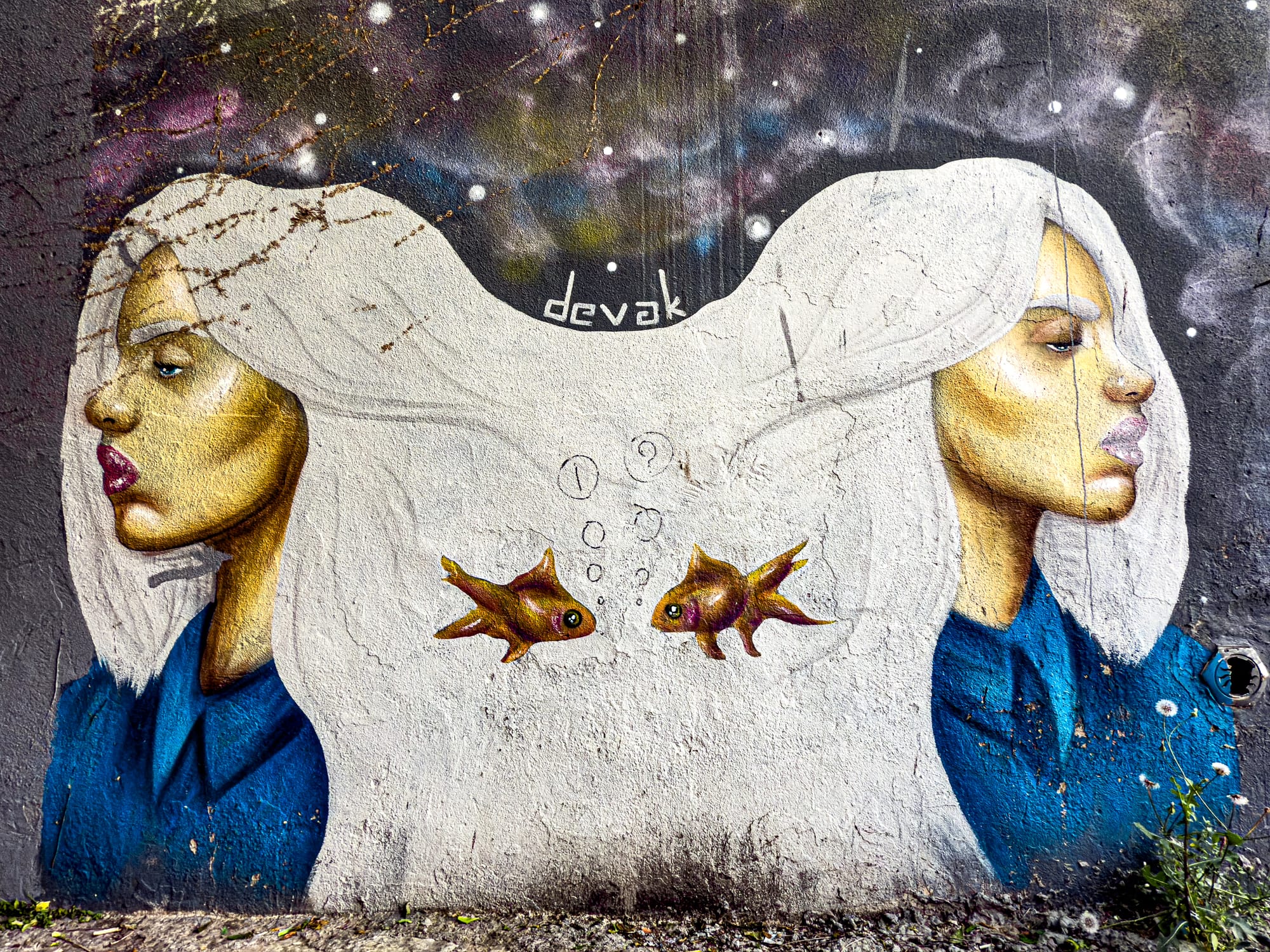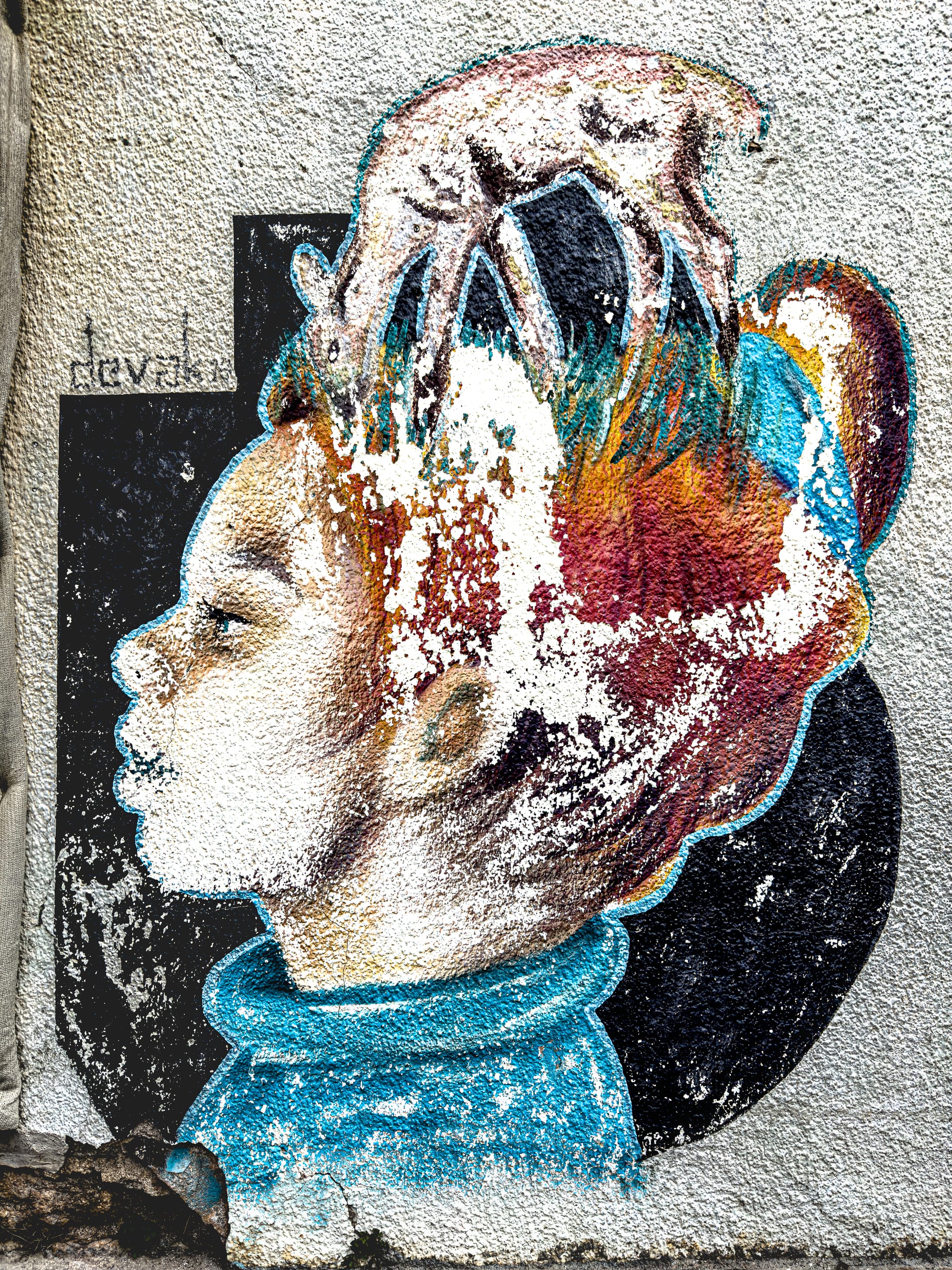 Street art isn’t widespread in Kaleiçi (or Antalya, for that matter), but we found a set of murals by a single artist, signed devak. They tend to be dreamy and cosmological: women with flowing hair, moons, fish, and strange cartographies. A reminder that even within the heritage zone, voices can emerge in spray paint.