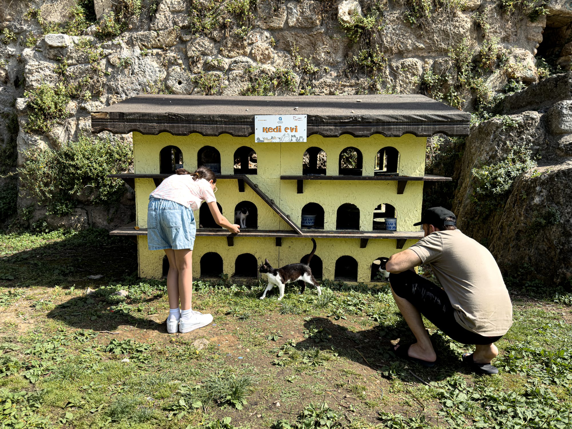 Kaleiçi has its own rhythm, and it's in the details. Cats lounge under potted plants, beside ceramic displays, or on the edges of the ruins. Local volunteers have even created small sanctuaries—wooden shelters, food bowls, and signage to protect and feed the community cats.