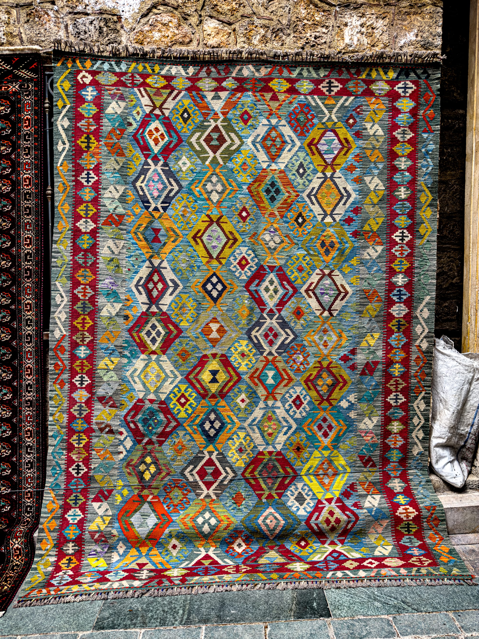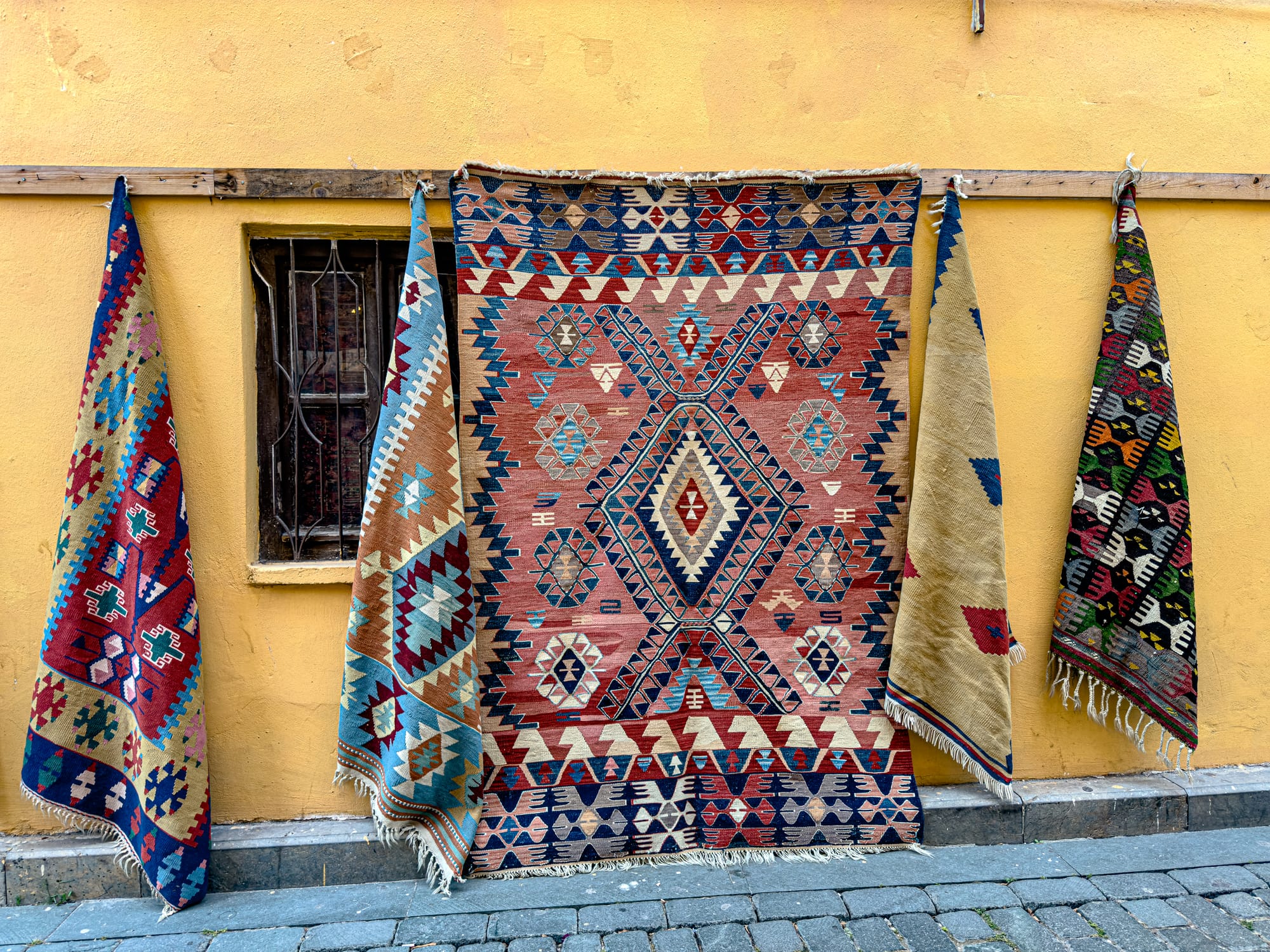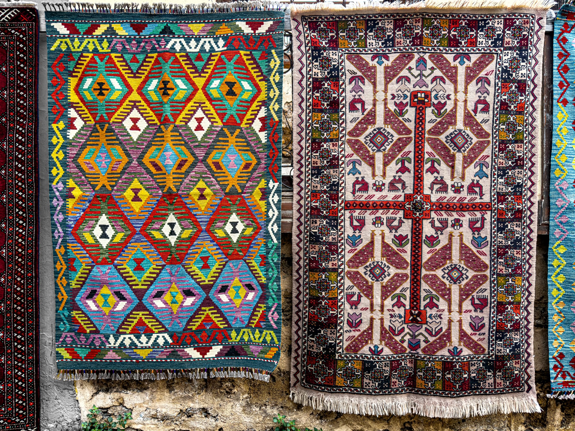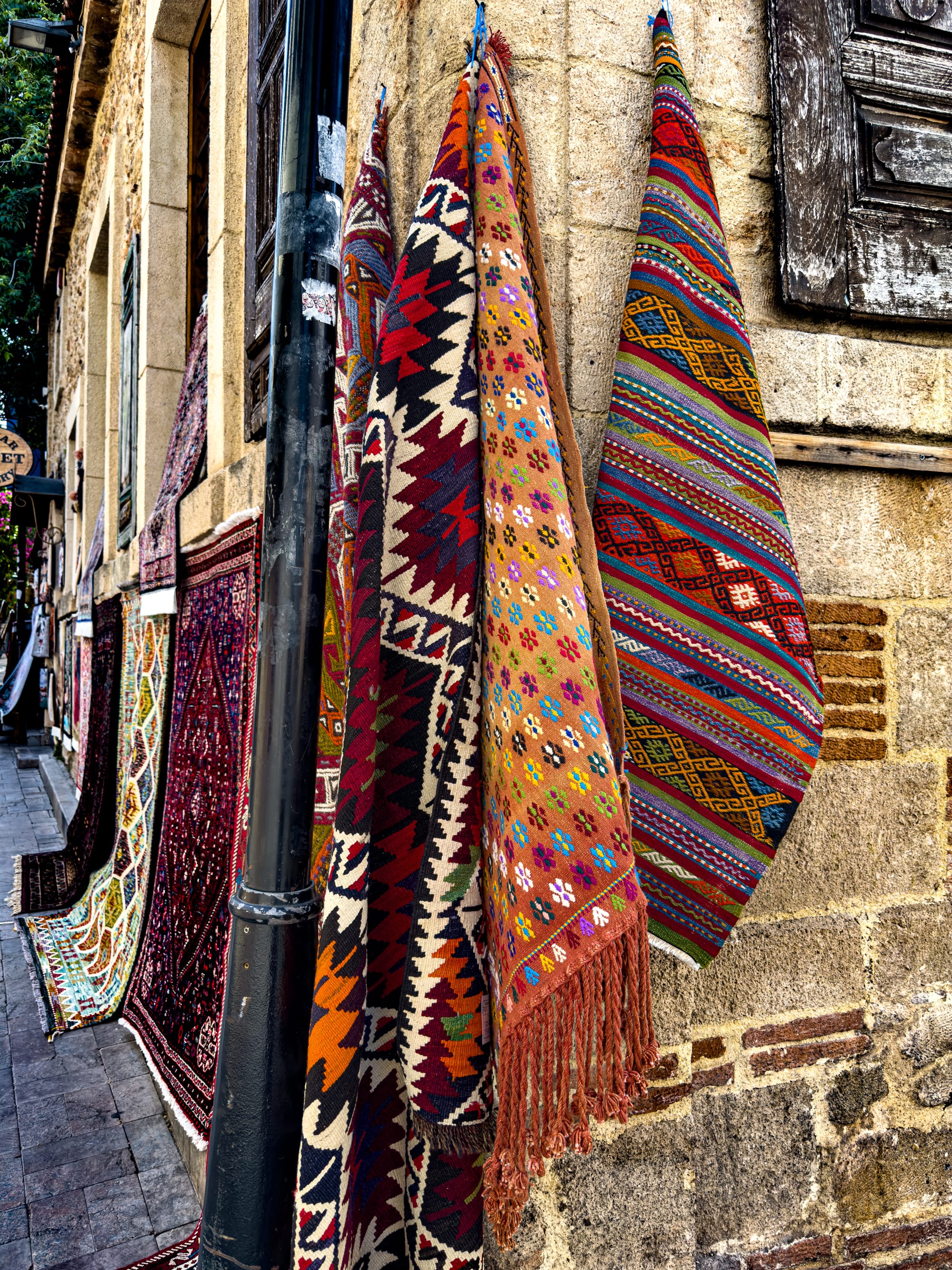 Rugs hang on nearly every vertical surface. There are full-on carpet galleries, of course, but also casual displays: bright kilims draped over balconies, or miniatures laid out on old stone steps.