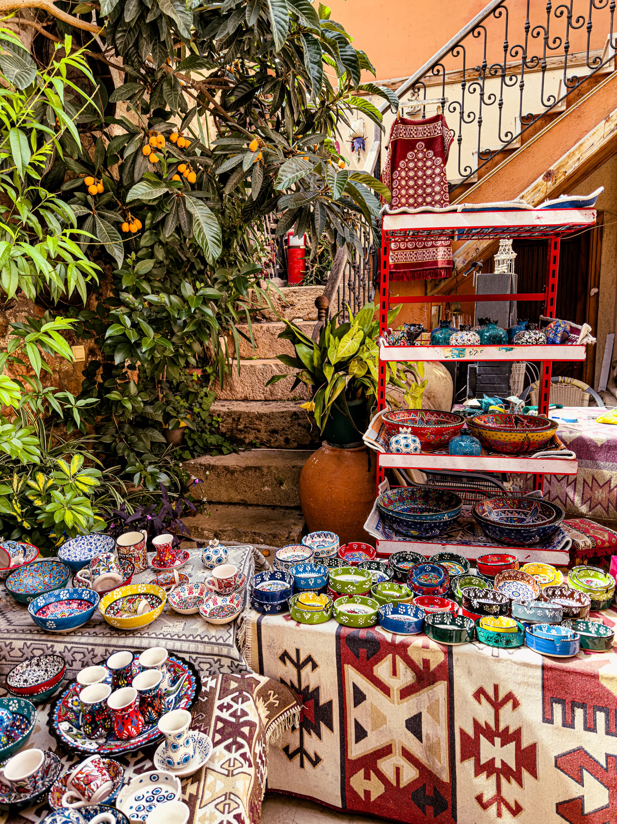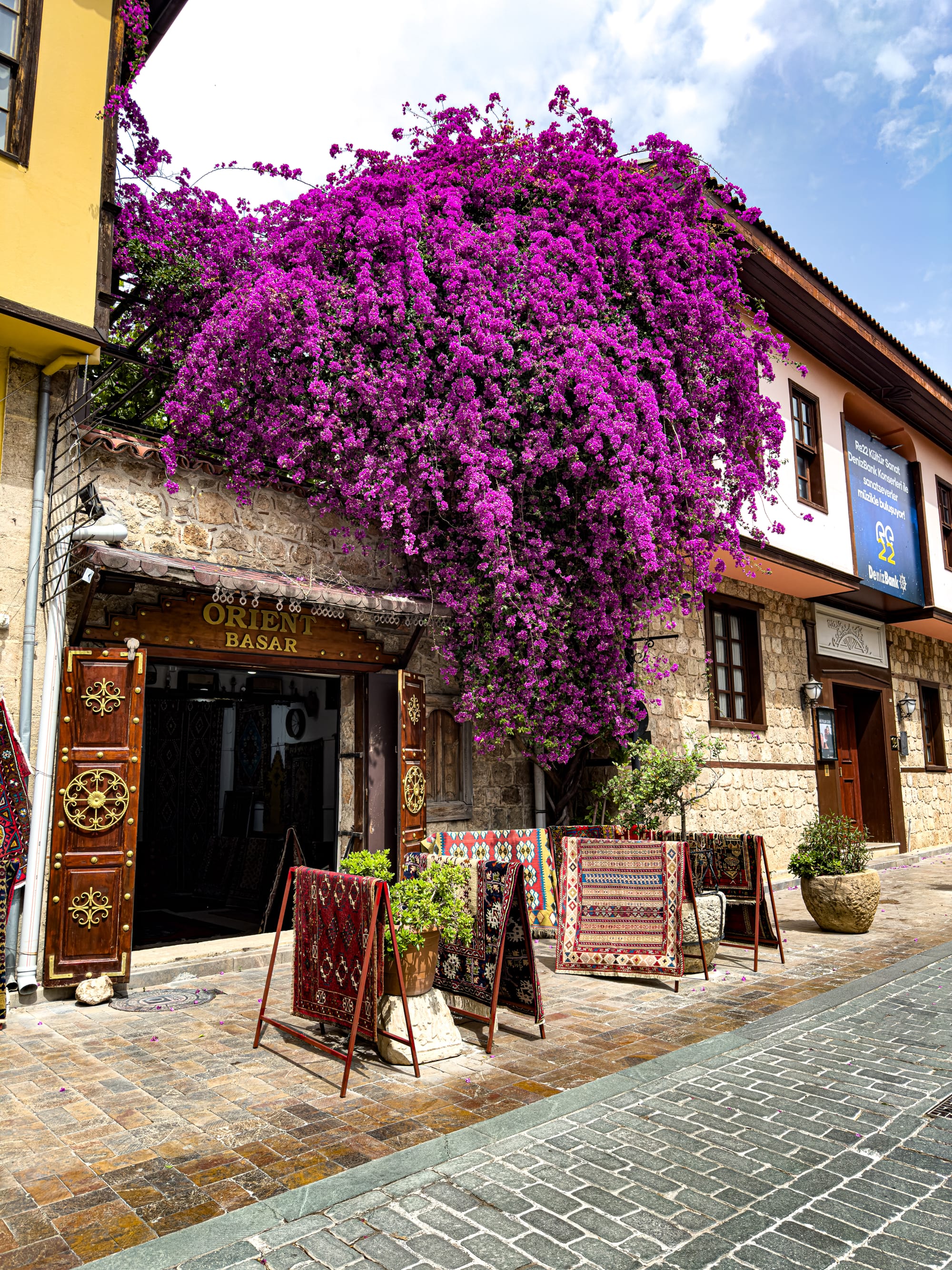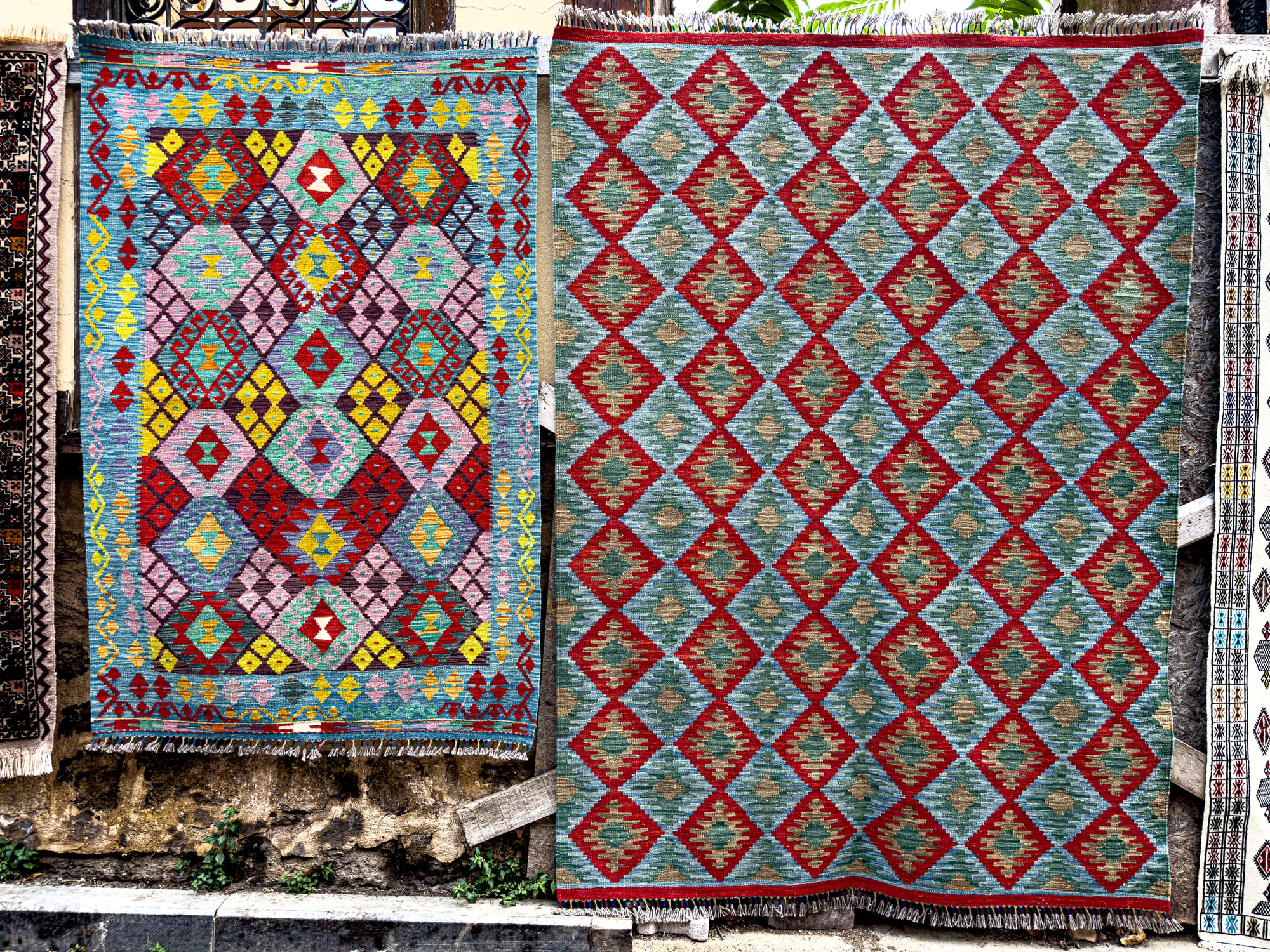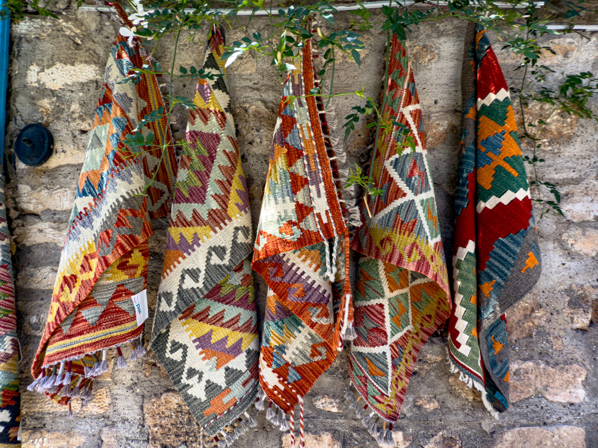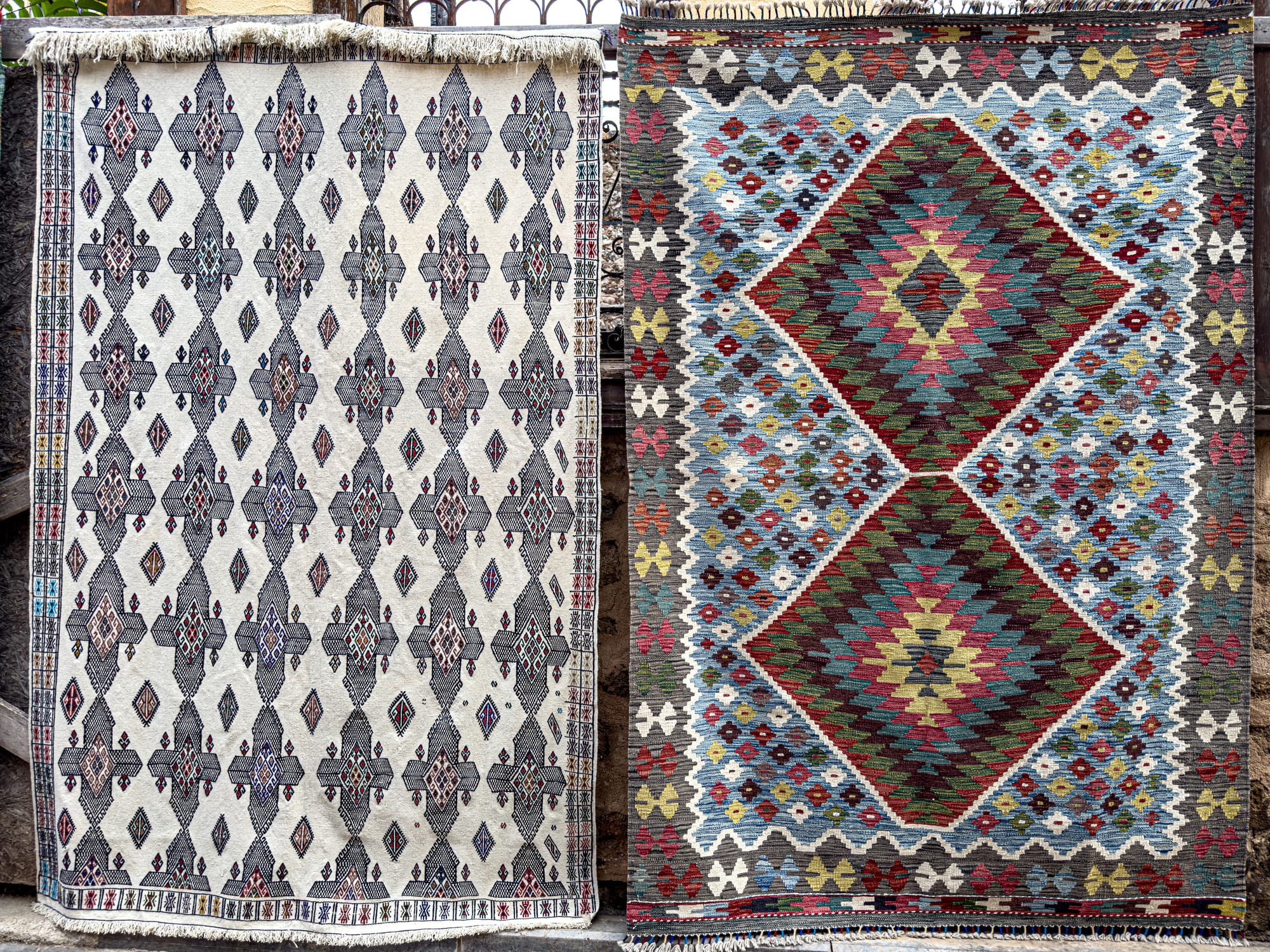 Rugs hang on nearly every vertical surface. There are full-on carpet galleries, of course, but also casual displays: bright kilims draped over balconies, or miniatures laid out on old stone steps.