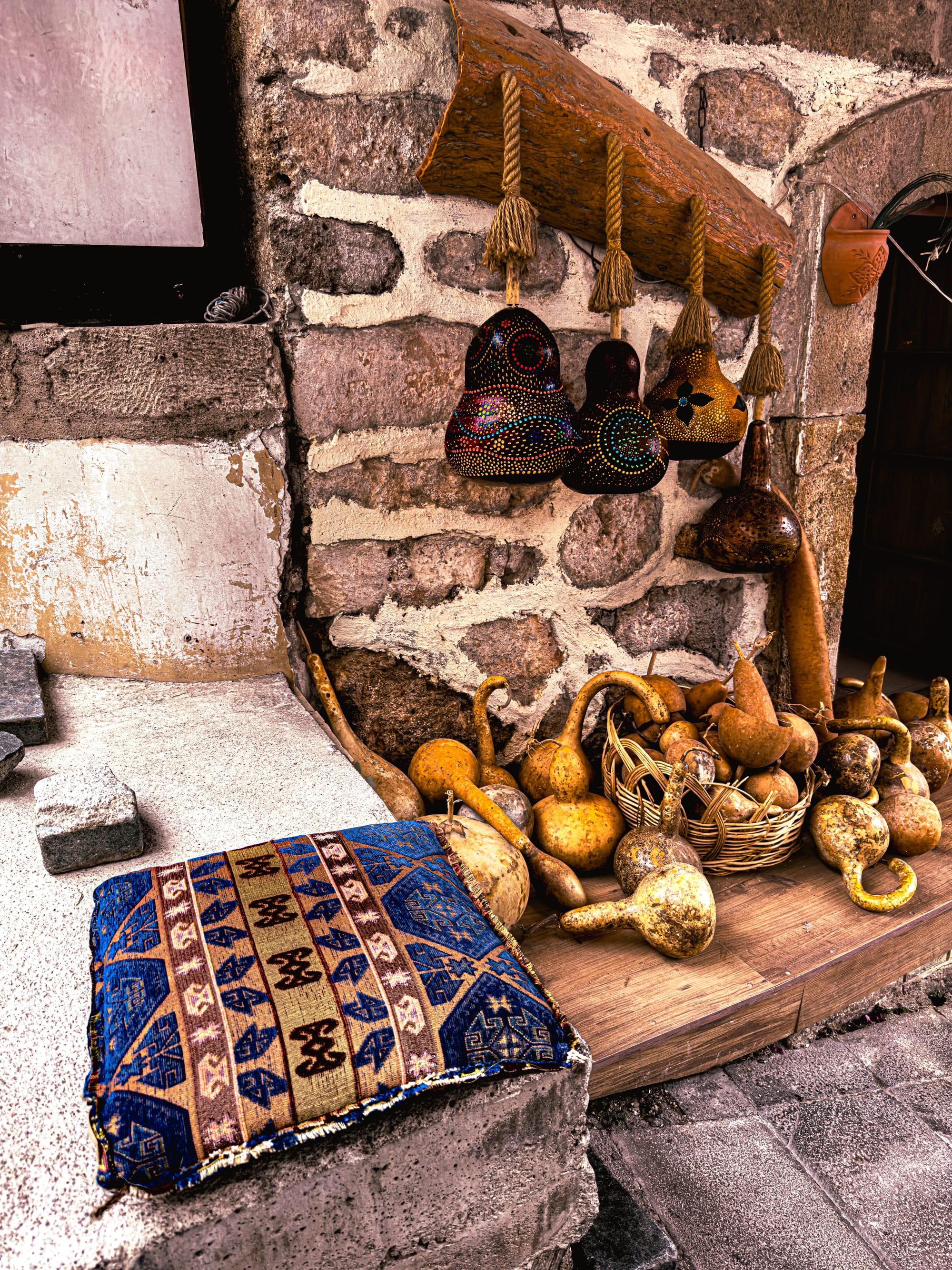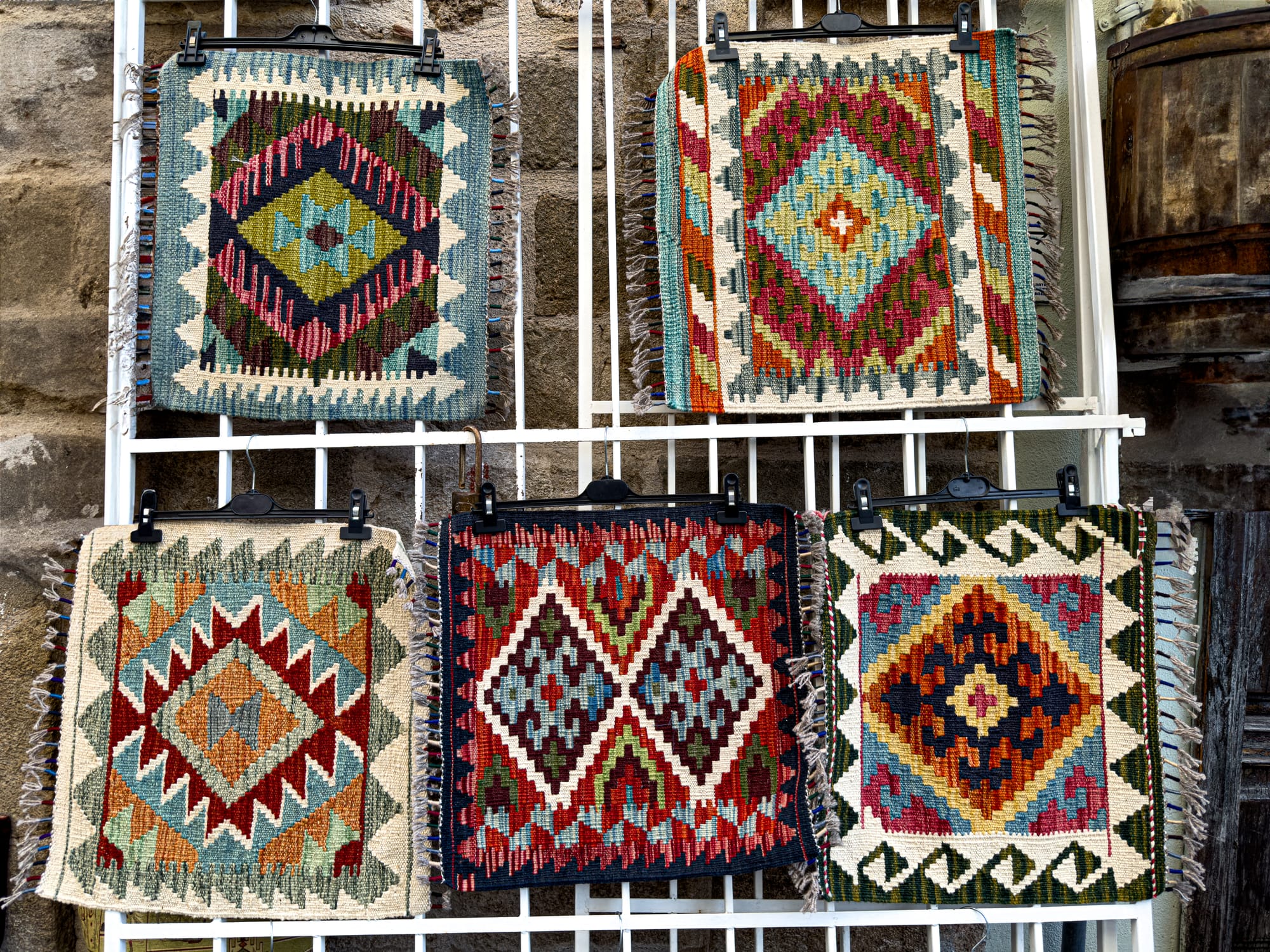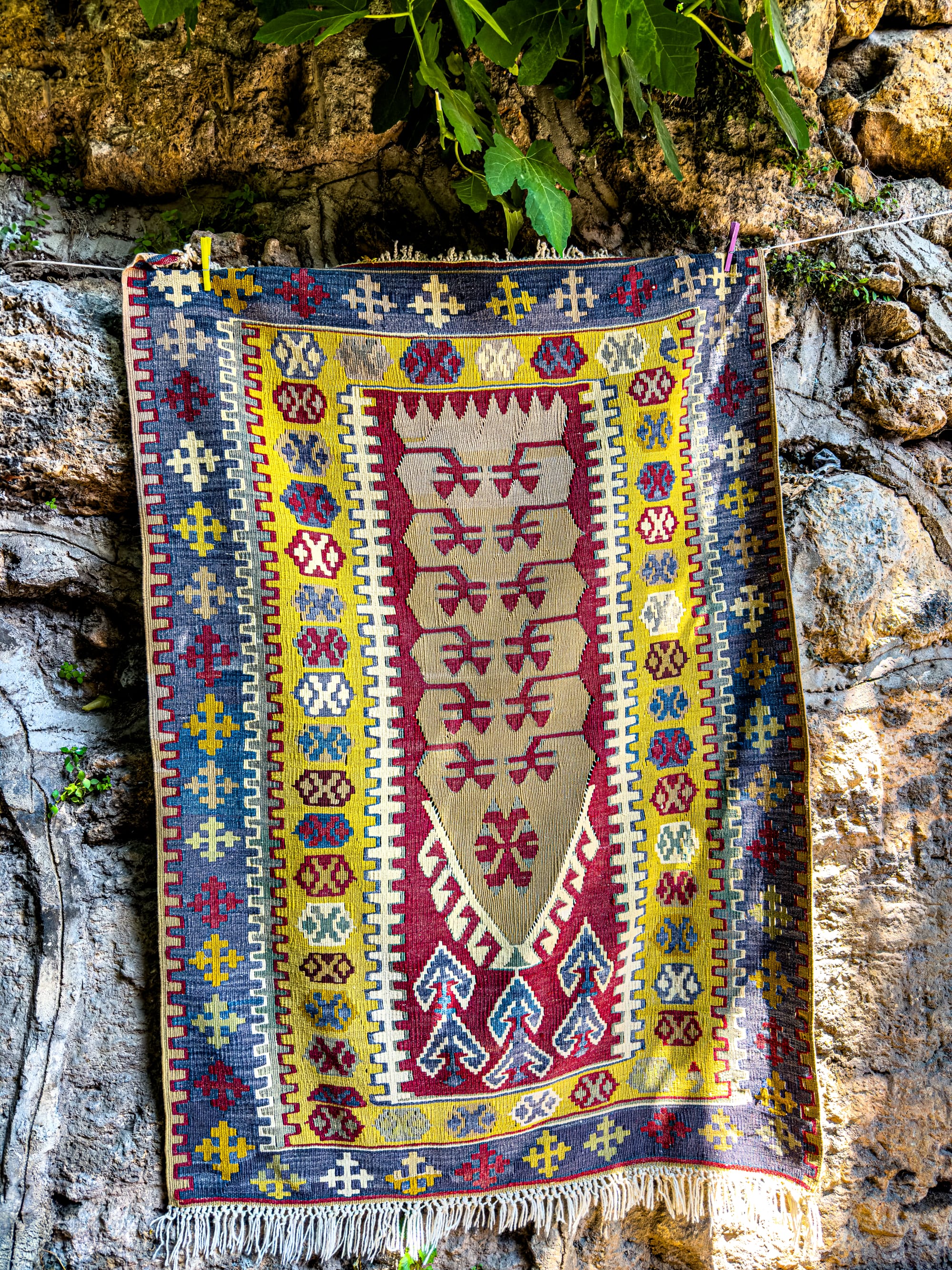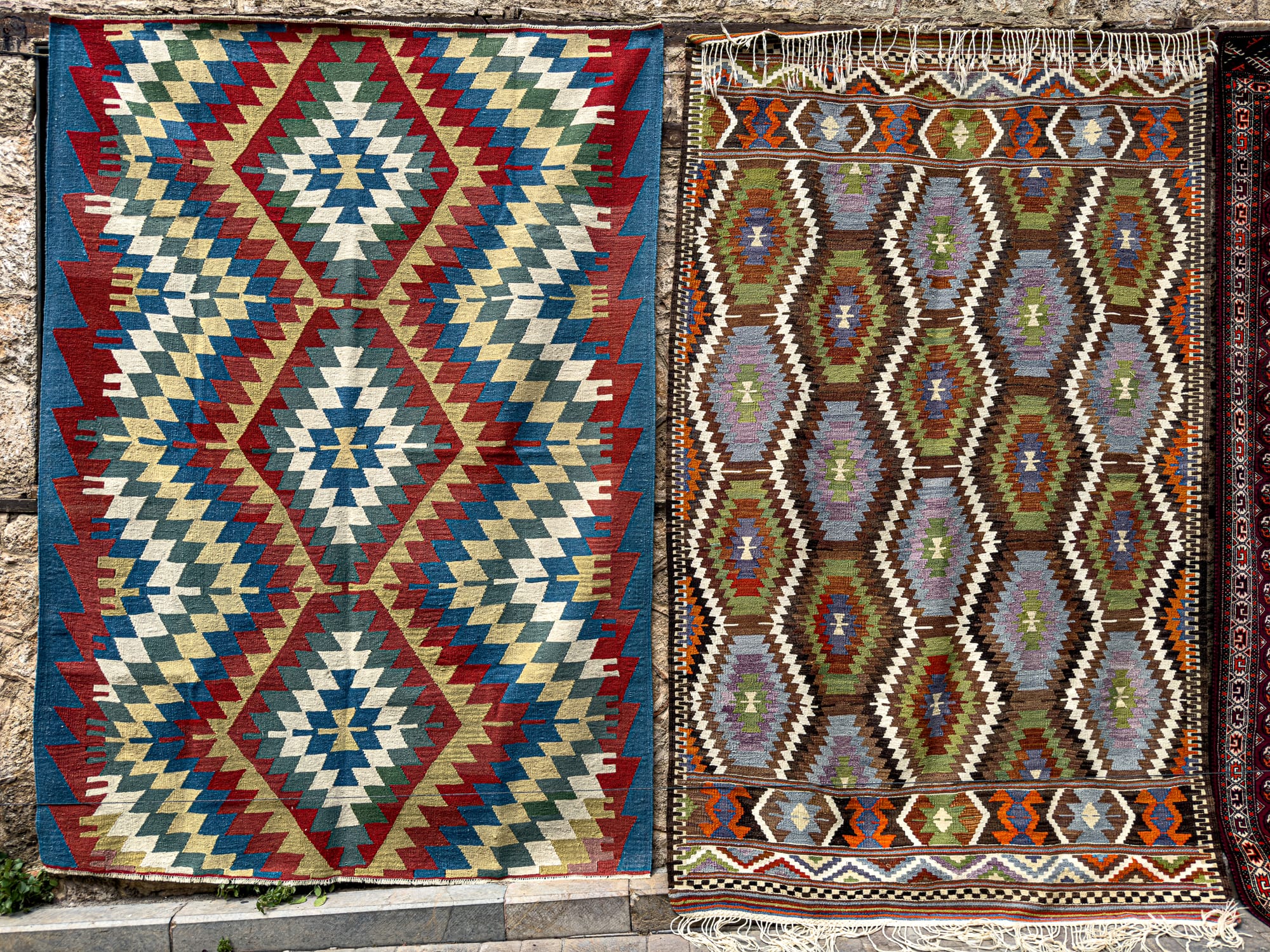 Rugs hang on nearly every vertical surface. There are full-on carpet galleries, of course, but also casual displays: bright kilims draped over balconies, or miniatures laid out on old stone steps.