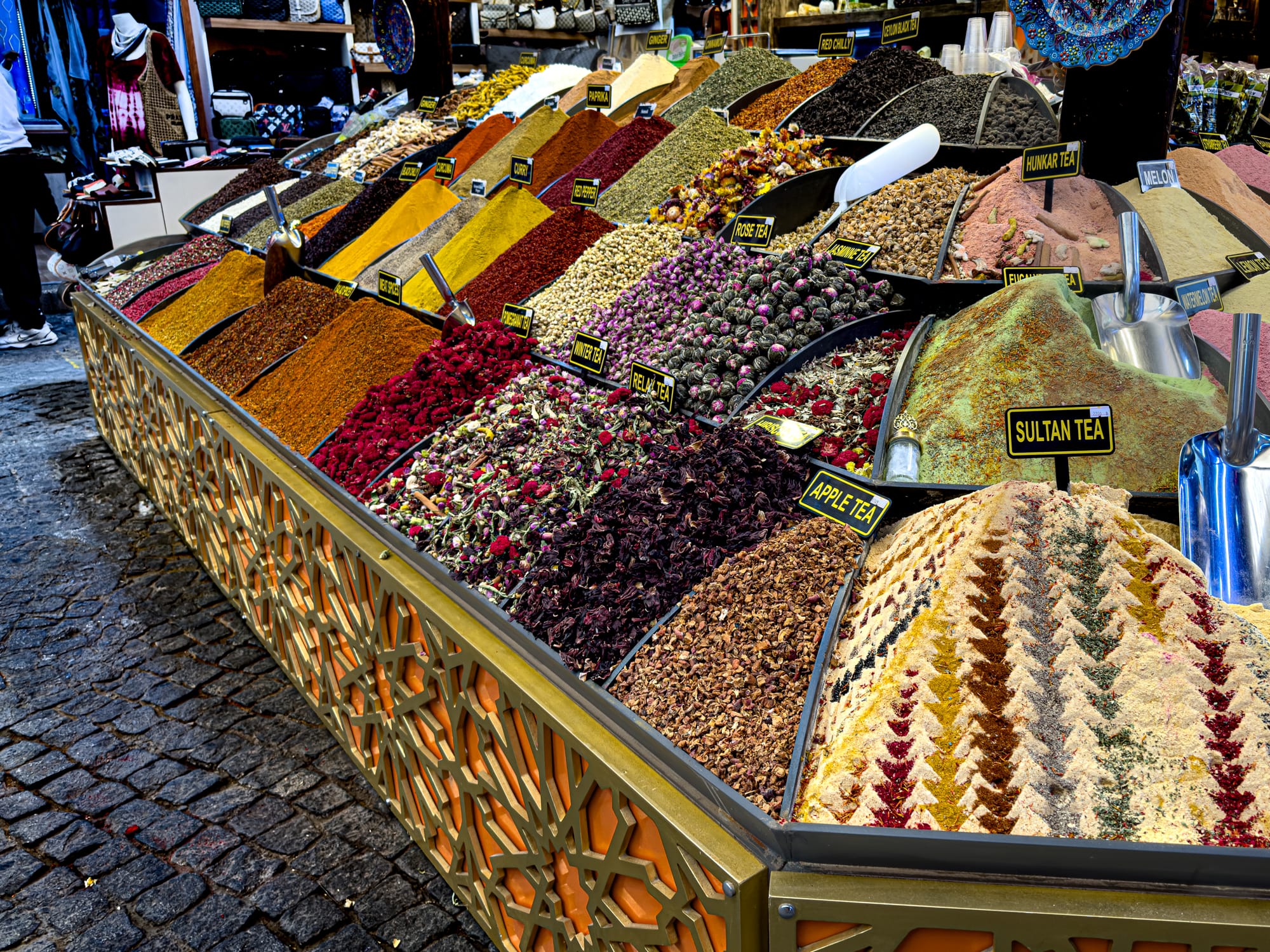Spice and tea stalls are also prominent.