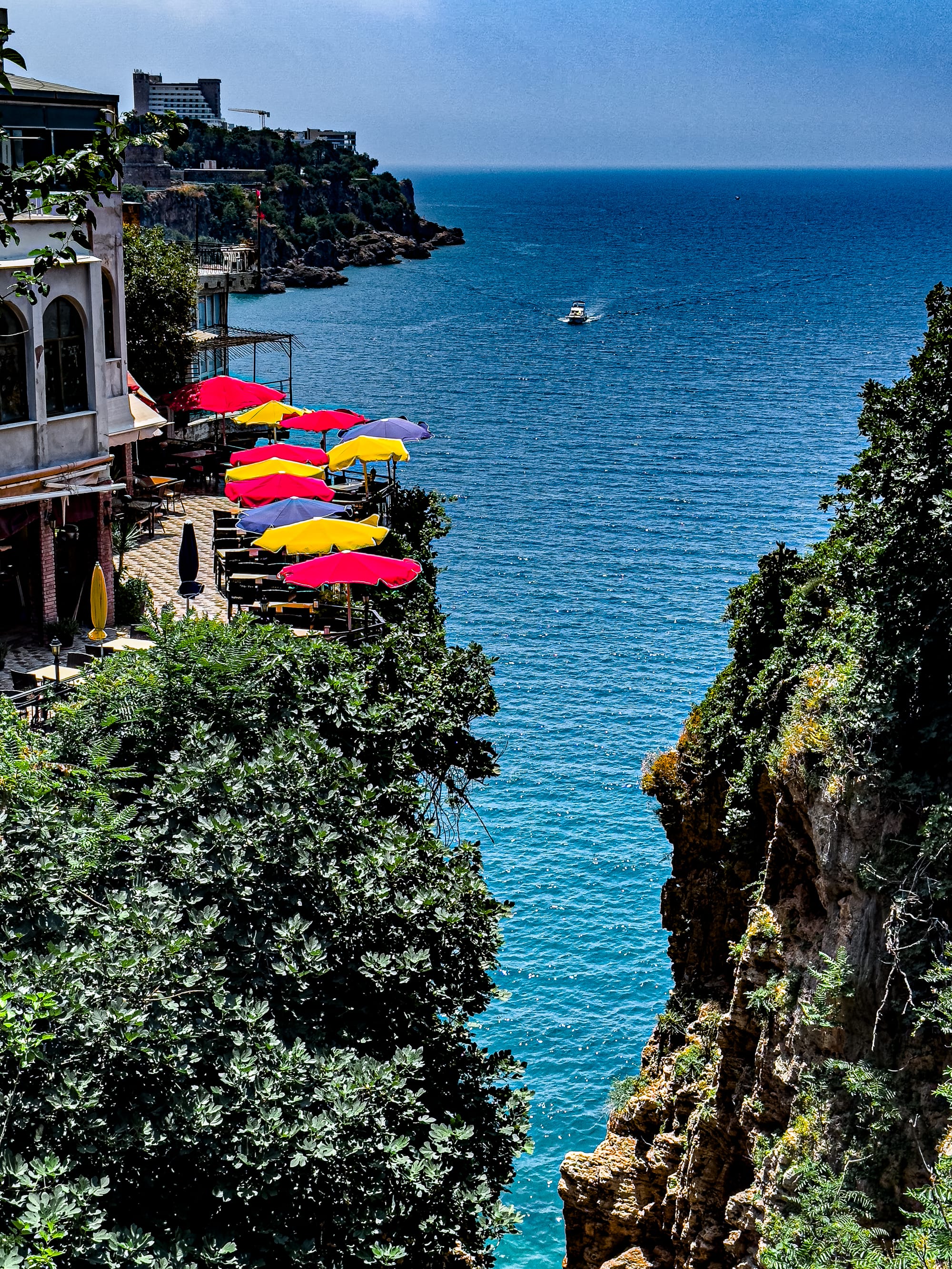 Several viewpoints are worth pausing at. One favorite is near the upper marina, where a row of benches face west, and the entire coastline seems to stretch and shimmer. Another is by the restaurant terraces higher up, where colorful umbrellas have been strung out like bunting between buildings, and the view drops straight down to the harbor. Lastly, the view from Coworking Antalya is also quite special.