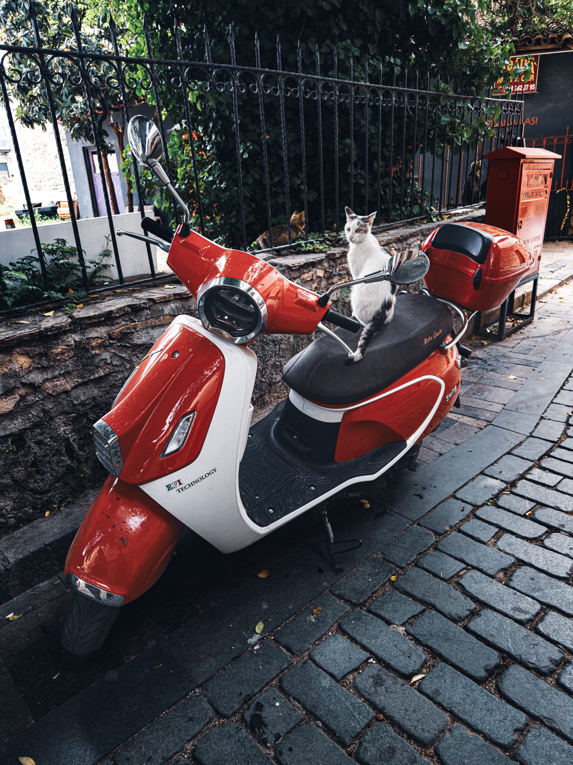 There are cats everywhere in Kaleiçi. You’ll find them curled in shop windows, sunning themselves on warm stone steps, weaving between café chairs, or sleeping beneath hanging carpets.