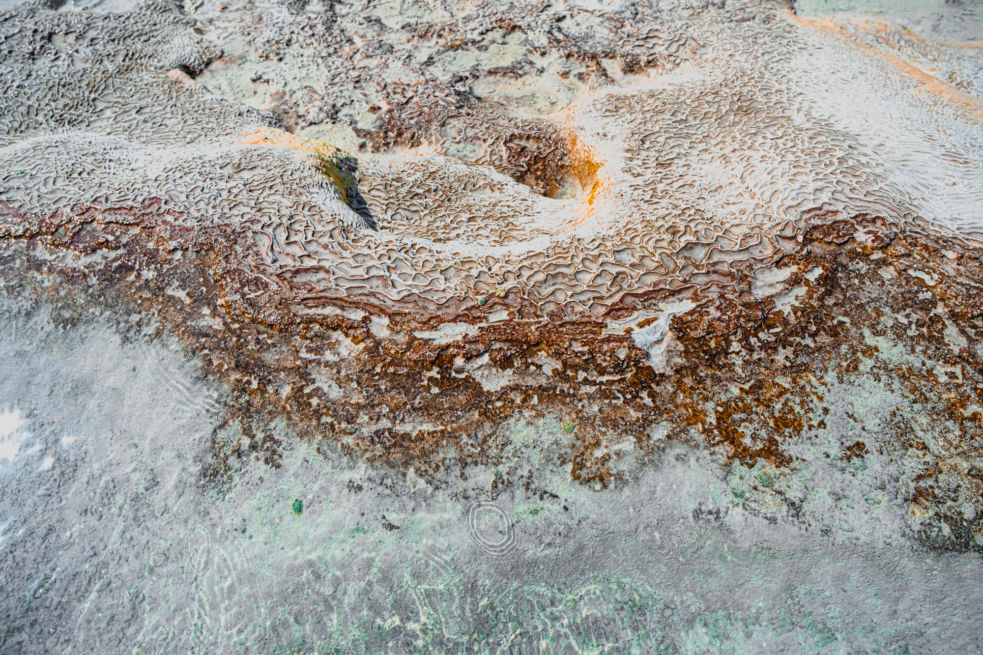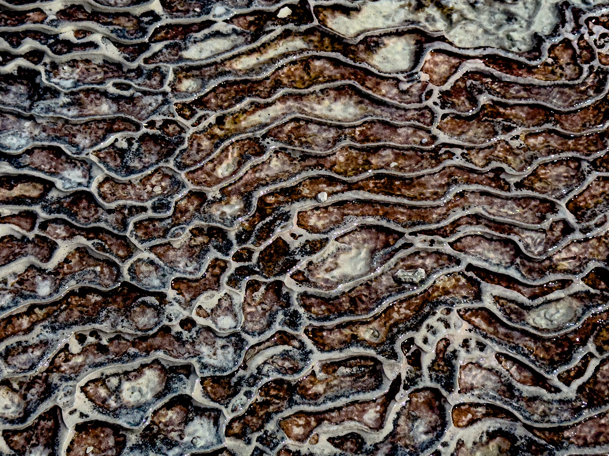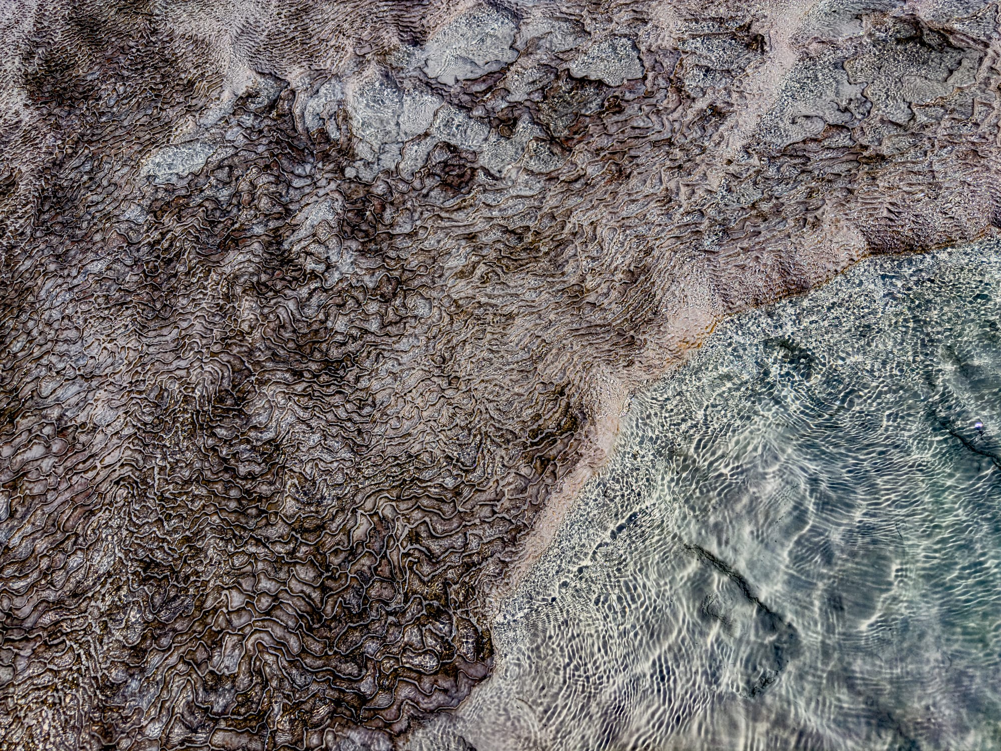 In our wanderings, we came across areas stained with soft golds and rust tones, others coated in snowy white, and even places where algae and minerals created greenish-brown abstract swirls. The surfaces sometimes resemble coral reefs, fossilized waves, or lacework in stone.