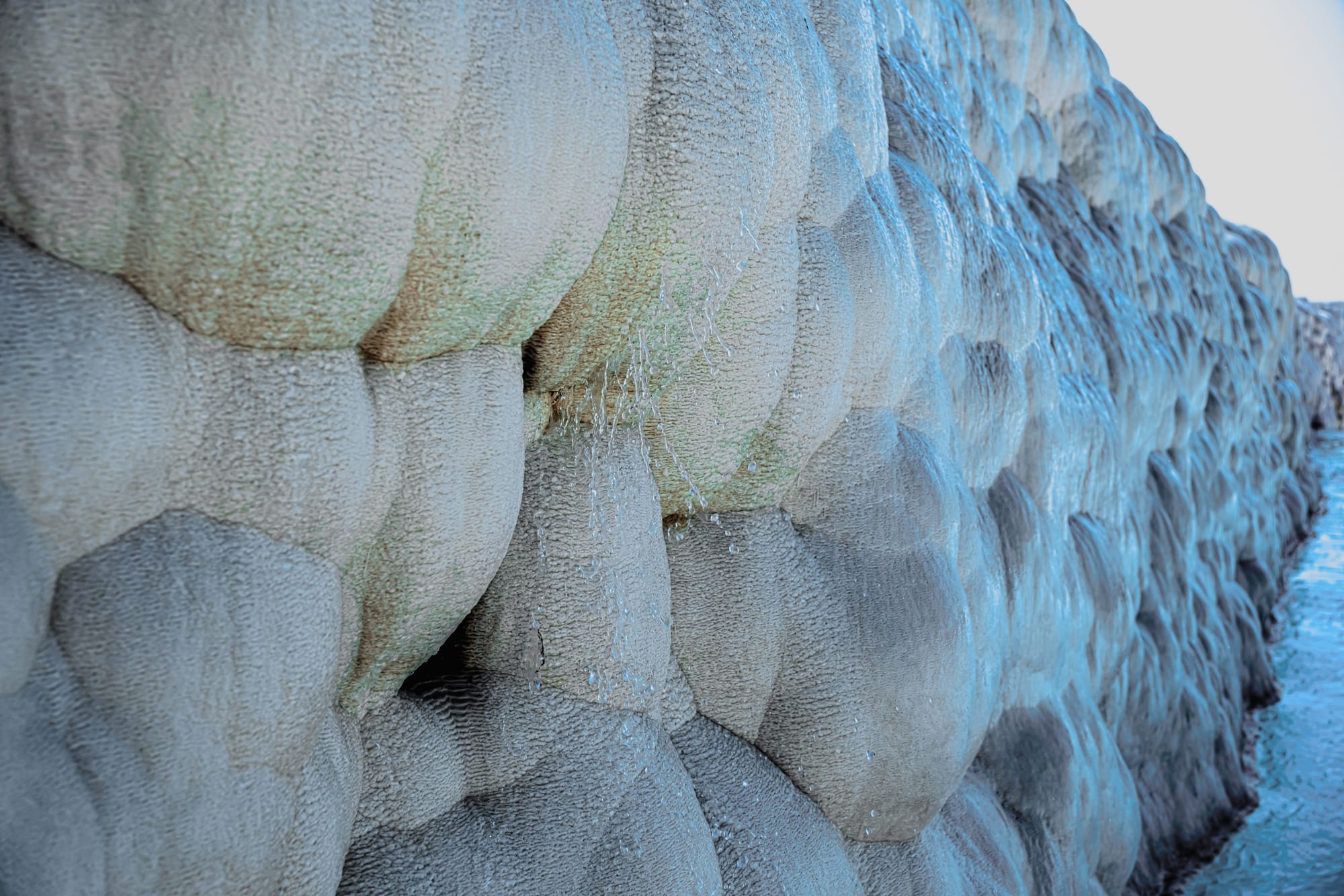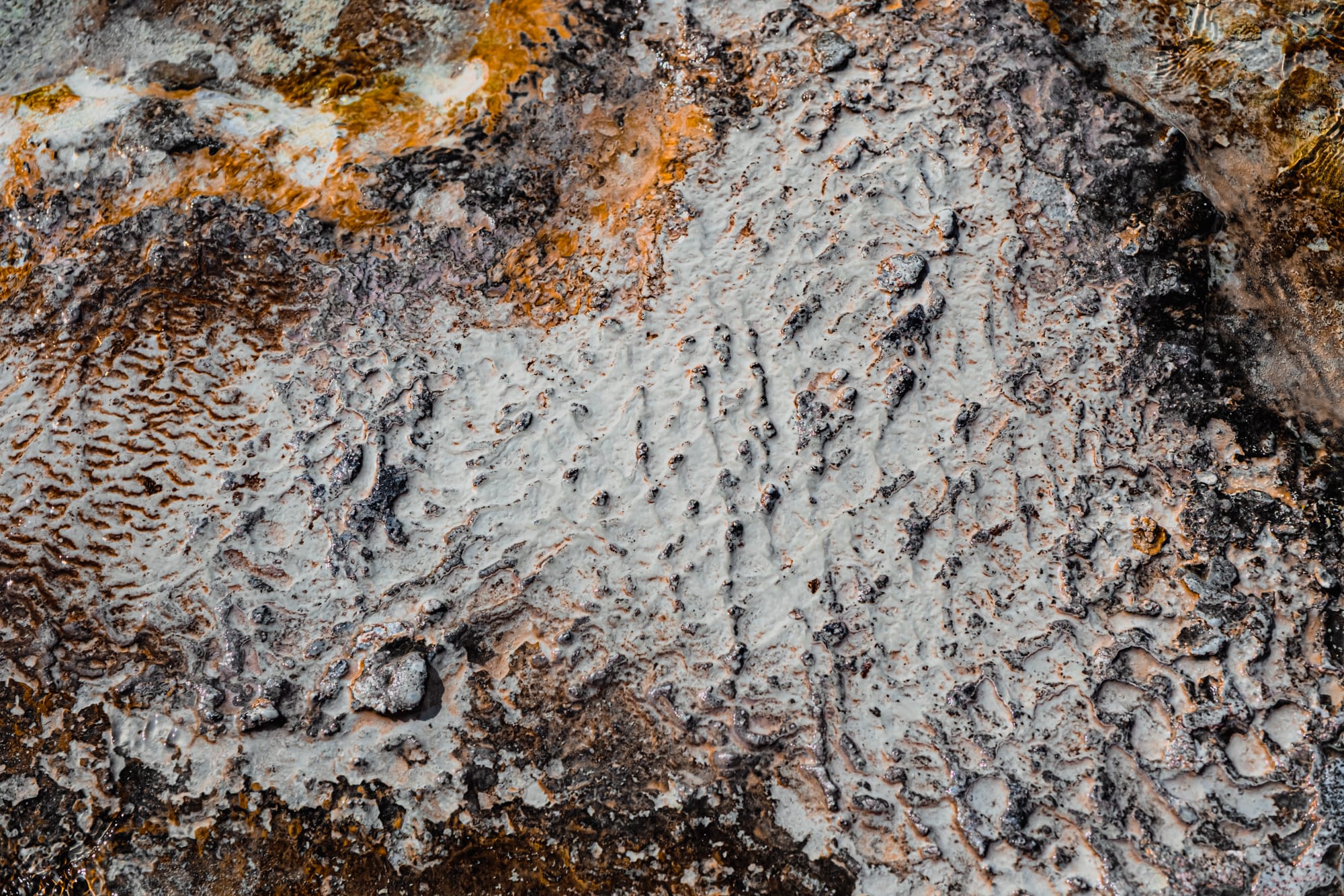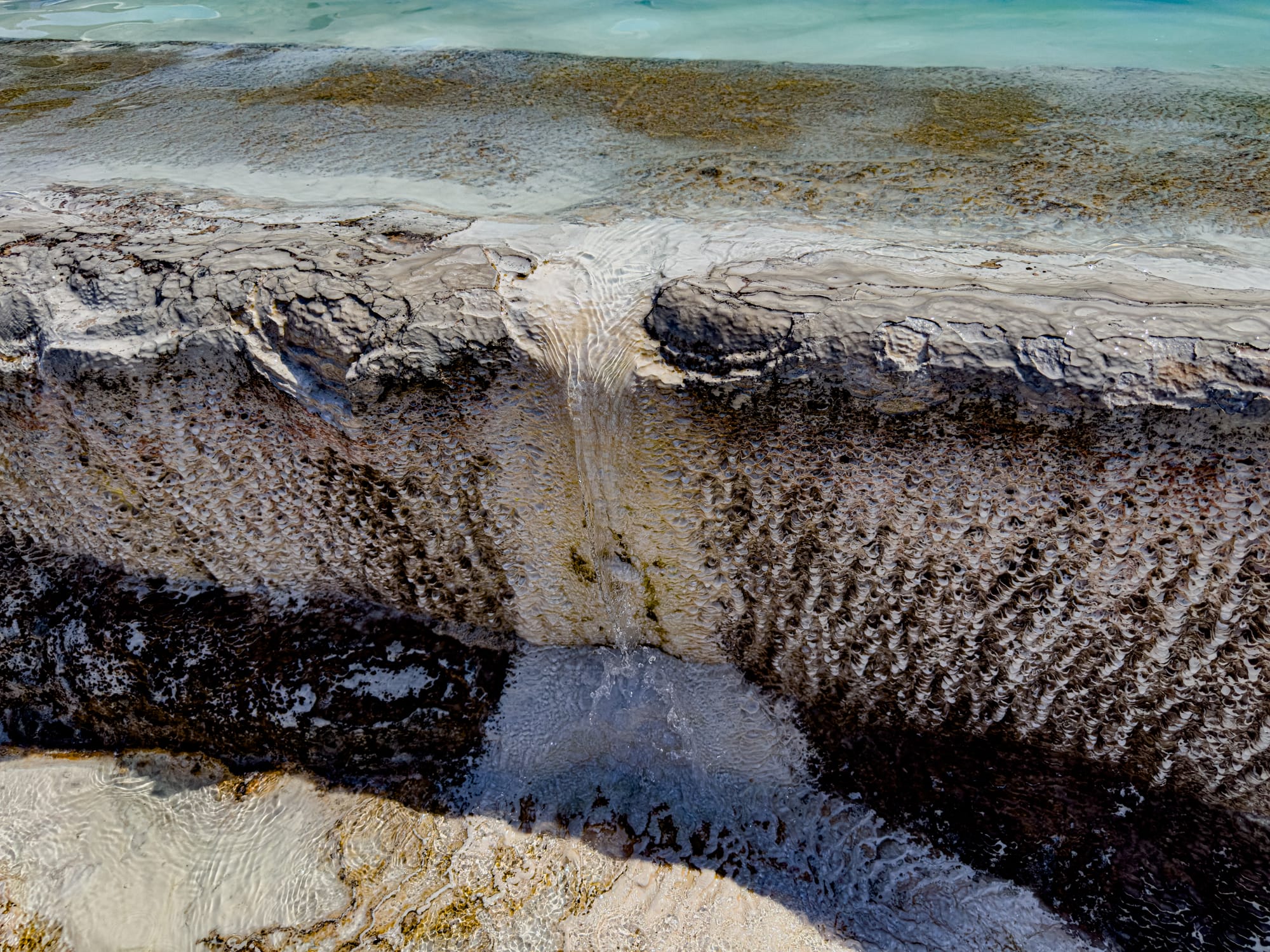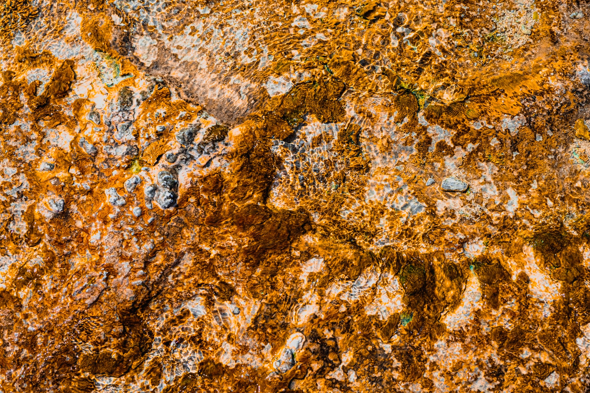 In our wanderings, we came across areas stained with soft golds and rust tones, others coated in snowy white, and even places where algae and minerals created greenish-brown abstract swirls. The surfaces sometimes resemble coral reefs, fossilized waves, or lacework in stone.