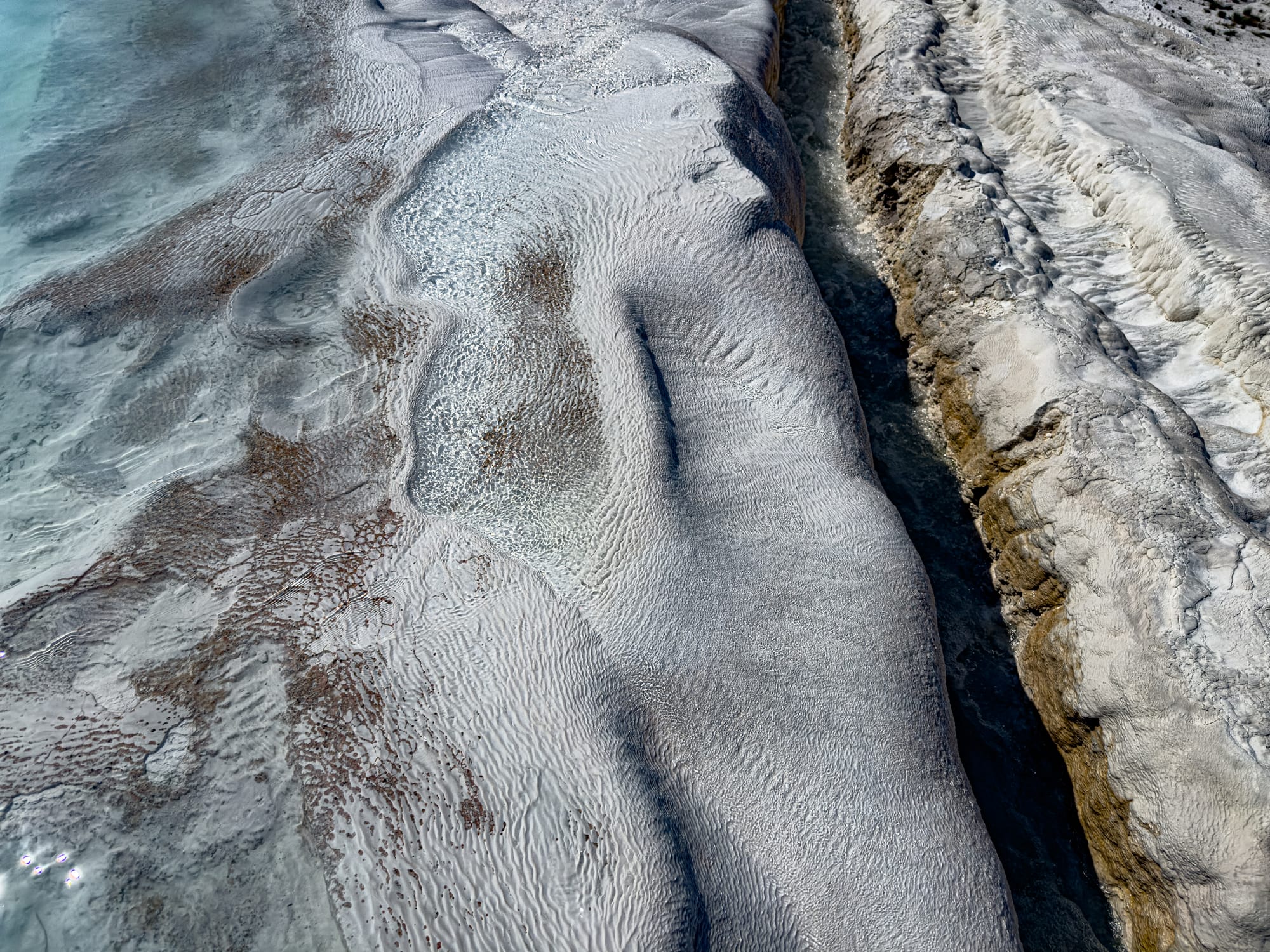 Mineral-rich water carves ripples, ridges, and overhangs into Pamukkale’s dazzling white travertine terraces