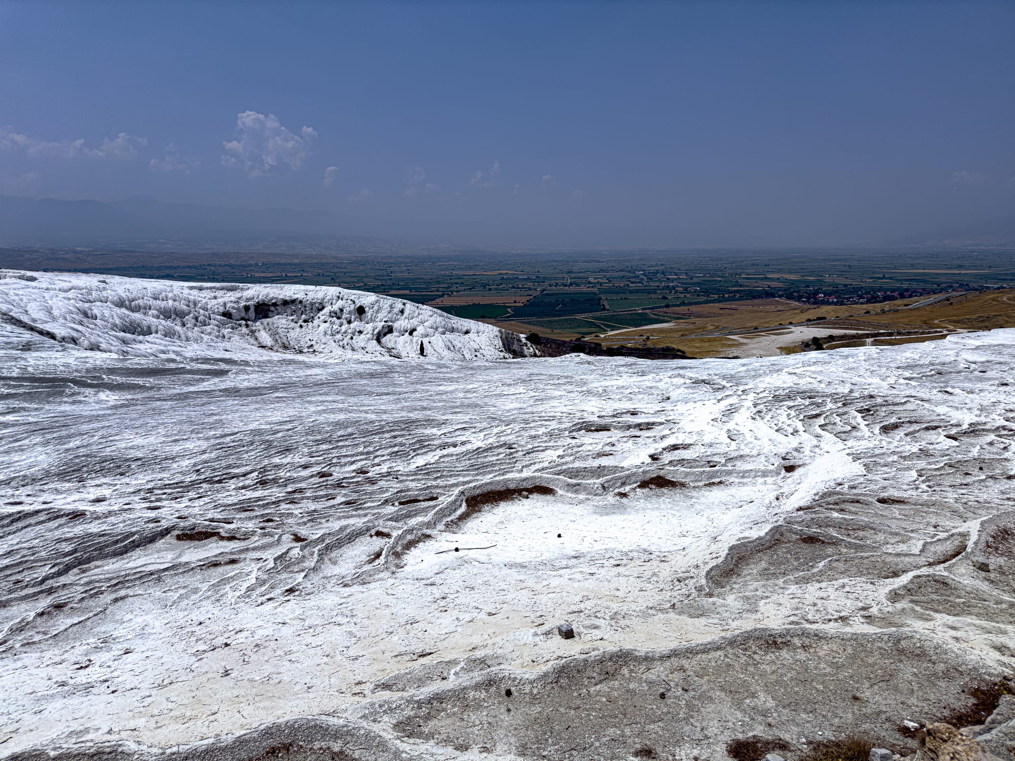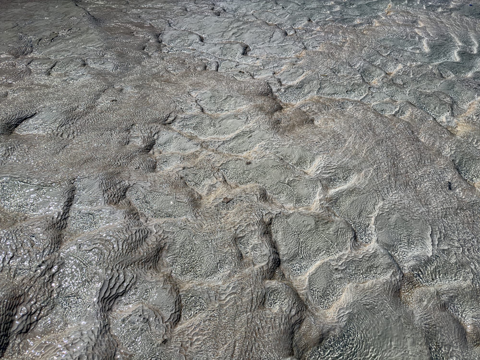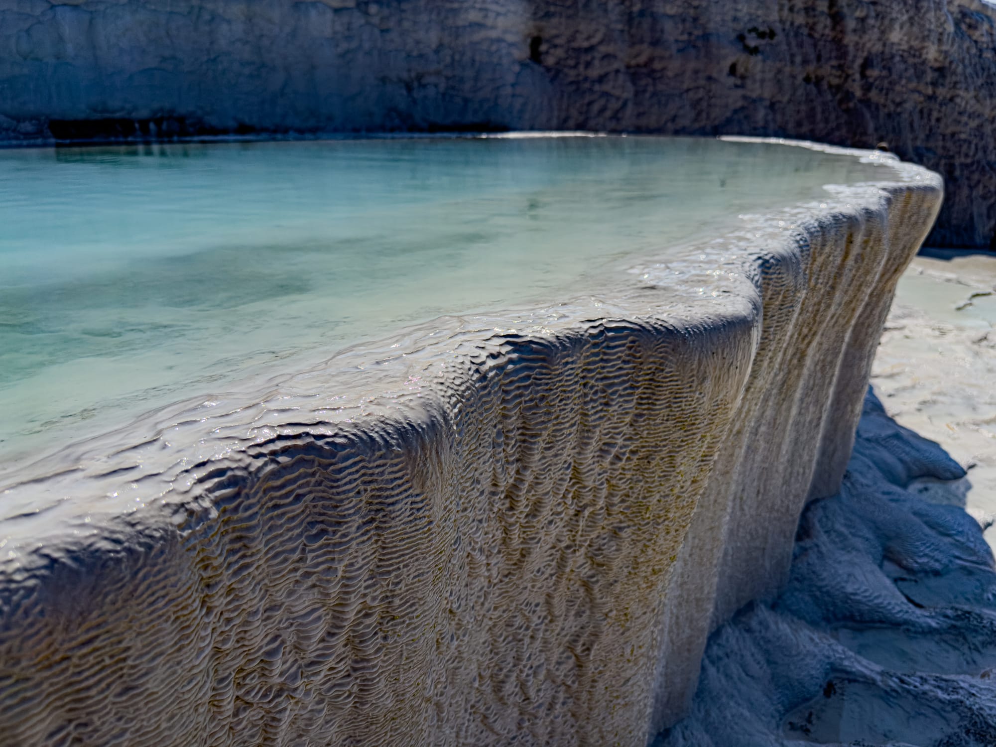 Up close, Pamukkale is just as beautiful as it is from afar. The terraces are etched with intricate, almost cellular patterns—repeating scales, ridges, and ripples that change depending on where you are. Some are chalky and dry, others glisten under thin sheets of water.