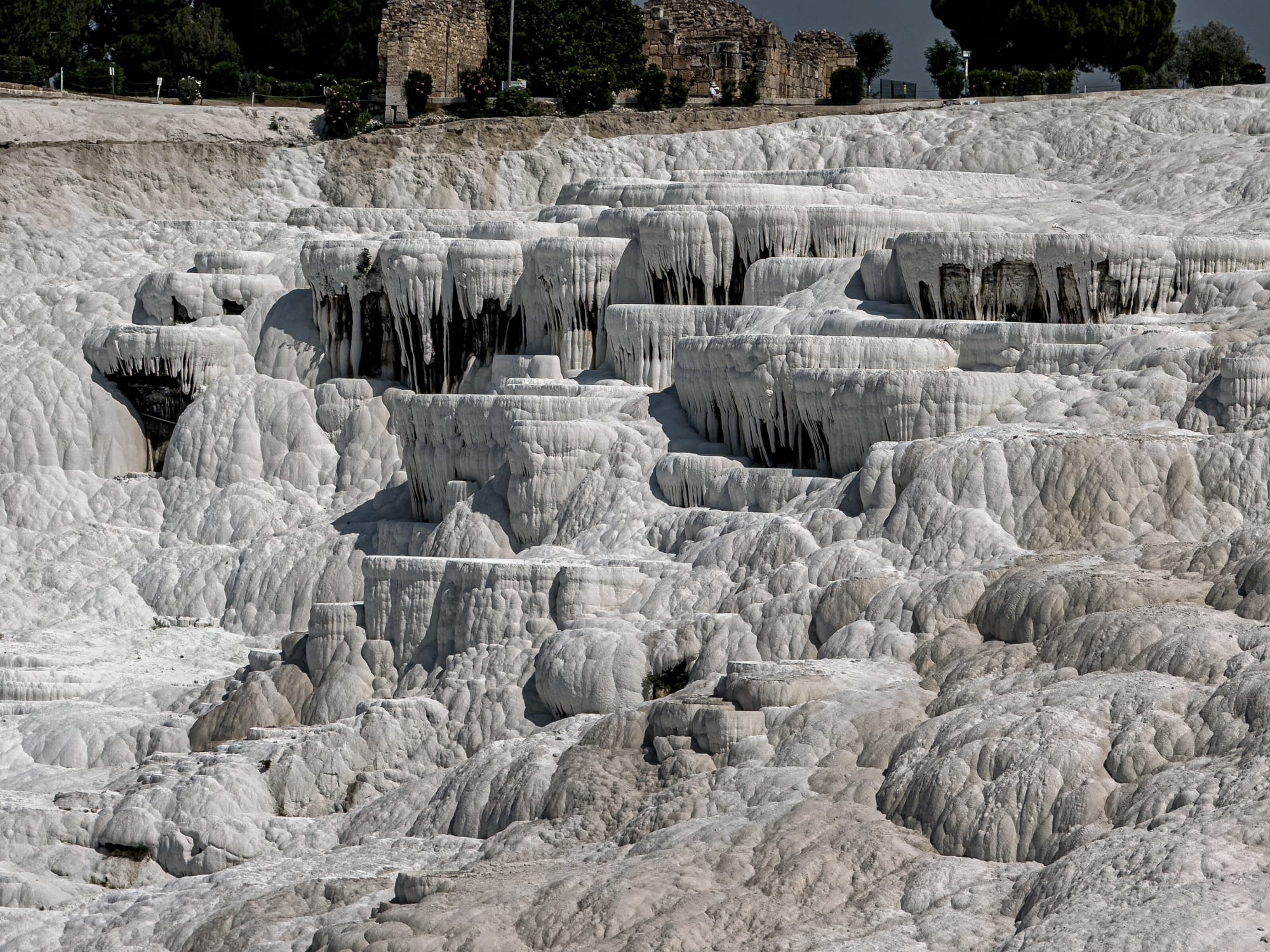 Pamukkale’s travertines are the result of a fascinating geochemical process. The water that feeds them originates from hot springs deep underground. As this water rises, it becomes saturated with calcium carbonate. When it reaches the surface and cools, the carbon dioxide it contains is released into the air, causing the calcium carbonate to precipitate out and form solid deposits.