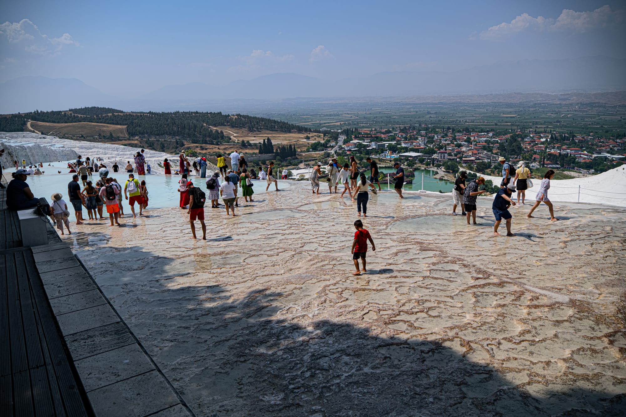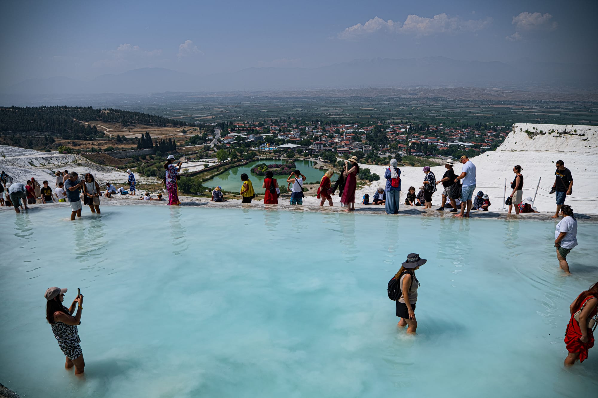 Crowds gather to wade through Pamukkale’s warm turquoise pools, perched above panoramic valley views