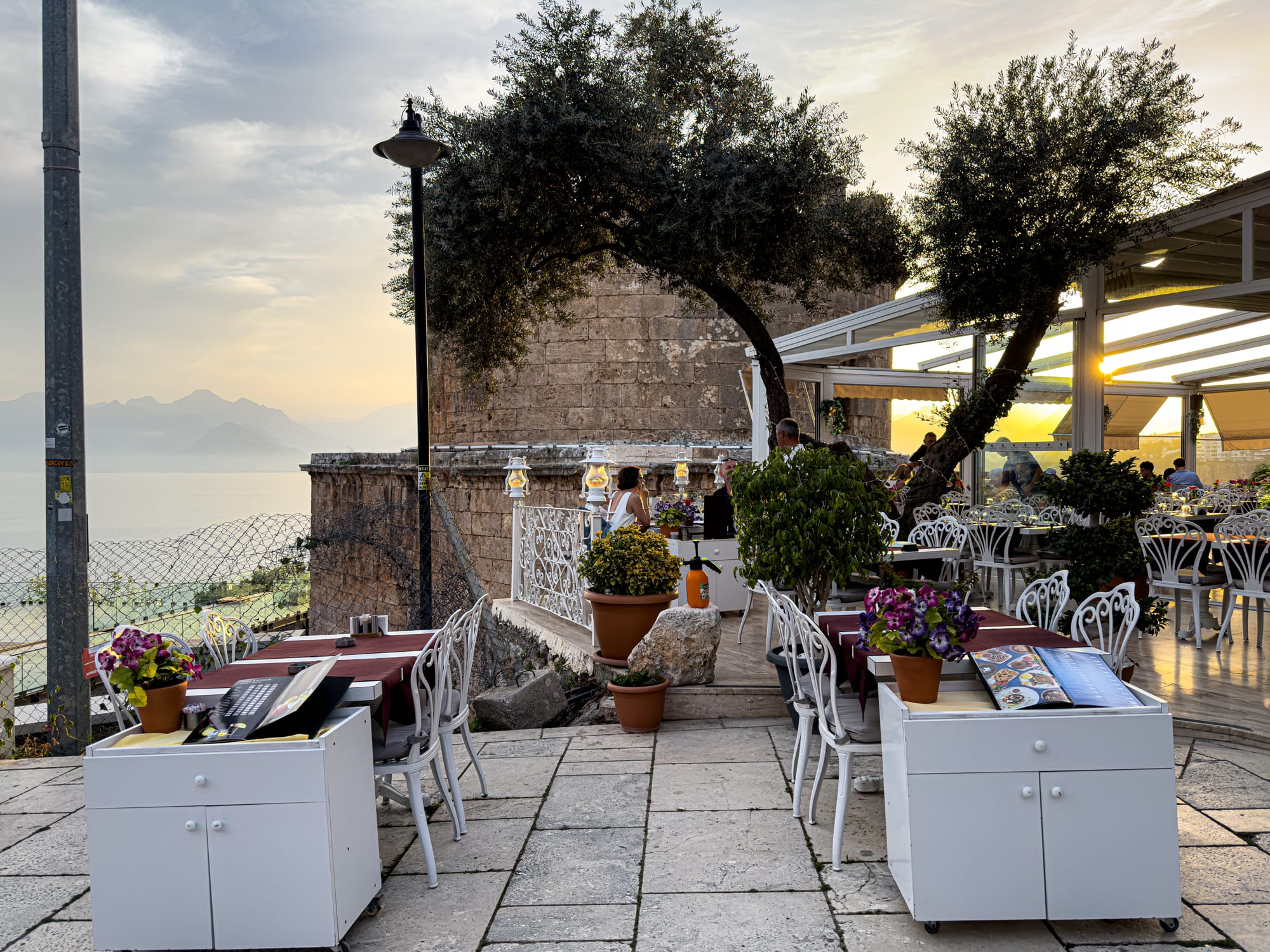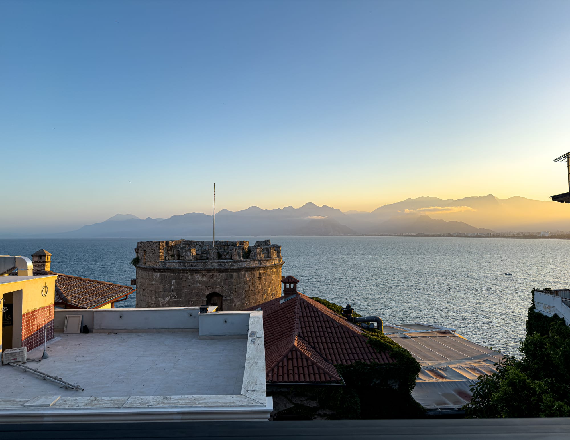 From the tower’s edge, the whole curve of the coastline unfurls westward, toward Konyaaltı Beach and the rugged mountains that gather the last of the day’s sun.