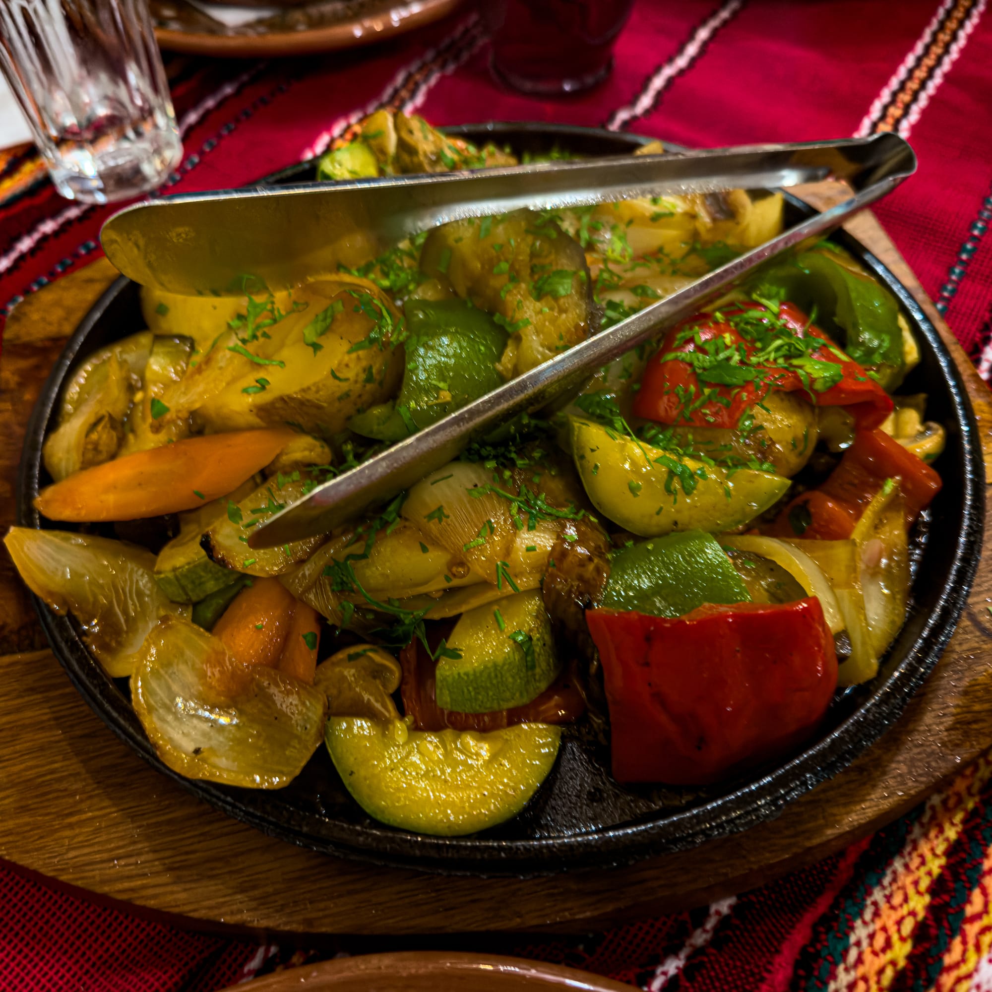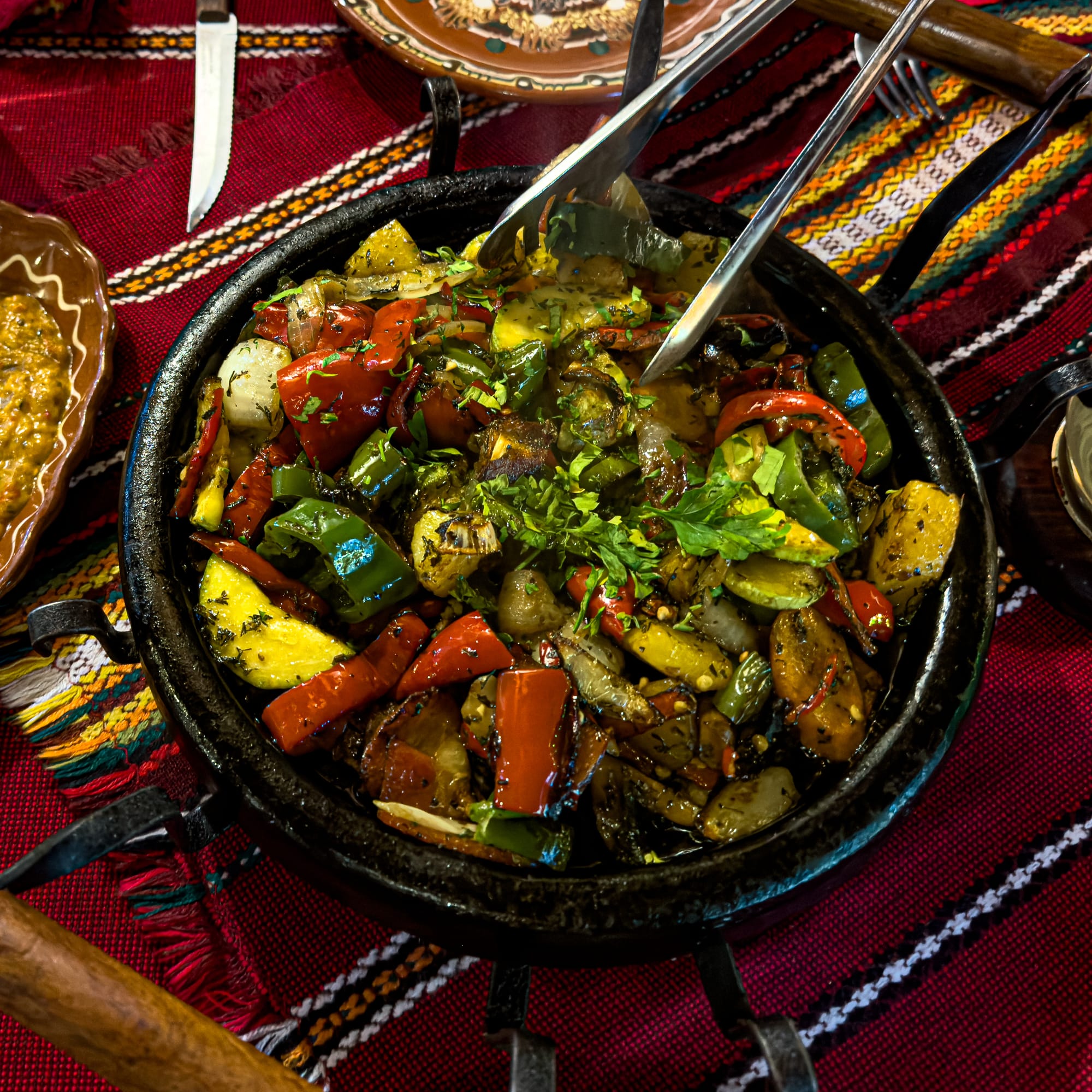 An atmospheric mehana, Dedo Tase offers a great vegetable sach packed with pepper, potato, zucchini, onions, mushrooms, and topped with fresh herbs.
