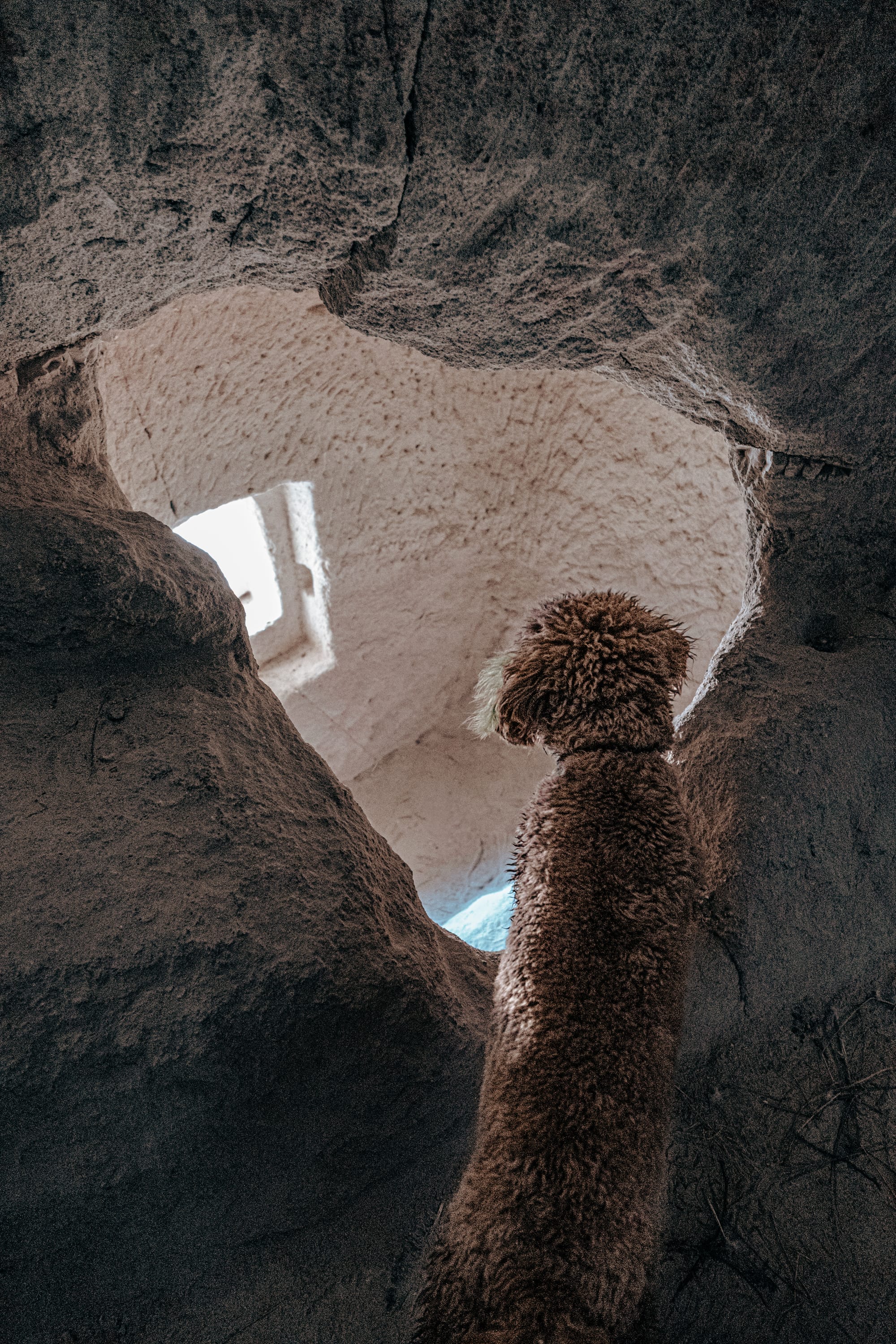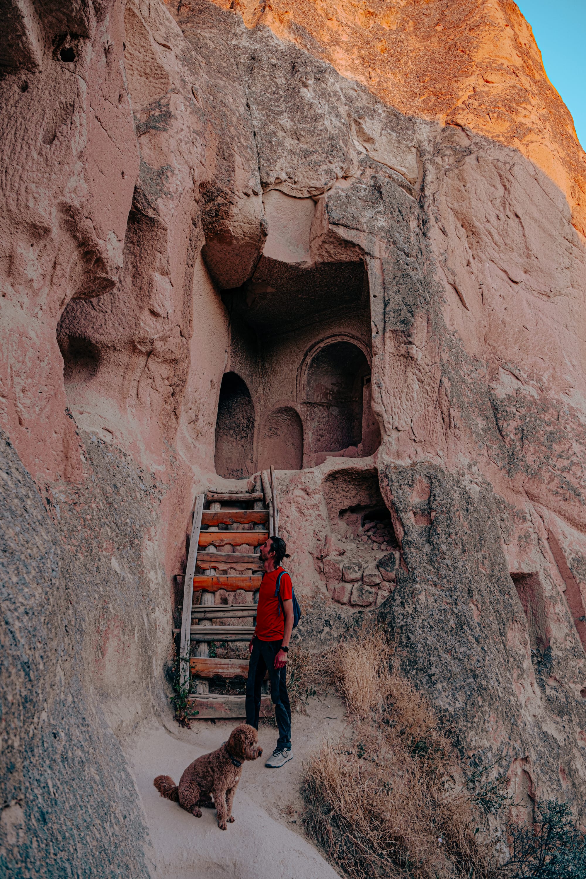 The hike begins in the late afternoon, when the heat starts to mellow and shadows render the valley’s hush into a tranquil hush. Şamil picked us up and drove us to the trailhead just as golden light began kissing the pink tuff. Oscar bounded ahead, his shadow dancing across the dusty path. From the moment we stepped into the shaded corridor of rock walls, time felt suspended. The knives of rock wavered between blush and bronze in the shifting light, and our footsteps echoed off the tuff as we descended into the valley on a winding, narrow trail.