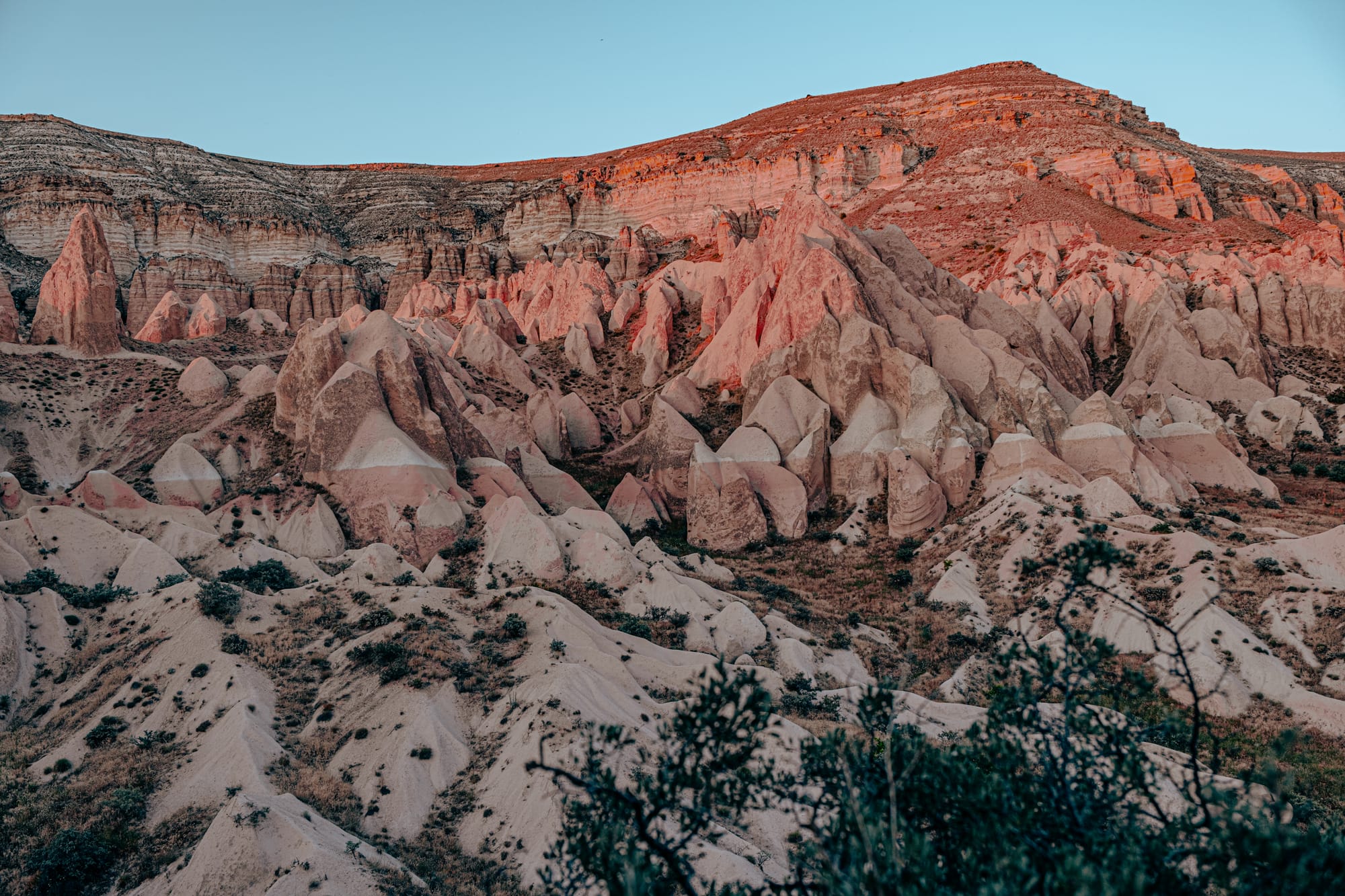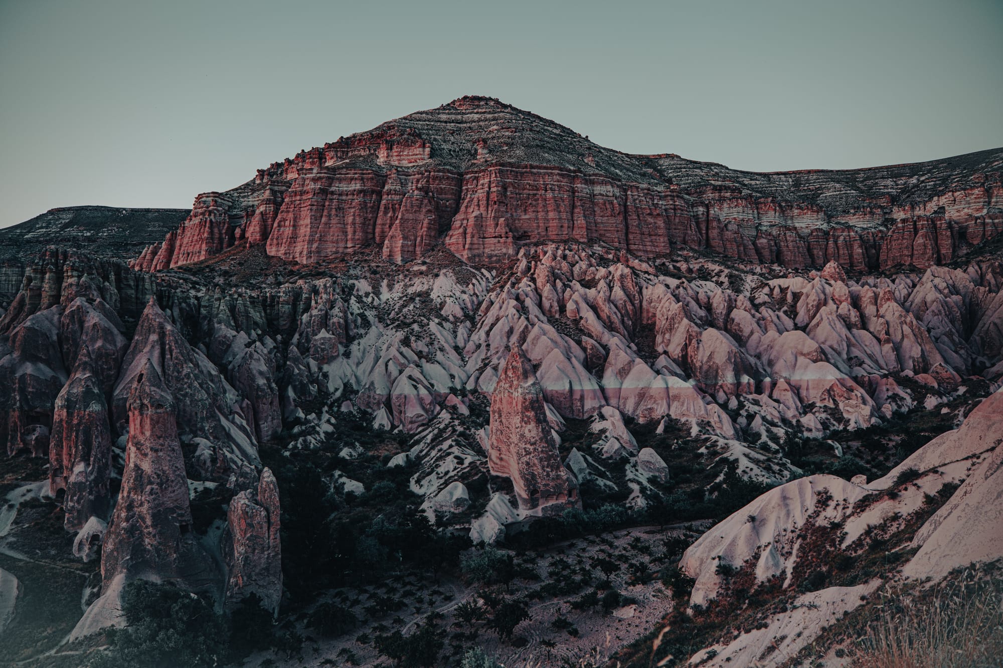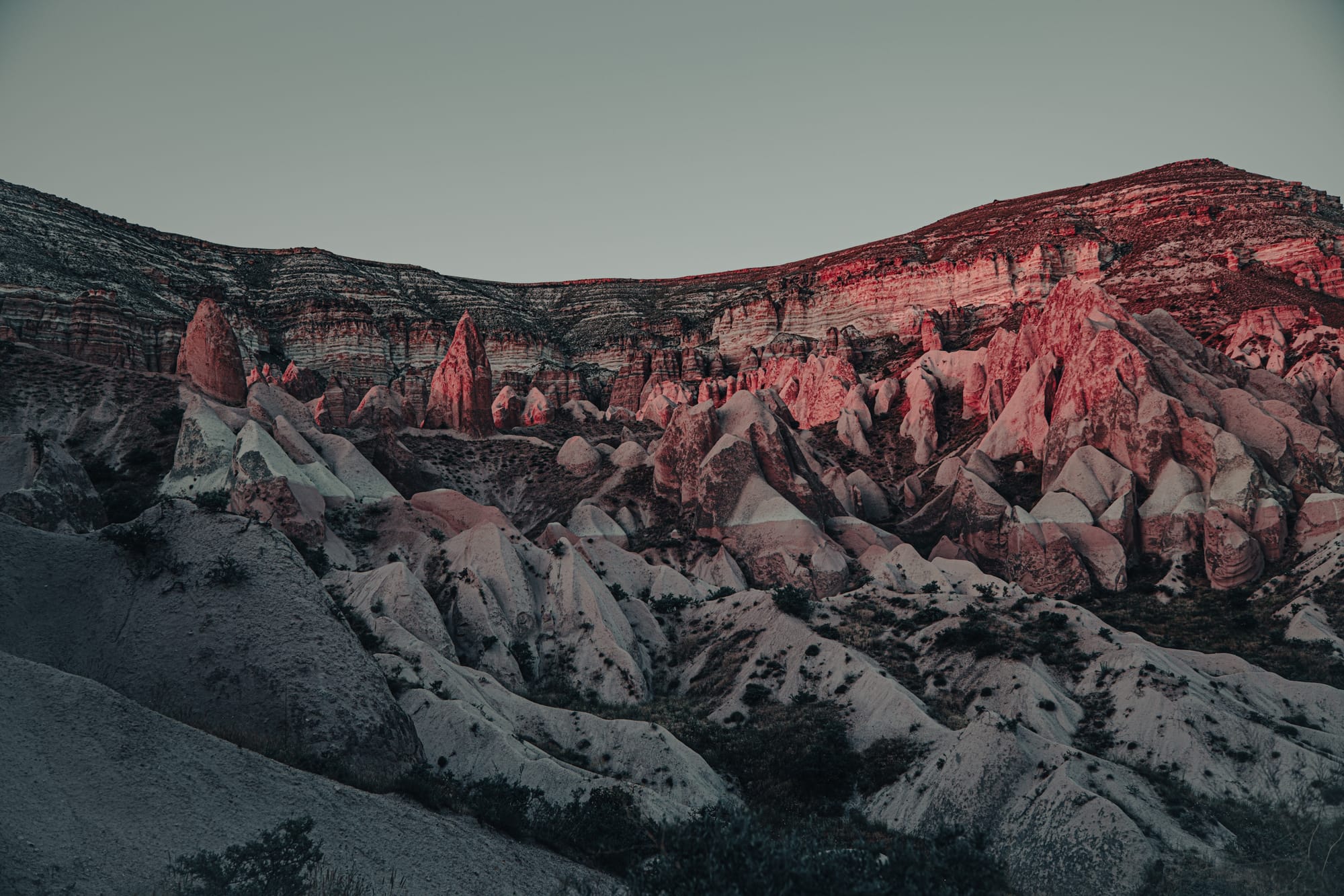 Evening light paints Cappadocia’s rugged cliffs and spires in deep reds and soft shadows