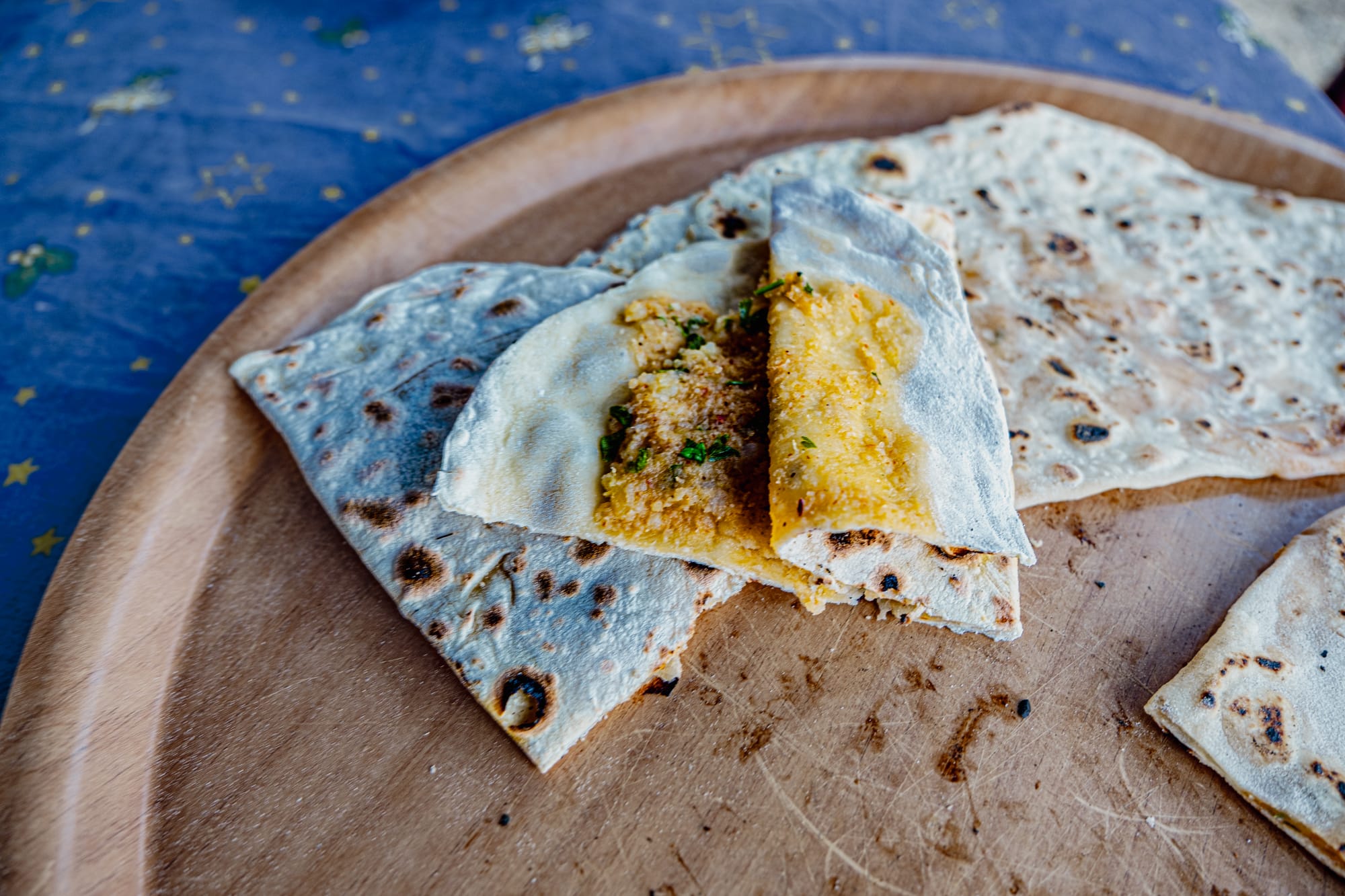 Freshly cooked gözleme filled with herby potato mash, its crispy exterior revealing the flavorful filling inside