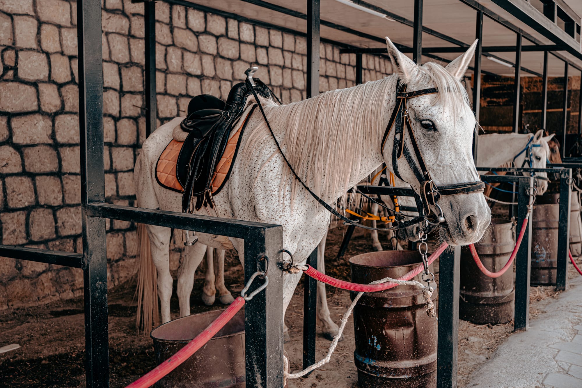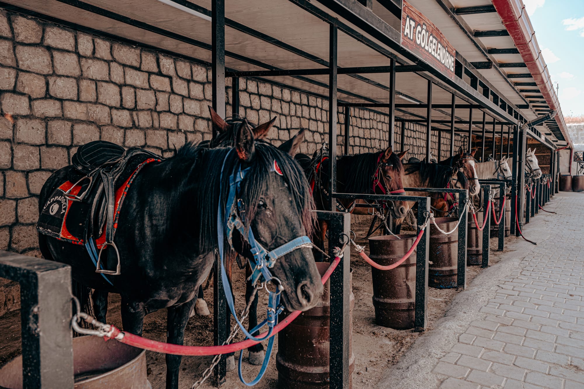 Horses are at the heart of Moonlight Ranch, adding a living presence to its western-style scenery. They graze in the open paddocks, their silhouettes set against Cappadocia’s pale rock formations and the distant line of mountains. Some stand quietly in the shade of wooden shelters, shifting their weight slowly from hoof to hoof; others wander to the fence line, ears flicking toward visitors. Their movement brings a softness to the ranch’s cinematic backdrop—a reminder that, for all its frontier-town facades, this is still a working space where animals are cared for daily.