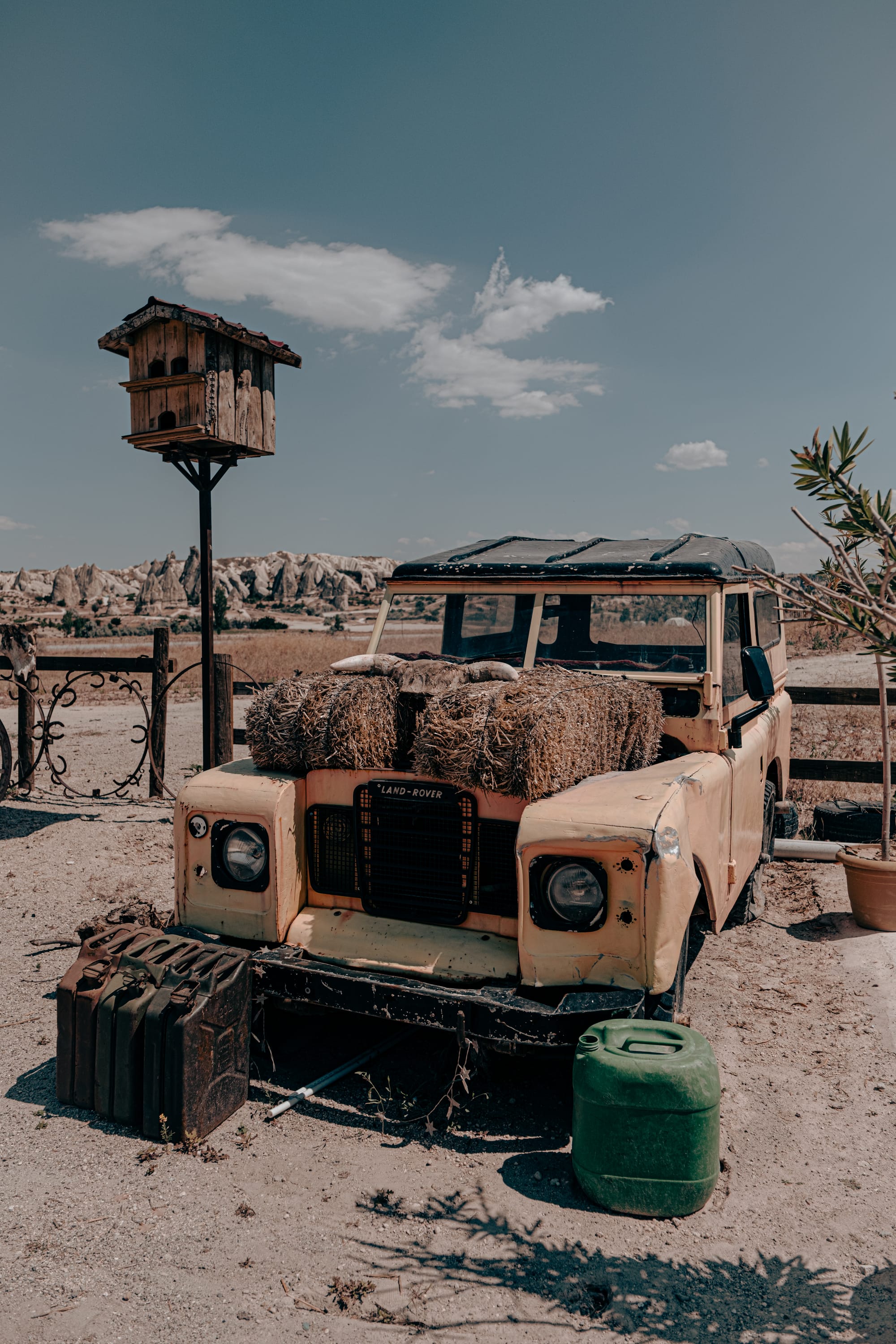 An old Land Rover sits parked near the entrance, its bed stacked high with bales of straw.