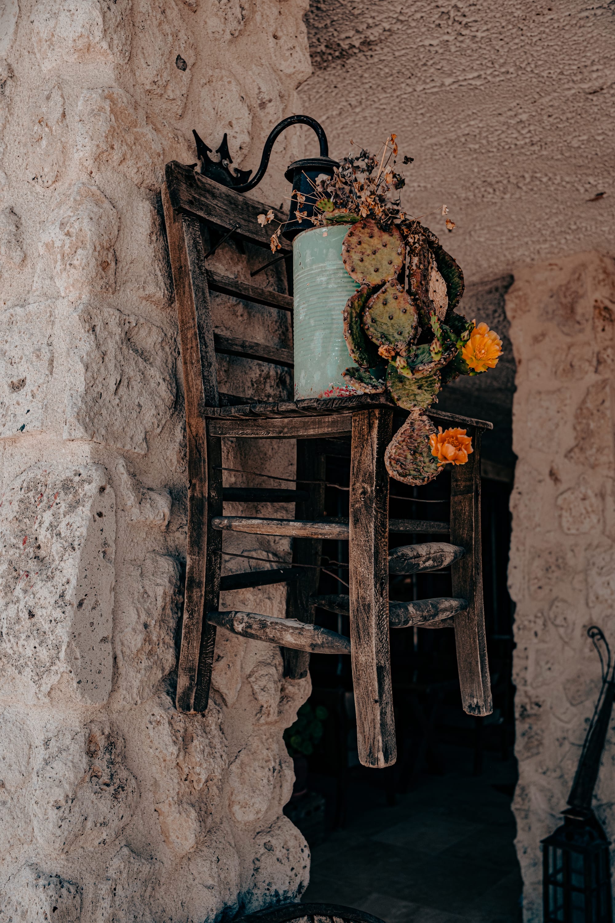 Rustic cactus displays in repurposed furniture at Moonlight Ranch