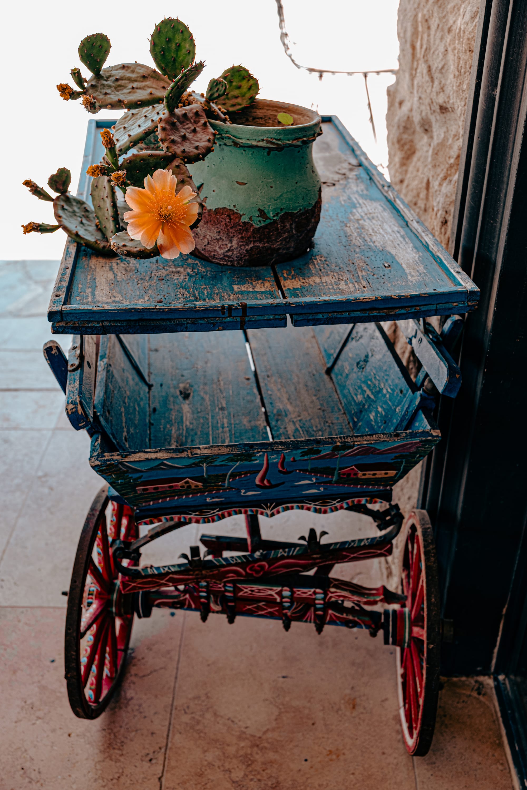 There are carts with bright flowers spilling over the edges, antique farming tools propped against stone walls, and spots where you can catch uninterrupted panoramas of the surrounding landscape.