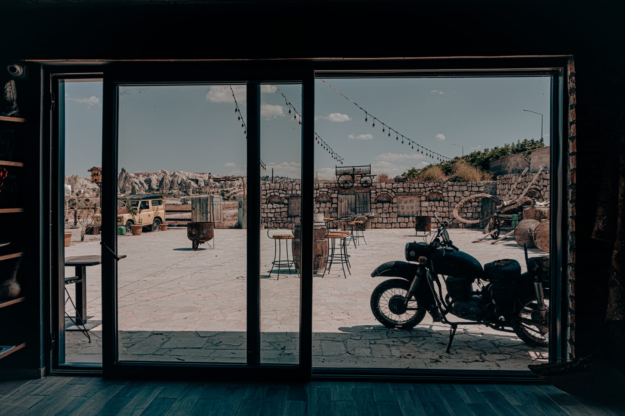 Vintage motorcycle and Land Rover at Moonlight Ranch with Cappadocia’s mountains in the backdrop