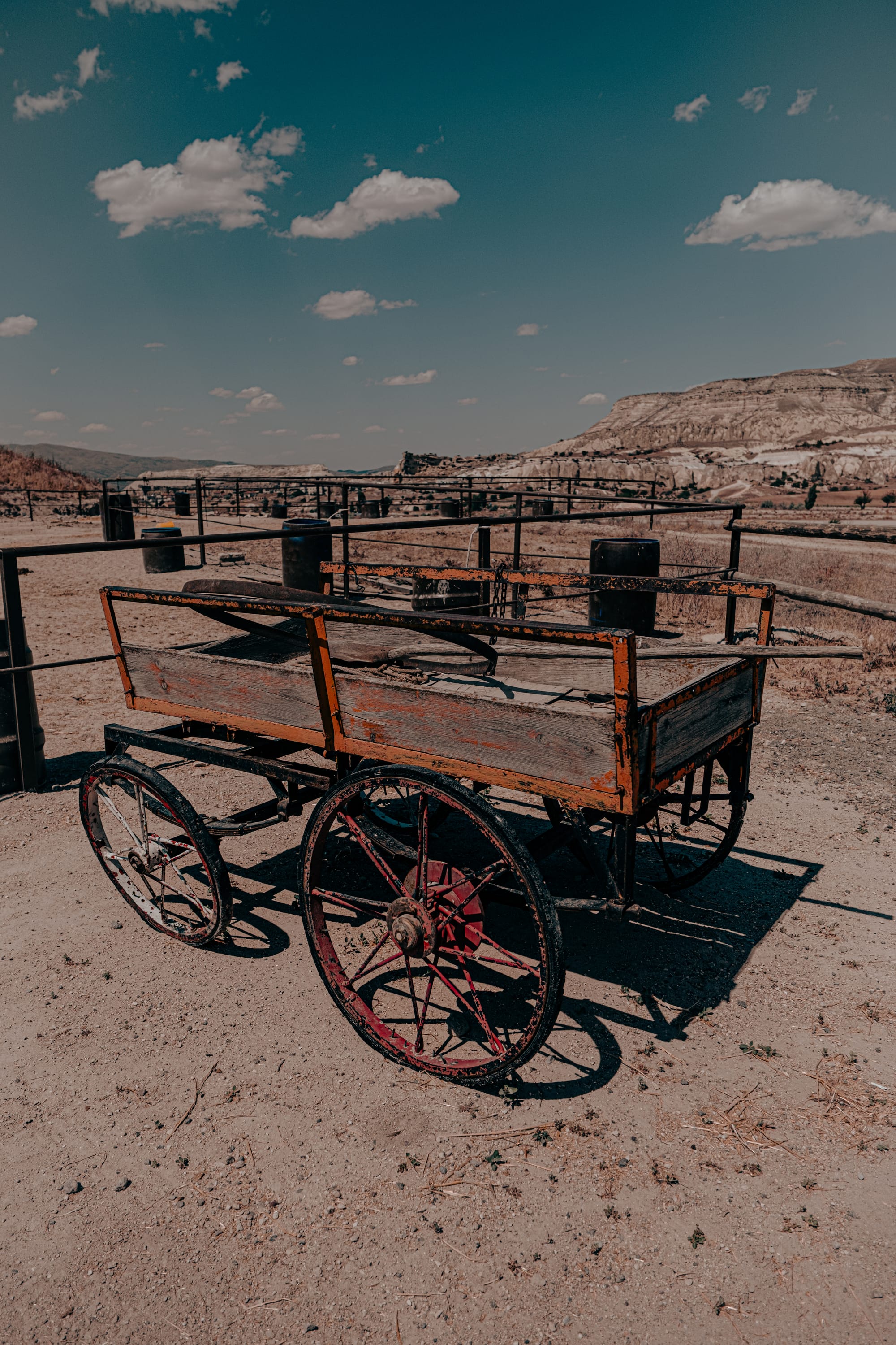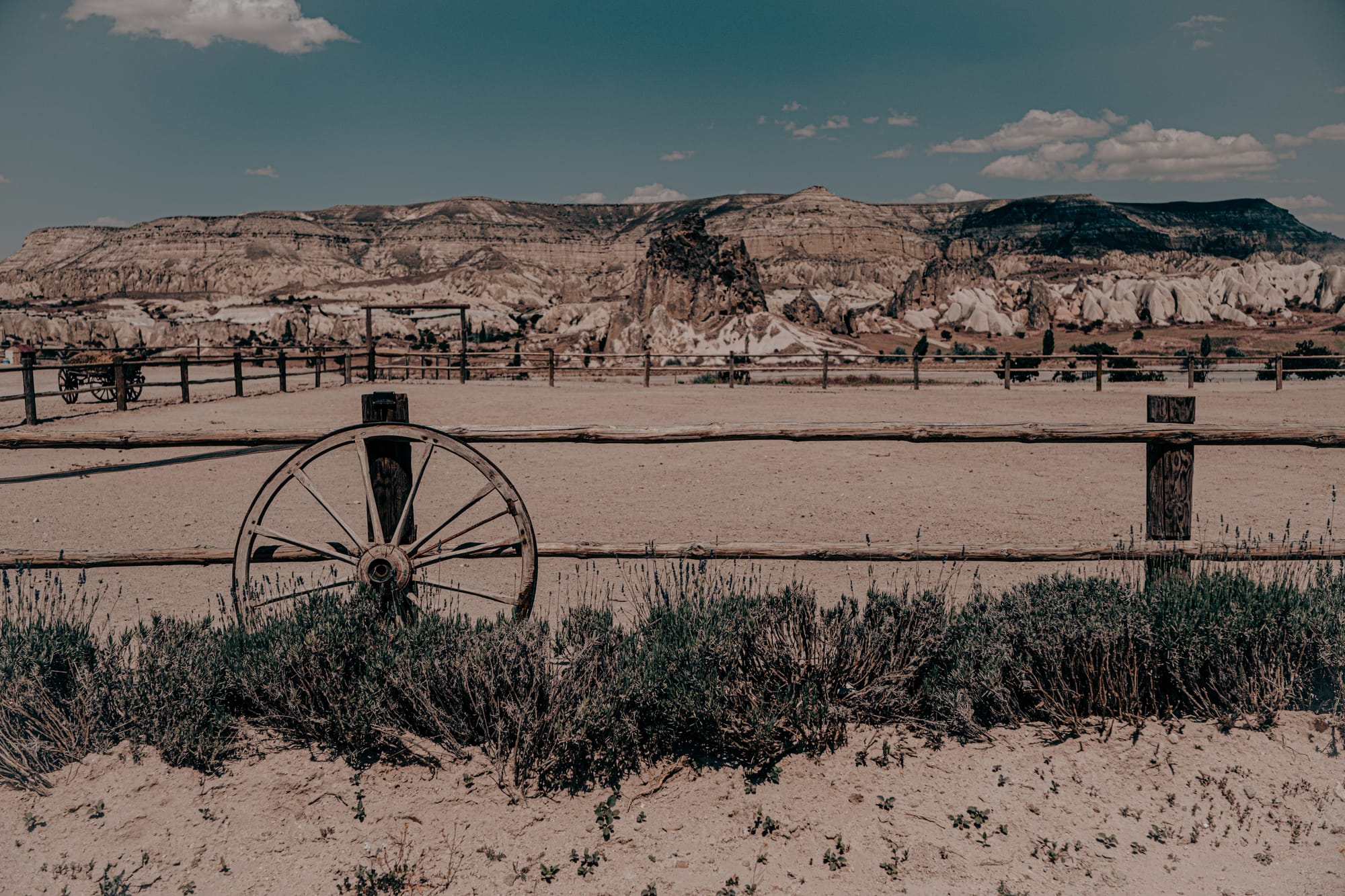 Wagon wheels lean against fences with the distant fairy chimneys in view.