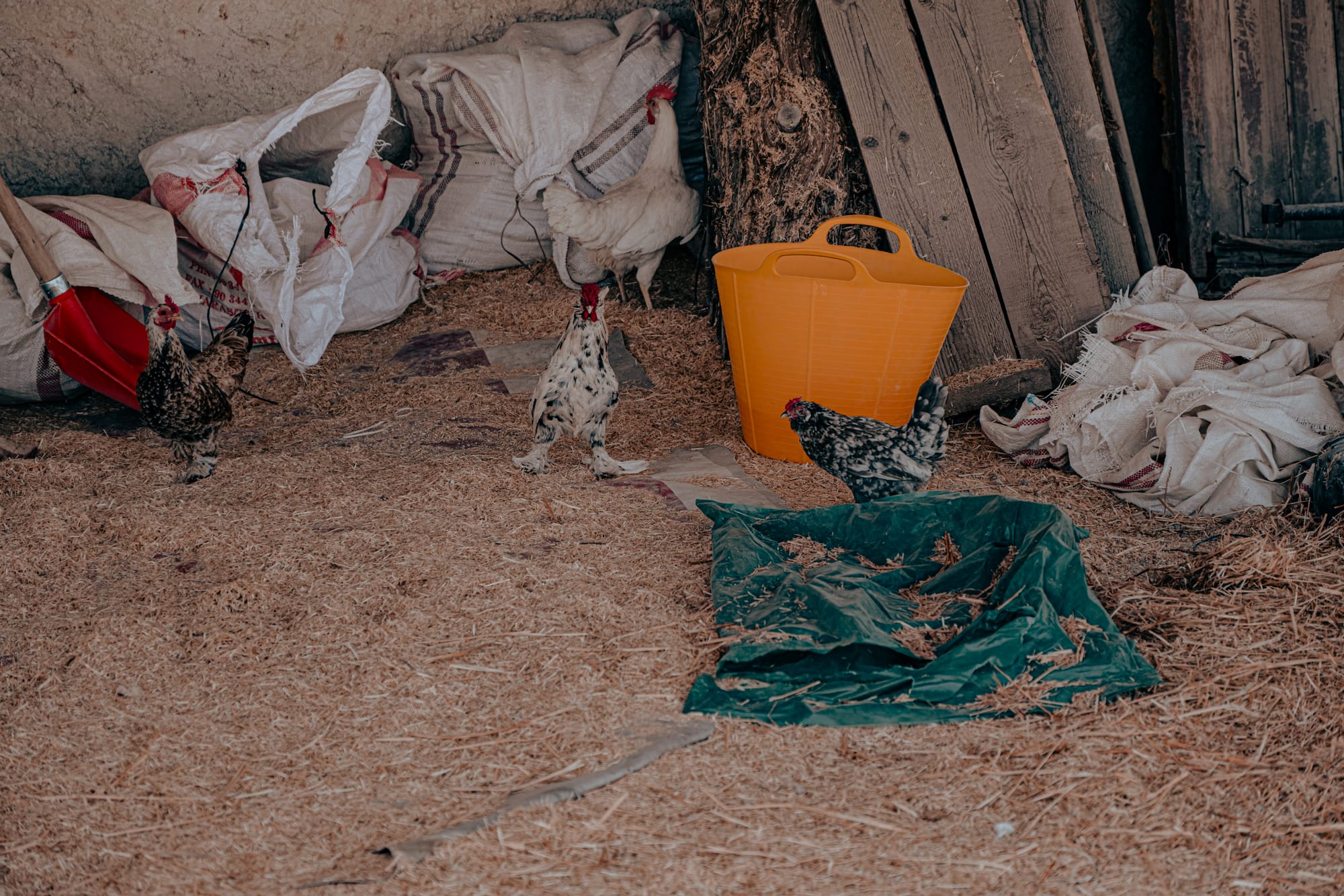 Rustic wooden cart and chickens in the barn at Moonlight Ranch