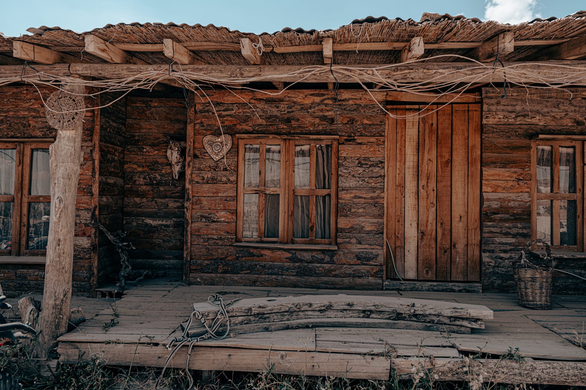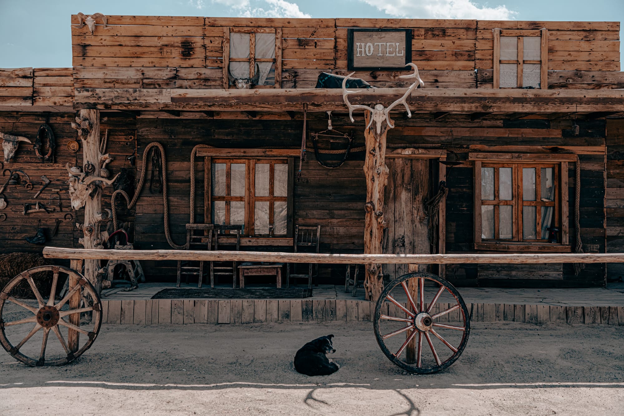From the outside, it’s striking enough to make you pause—the kind of place that stops you mid-journey, prompting you to turn the car around. Its wooden facades and weathered beams rise in front of a backdrop of pale mountains, instantly evoking the atmosphere of an old western town.