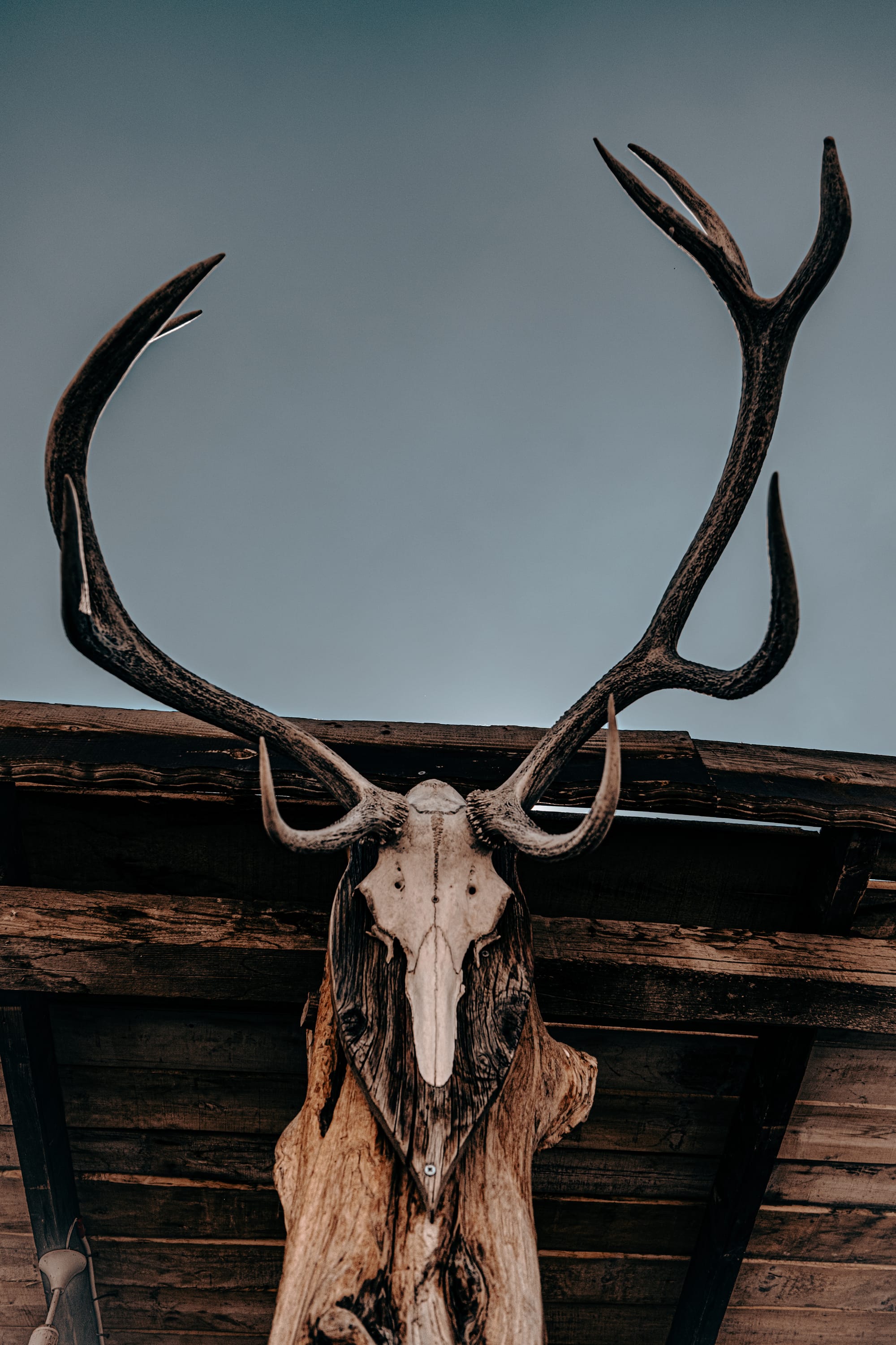 Decorative skulls with wide antlers are mounted high against the sky, silhouetted in the afternoon light.
