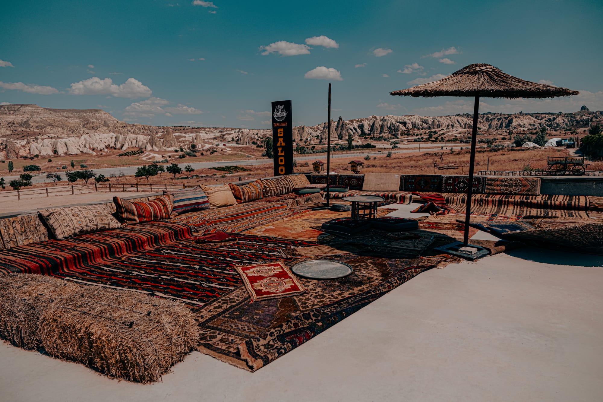 Outdoor seating and rustic courtyard at Moonlight Ranch with sweeping Cappadocia mountain views