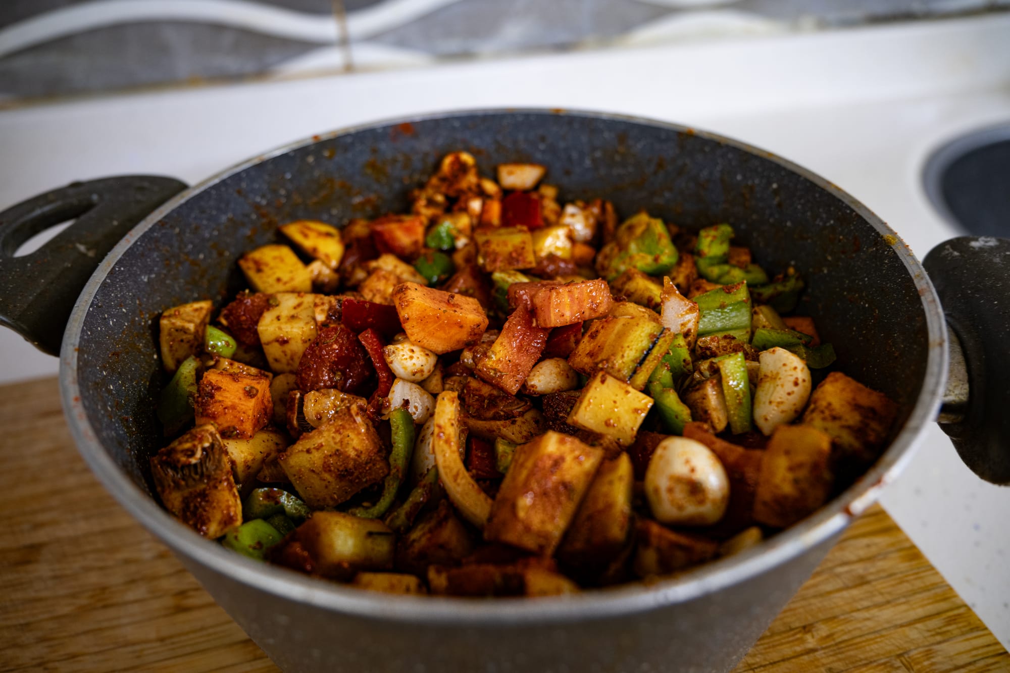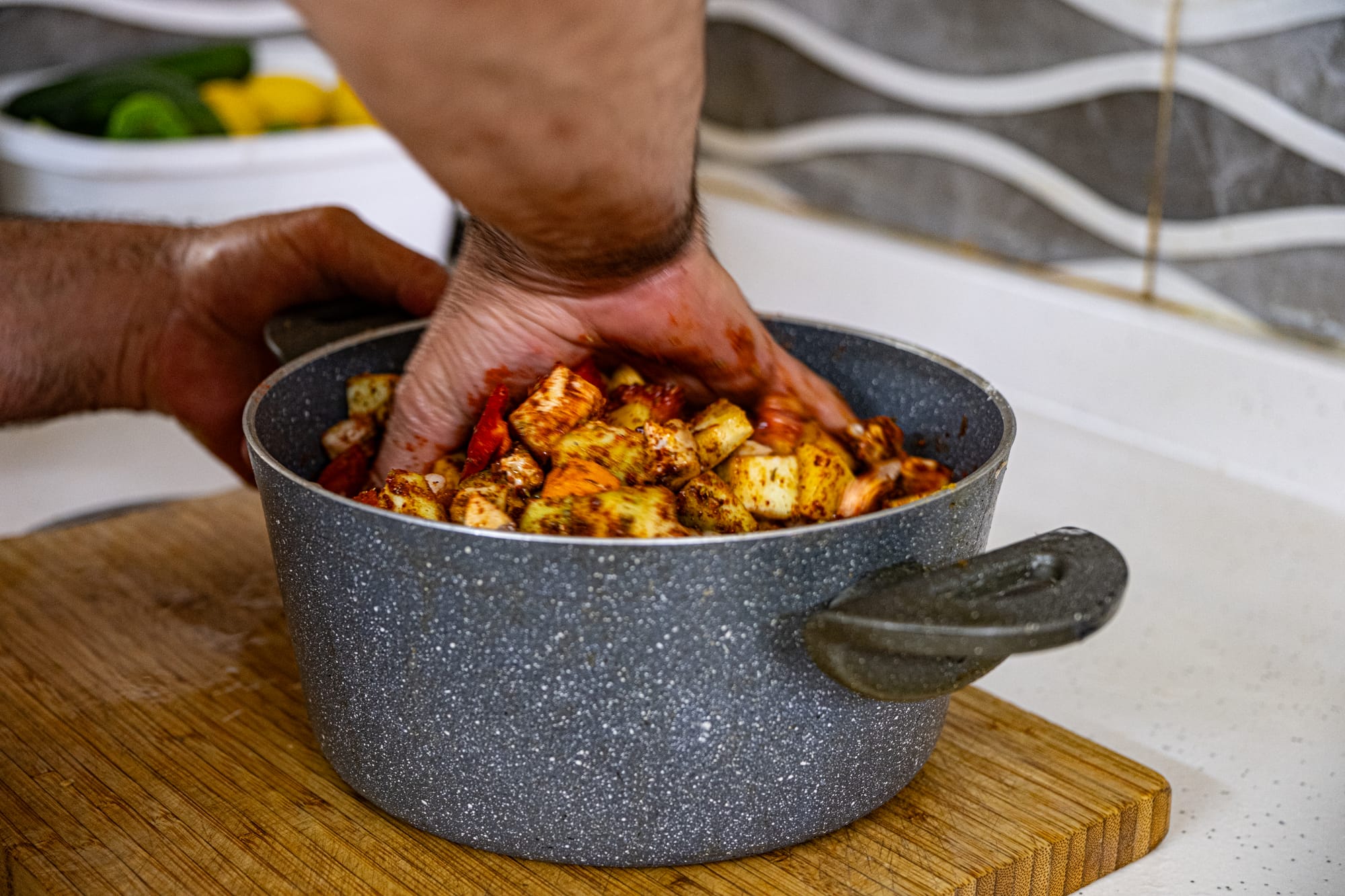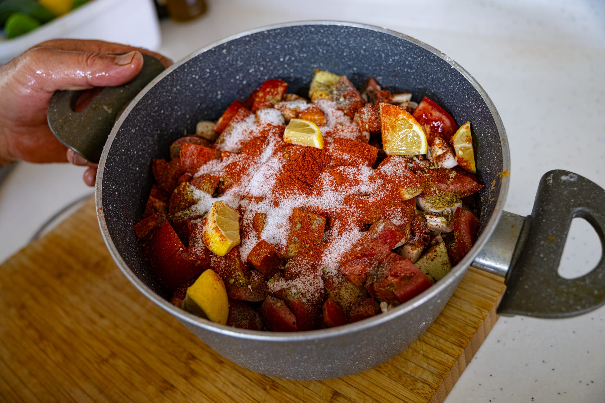 In the kitchen, he began by chopping a generous selection of vegetables—tomatoes, peppers, carrots, potatoes—layering them with whole cloves of garlic, fresh lemon wedges, and a scattering of spices. Paprika dusted the top like a red veil; salt and herbs mingled in the folds. He mixed everything by hand, pressing the flavors into the vegetables so the juices would form a natural marinade.