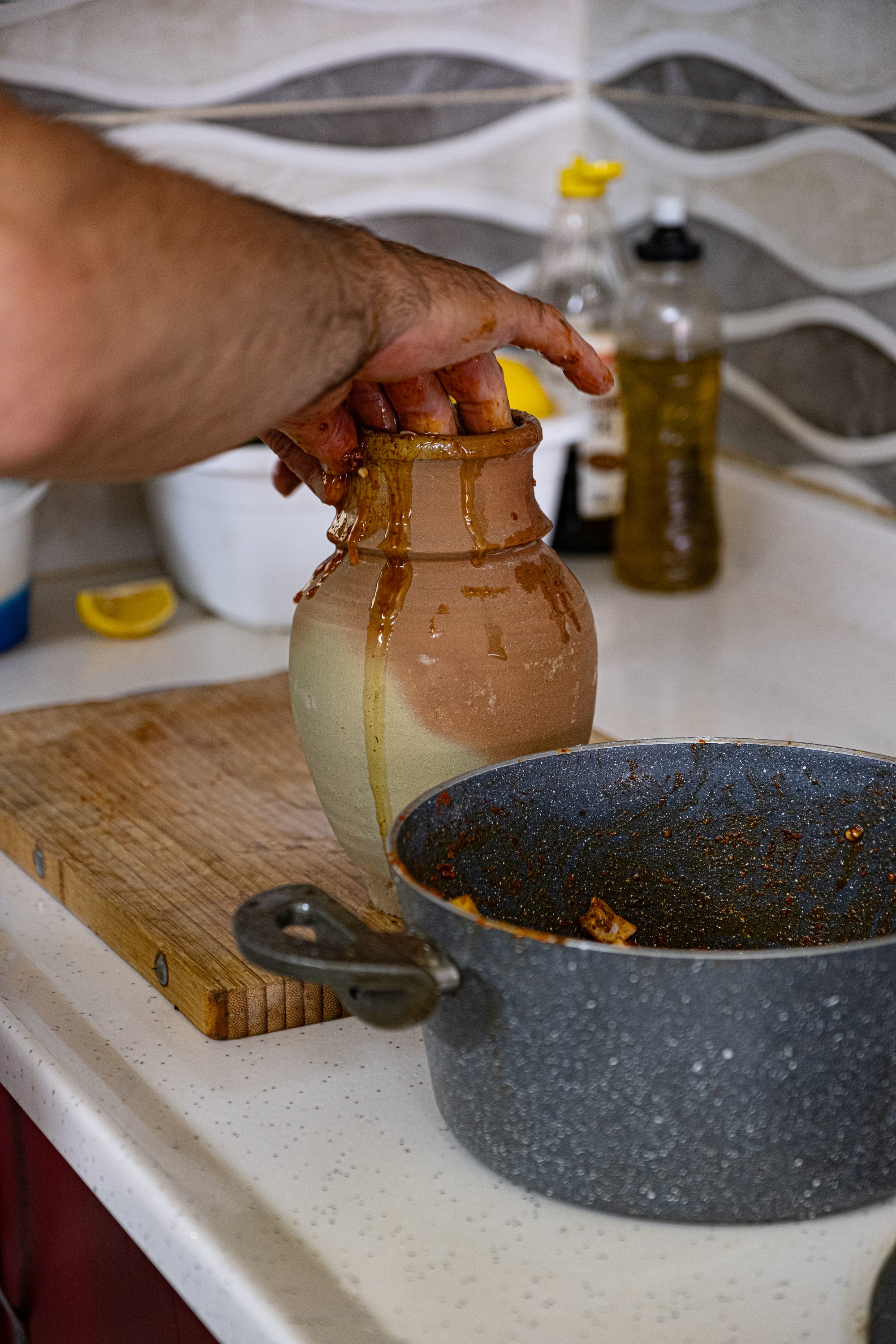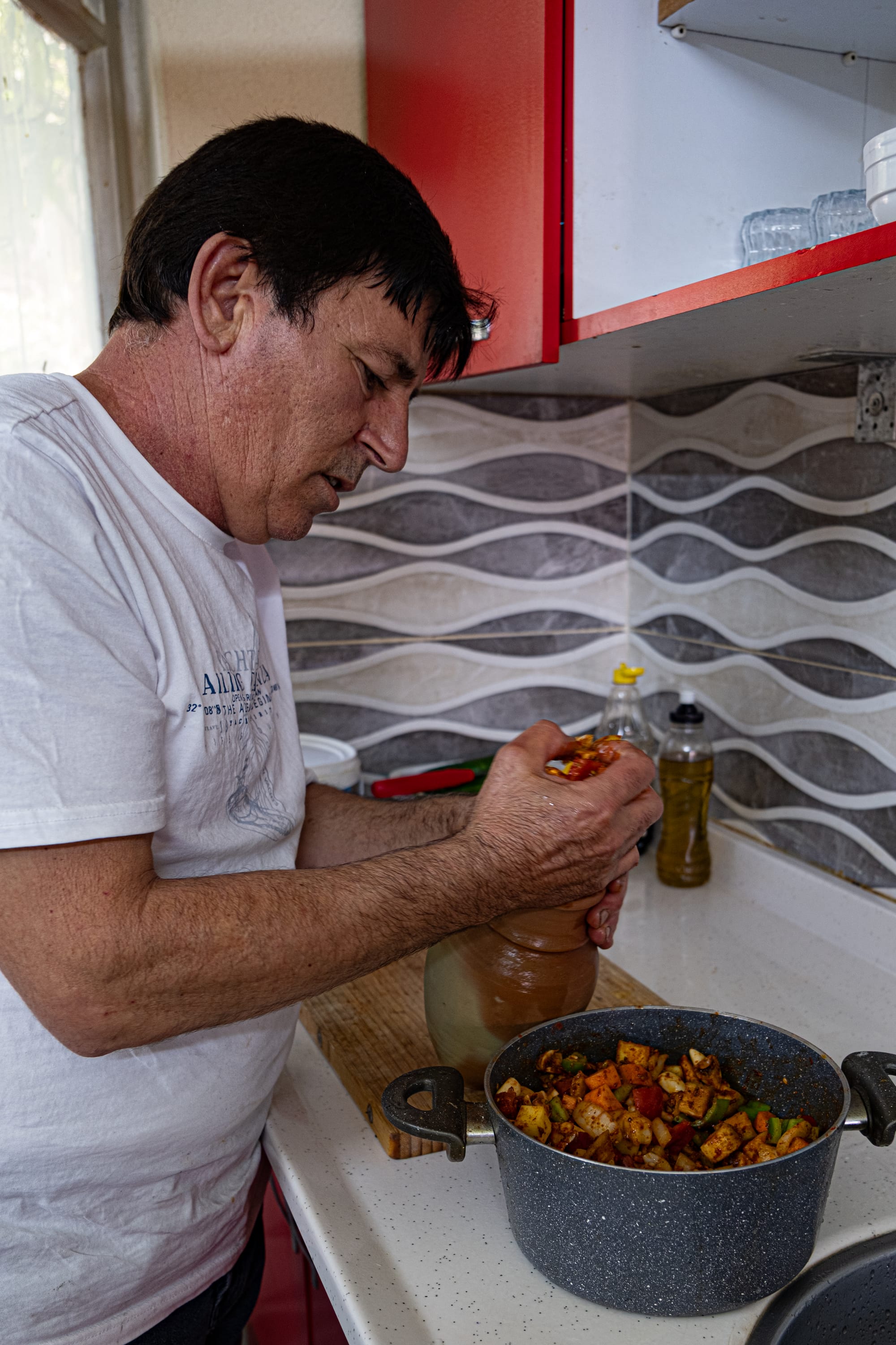 Bayram prepares the vegan clay pot by hand, layering fresh vegetables, garlic, lemon, and spices into a rich, colorful mix