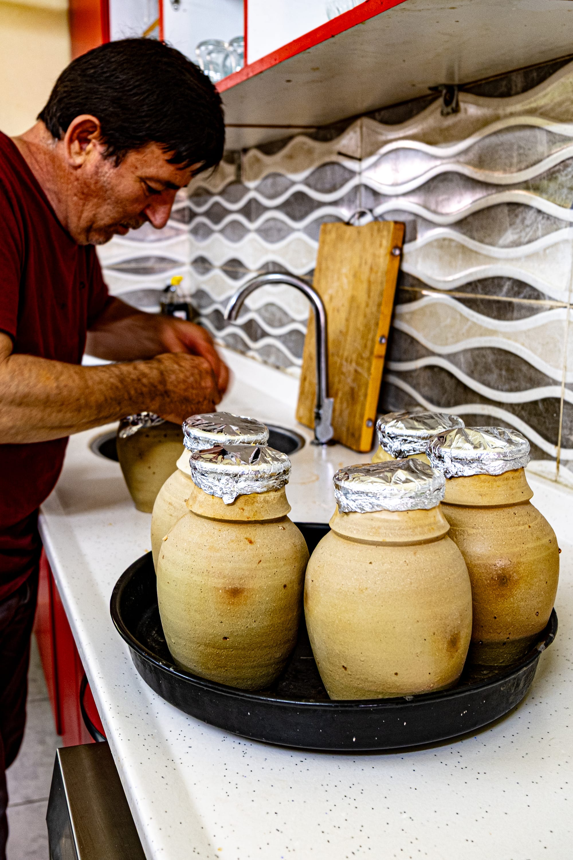 Next came the pots themselves—beautiful, rounded vessels sourced from Avanos Pottery Village, where generations have shaped clay from the Kızılırmak River into both art and everyday tools. Bayram filled each one to the brim with the vegetable mixture, then sealed the mouth with foil to trap every drop of steam and flavor.